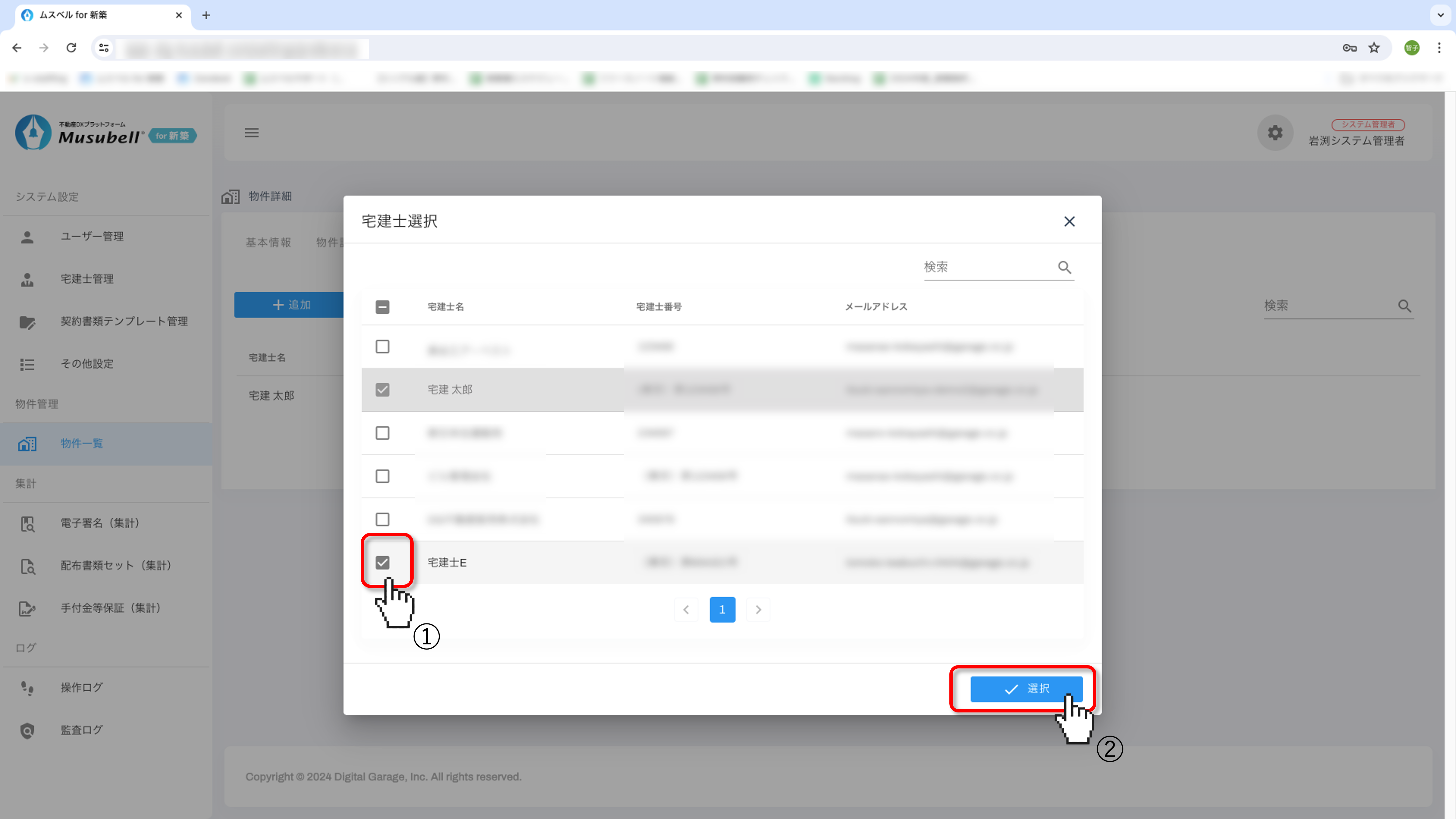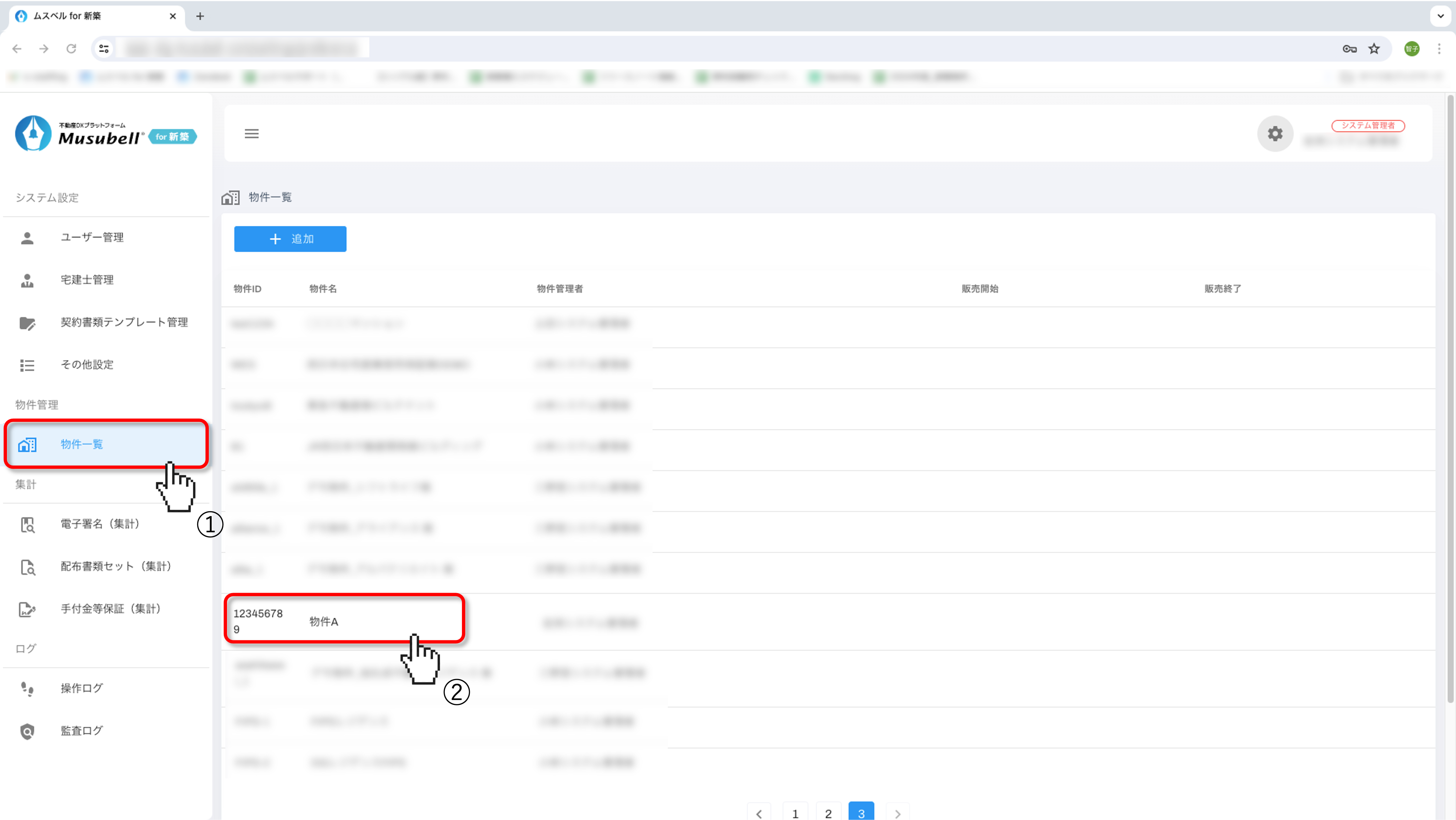 ①メニューバーの「物件一覧」をクリックし、②宅建士を追加したい物件を選択します。