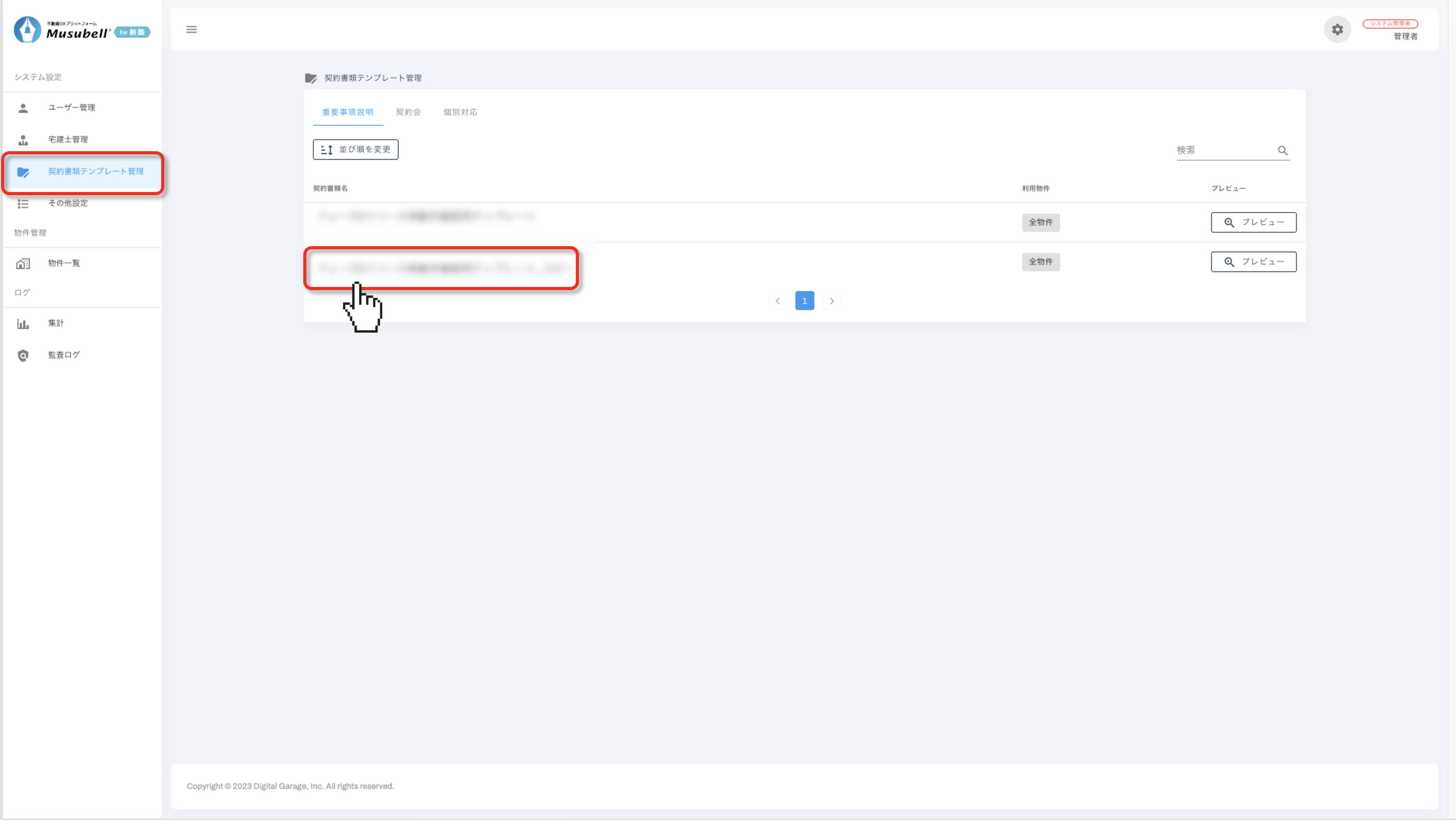「設定」>「契約書類テンプレート管理」から、対象のテンプレートをクリックします。