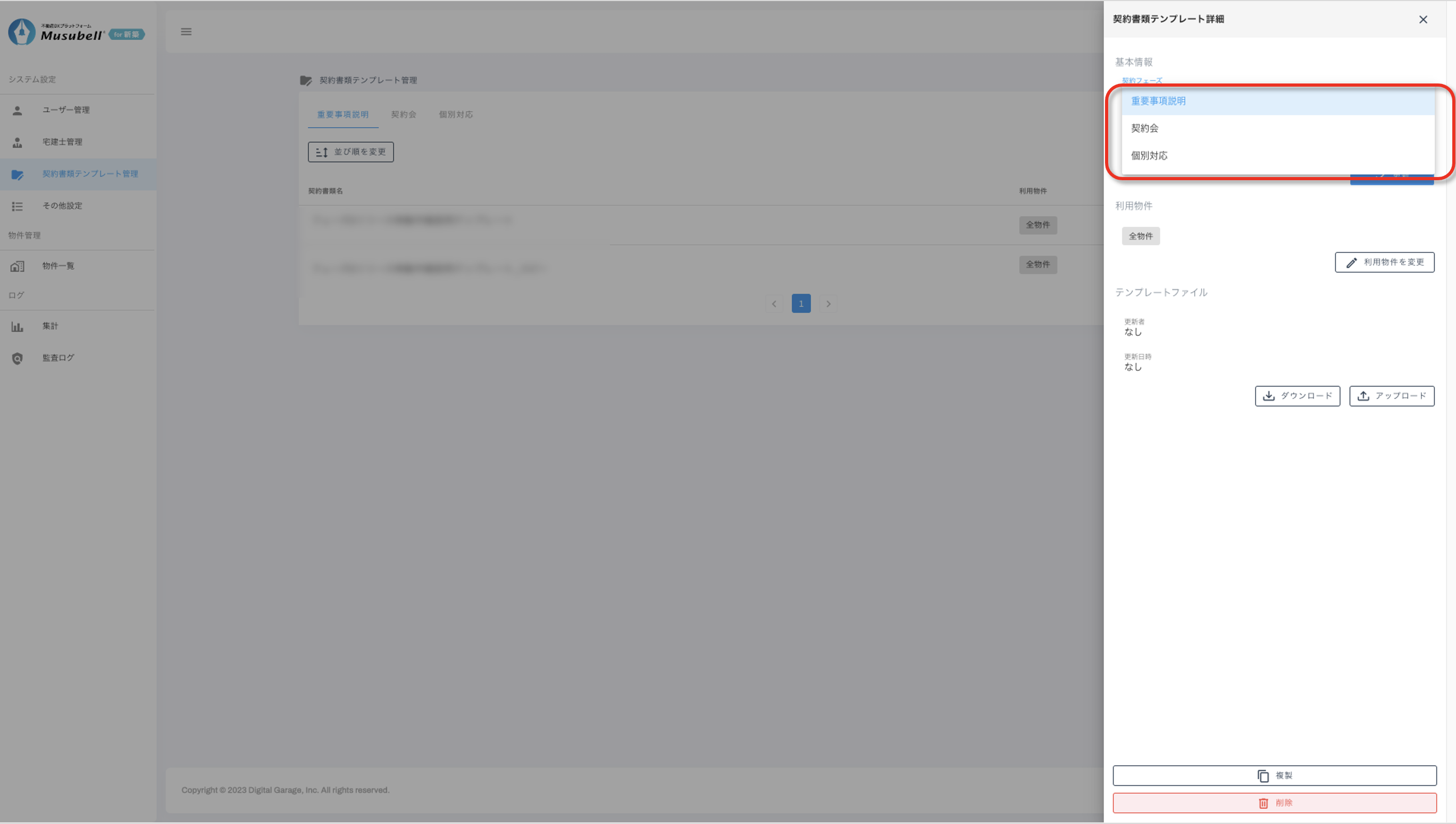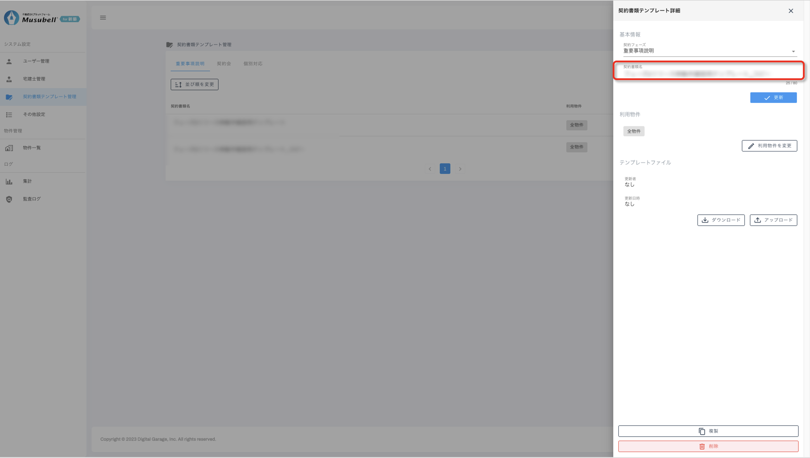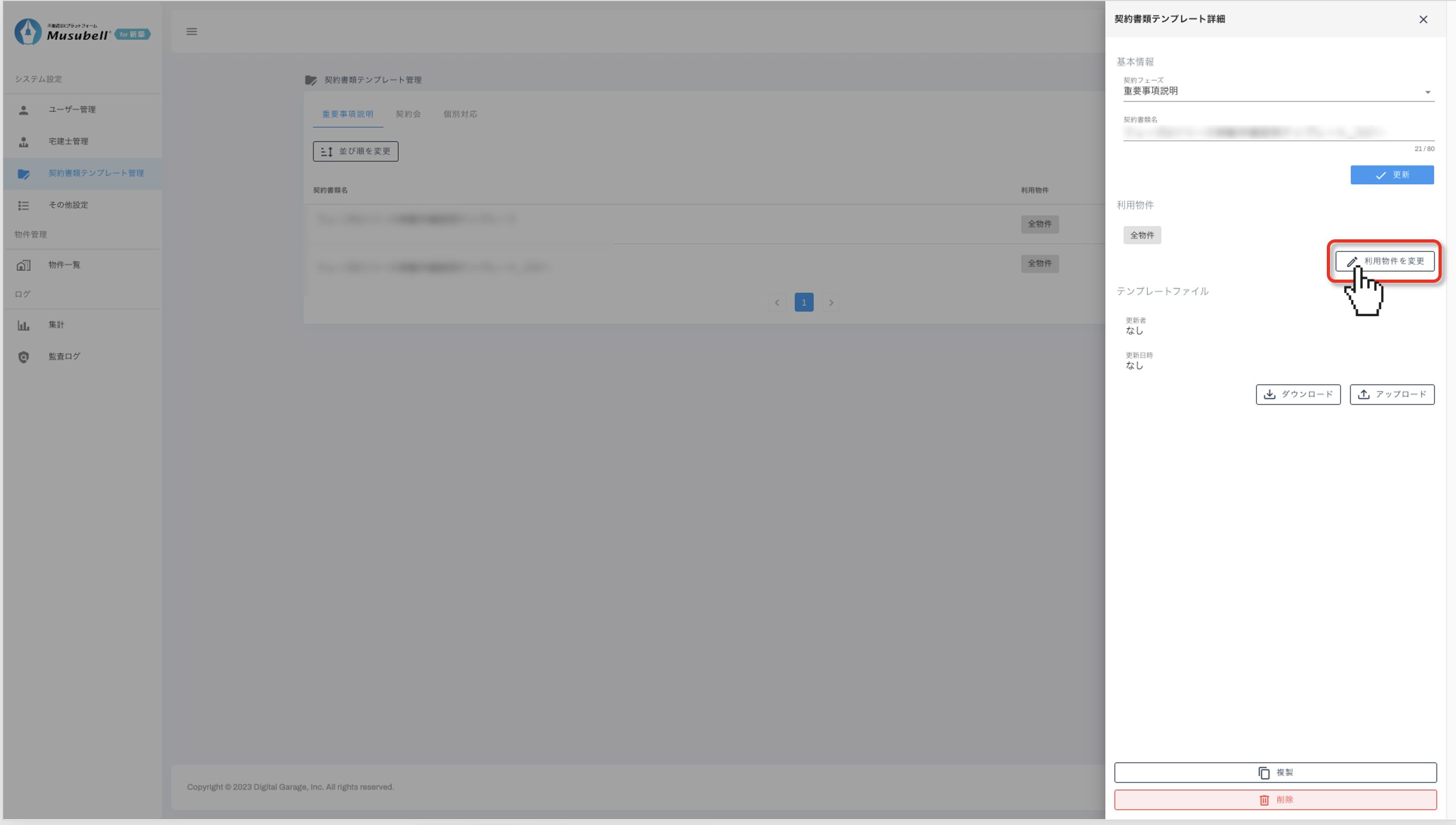 契約書類テンプレートの名称変更、並び替え、および利用物件の設定手順をご案内します。