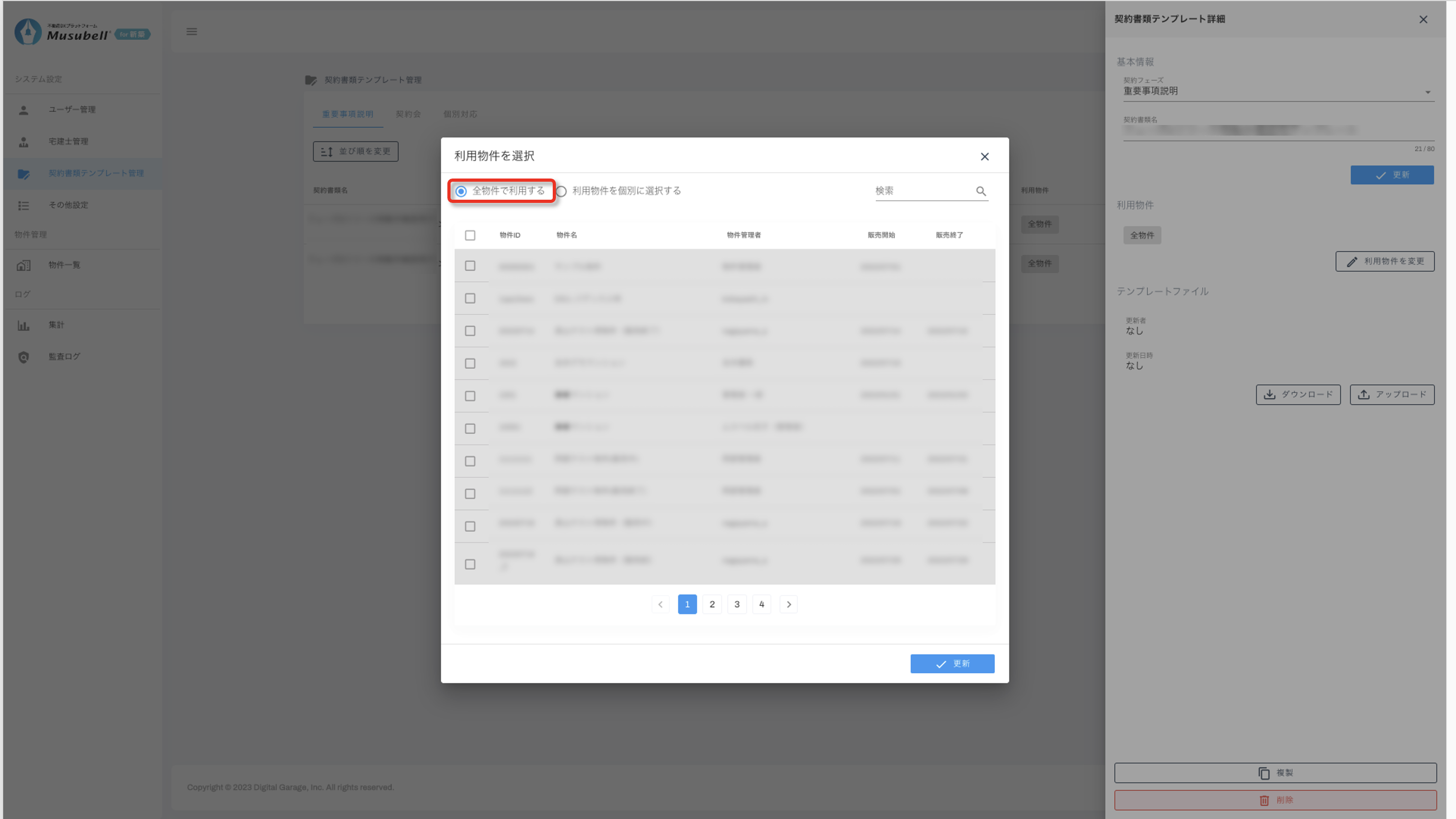 「全物件で利用する」または「利用物件を個別に選択する」のどちらかを選び、物件にチェックを入れます。
