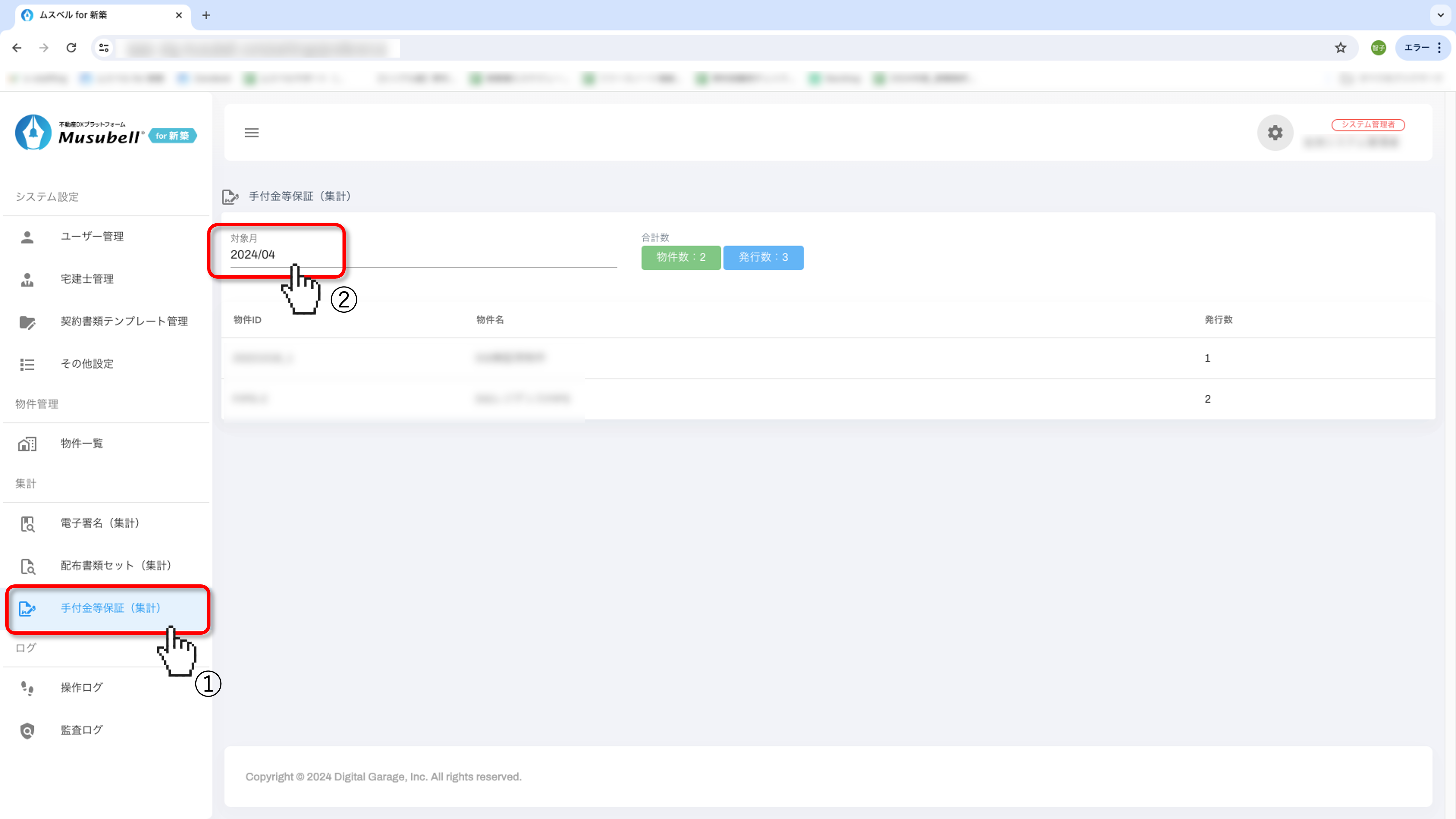 Musubell上で発行された手付金等保証証書の件数を、月ごとに集計して確認することができます。