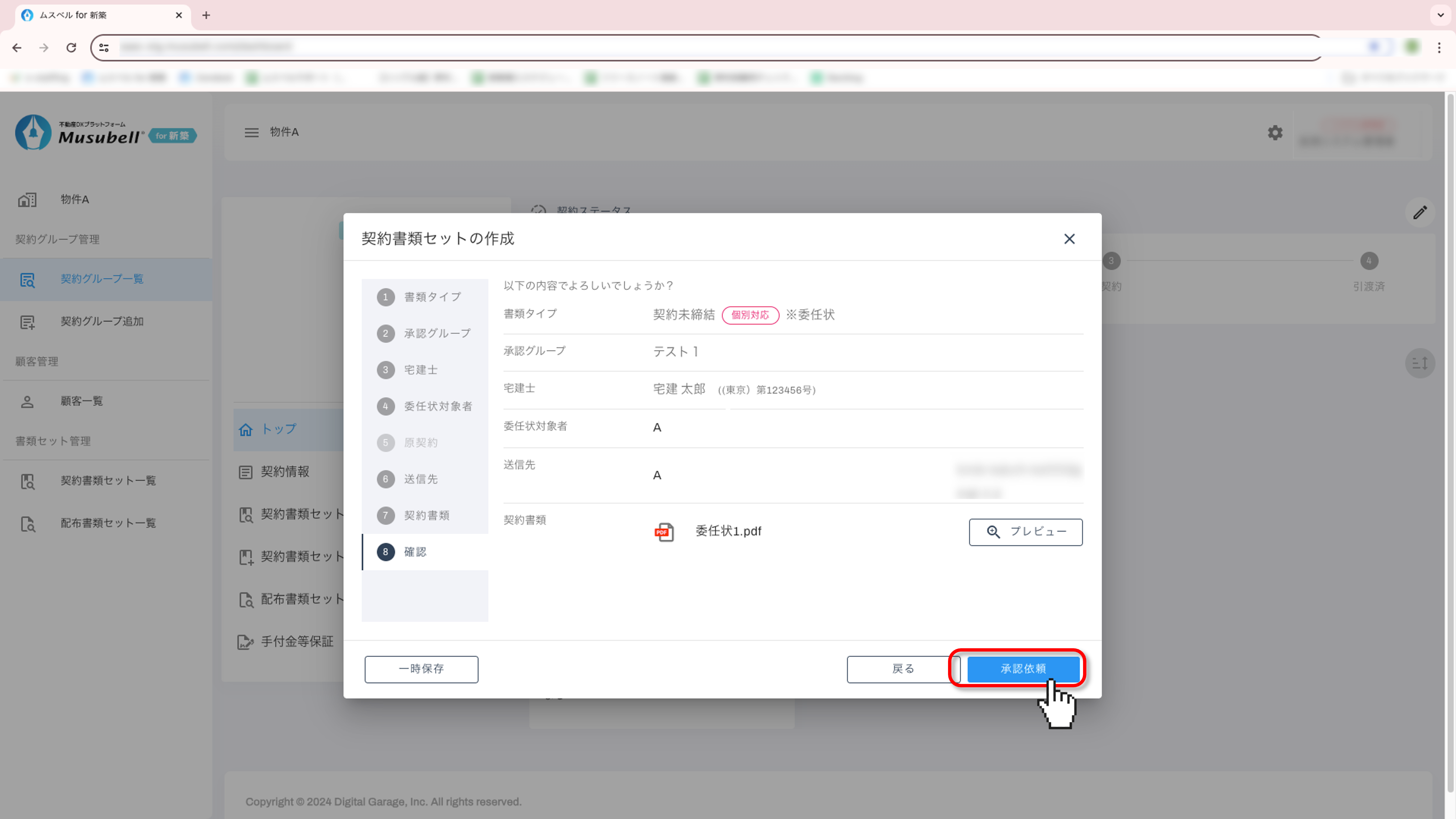 [委任状]タブから[委任状作成]をクリックし、承認依頼を出します。