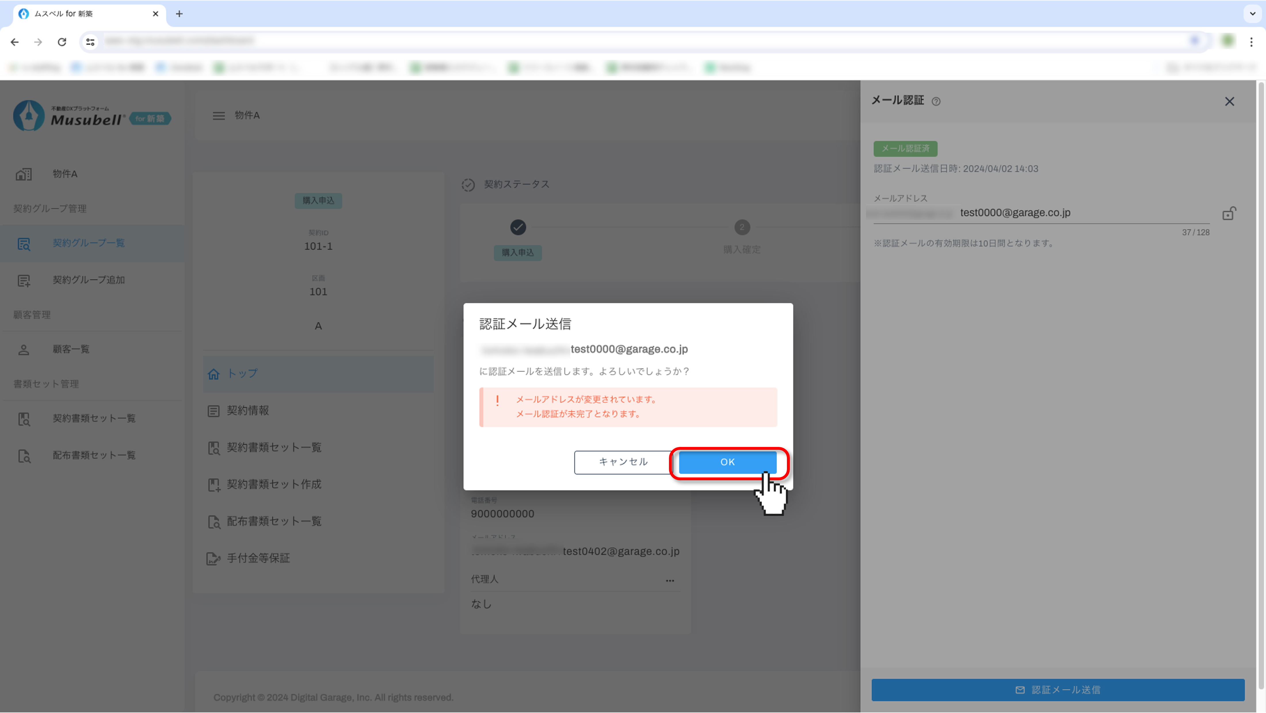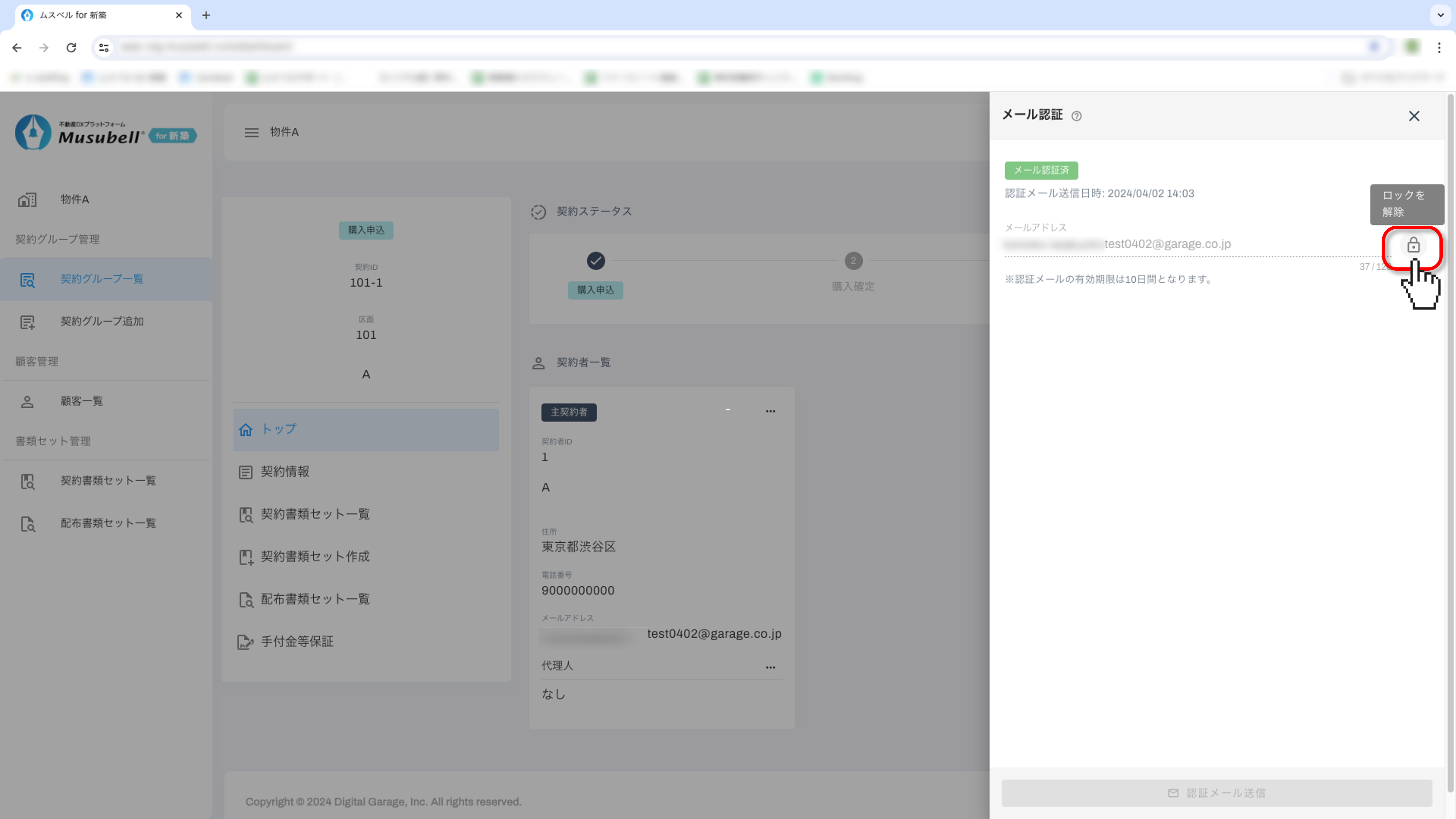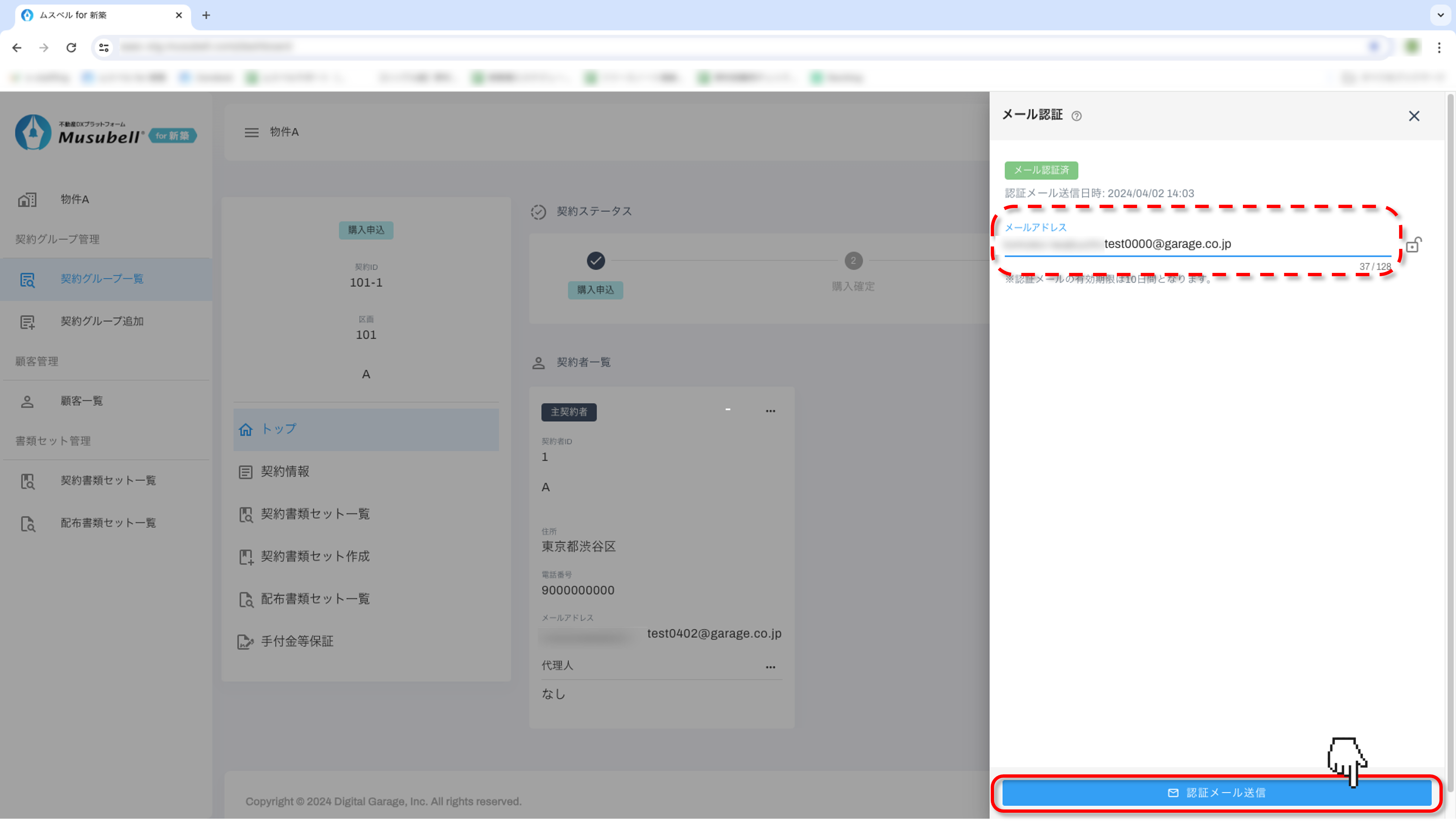 「トップ」の契約者詳細の右上にある「…」をクリックして、「メール認証」を選択します。
