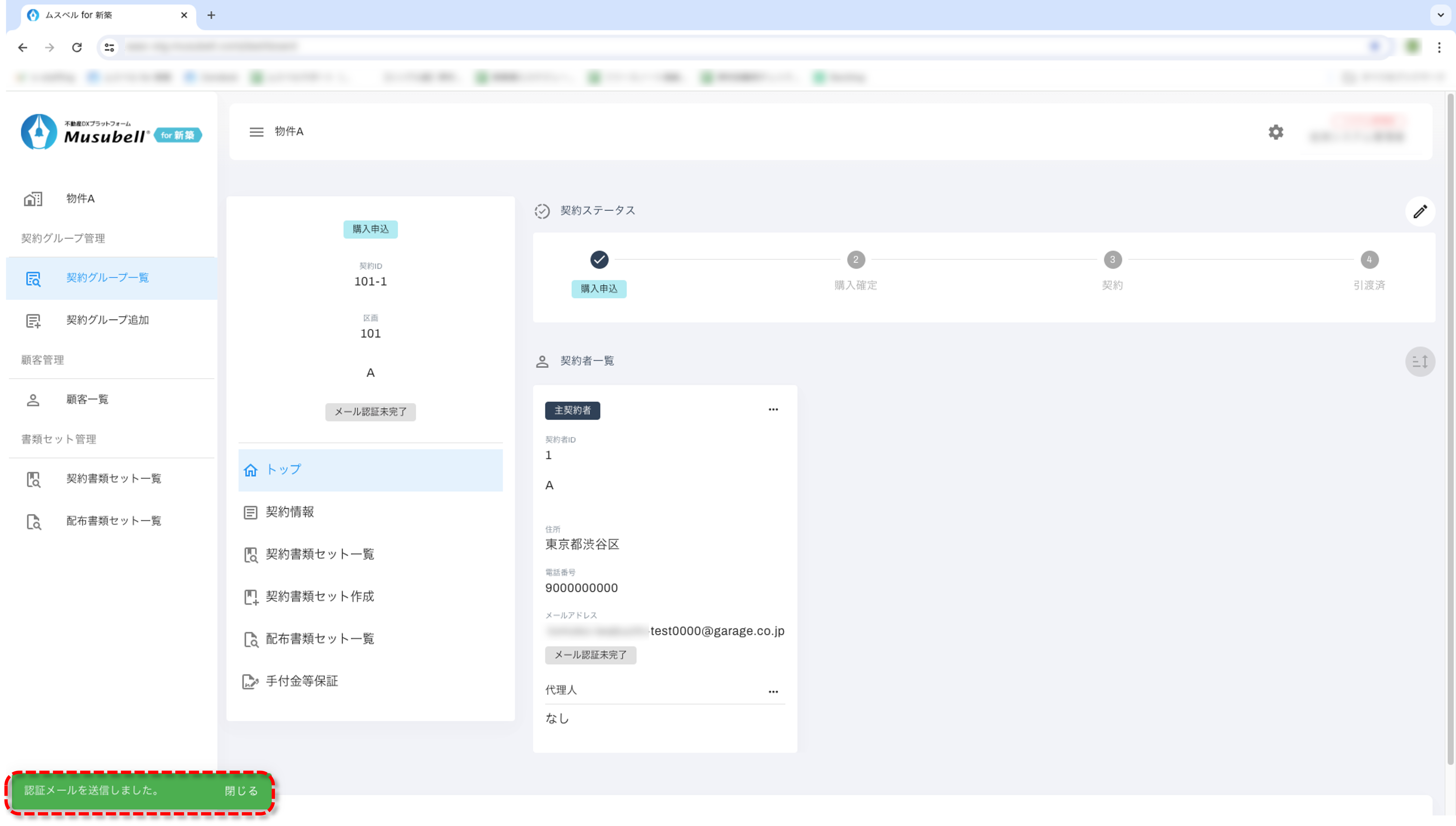 画面左下に「認証メールを送信しました」とメッセージが表示されます。