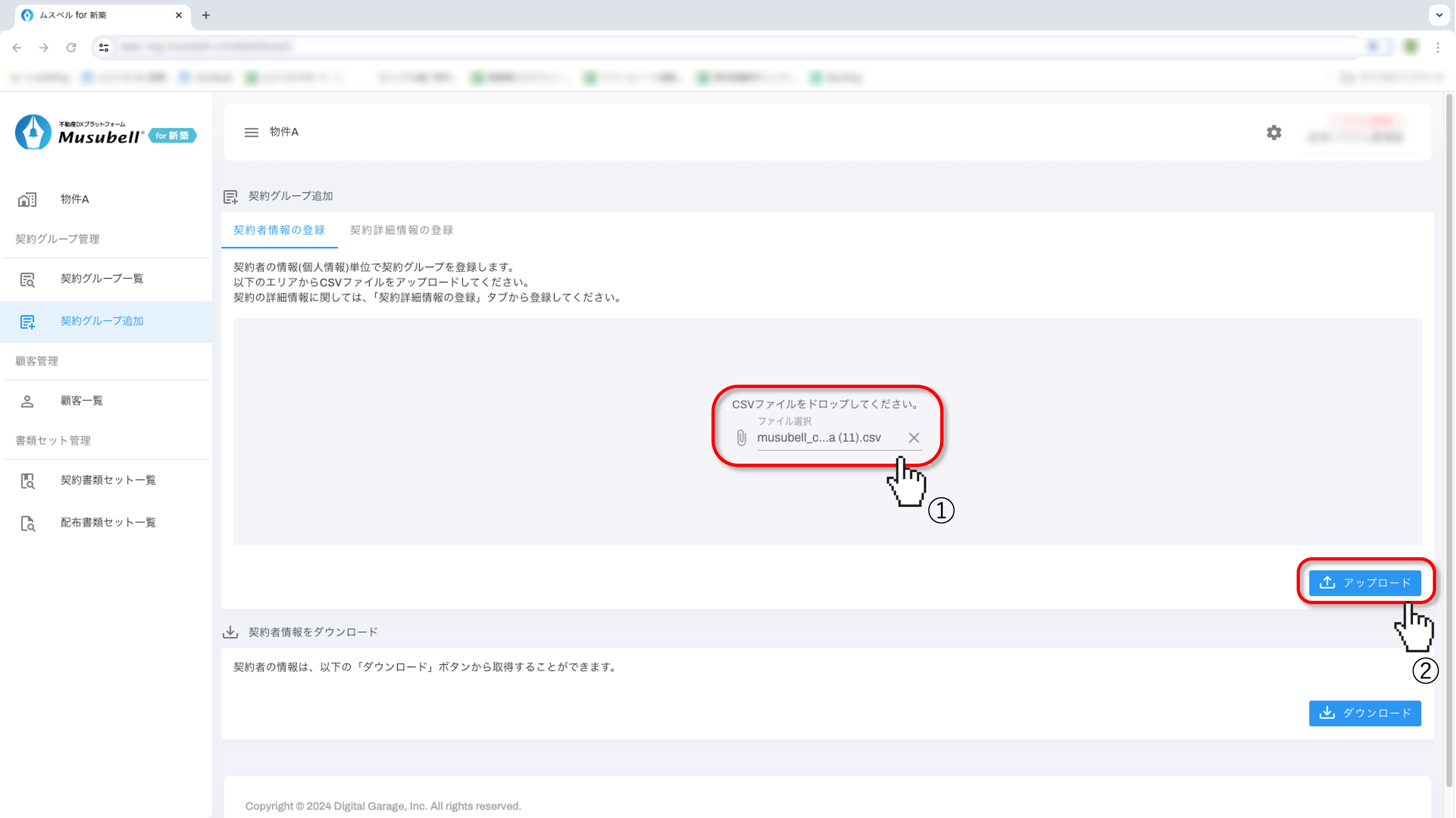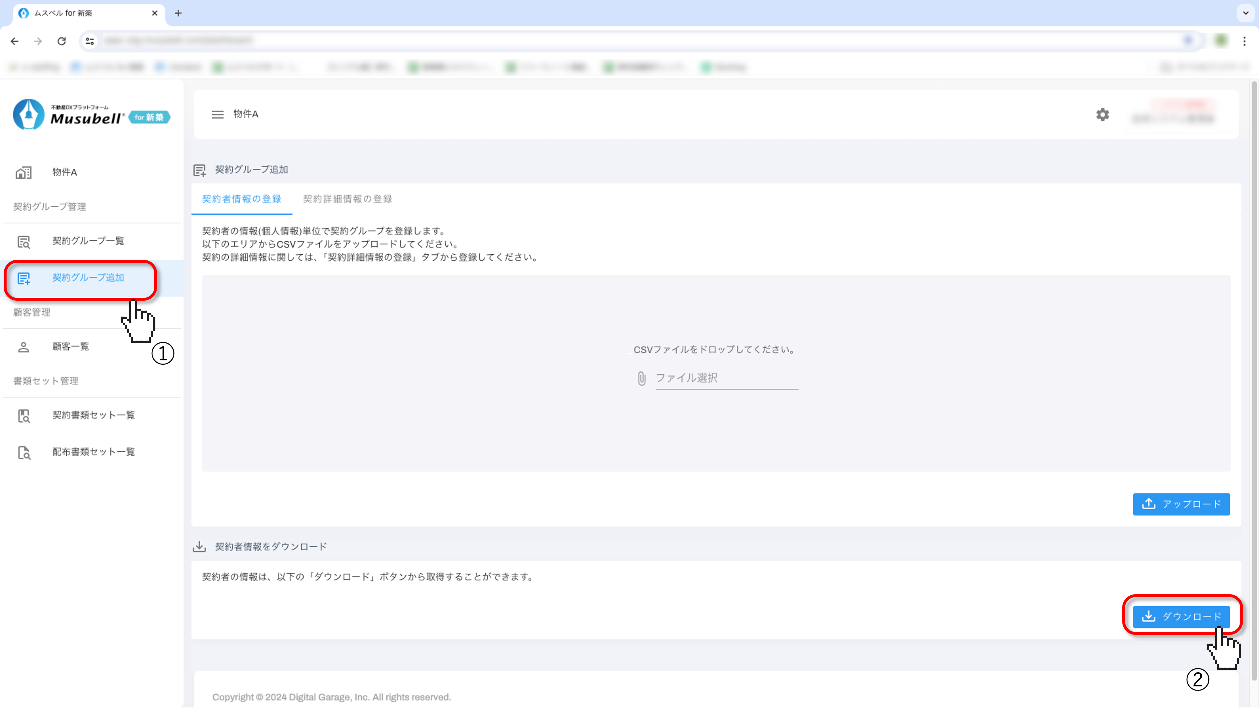 トップ画面から物件を選択し、「契約者グループ追加」よりCSVをダウンロードします。
