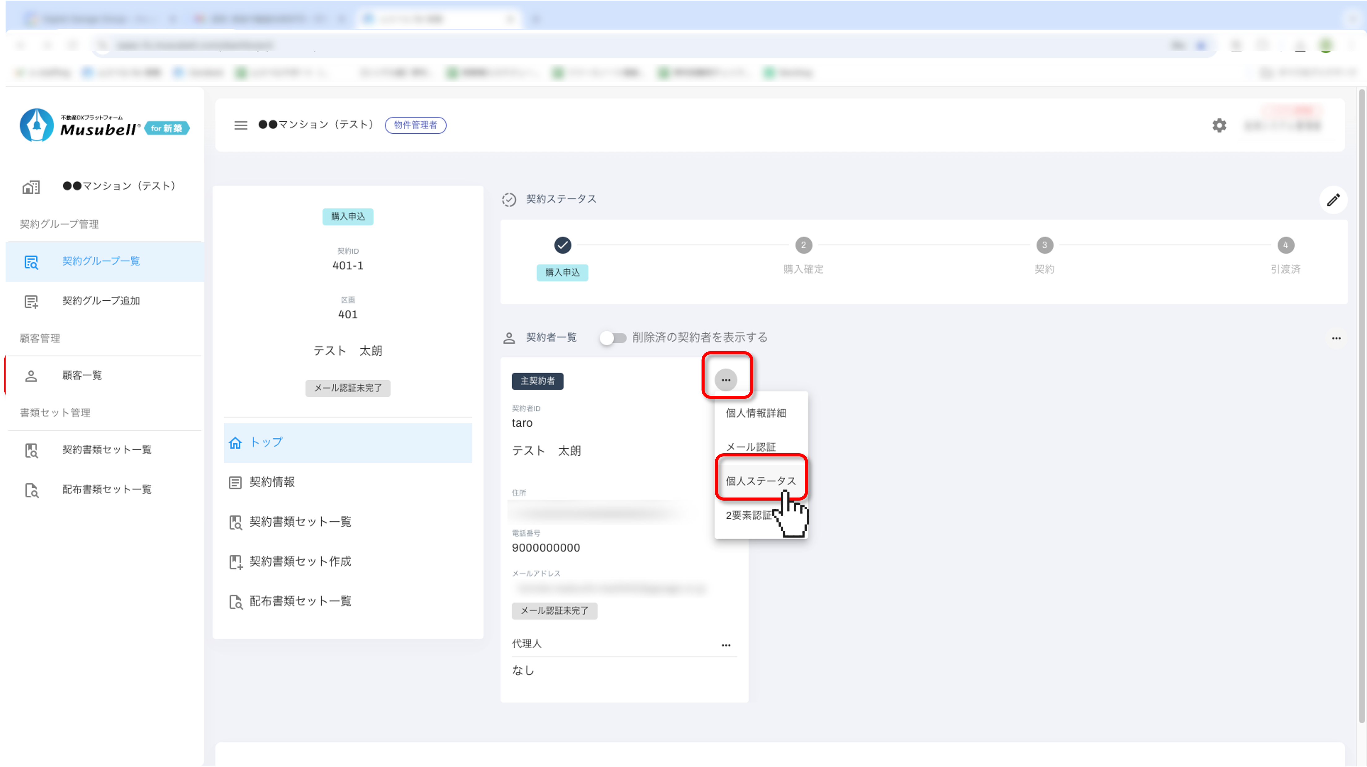 契約者欄の右上にある「…」をクリックし、「個人ステータス」を選択します。