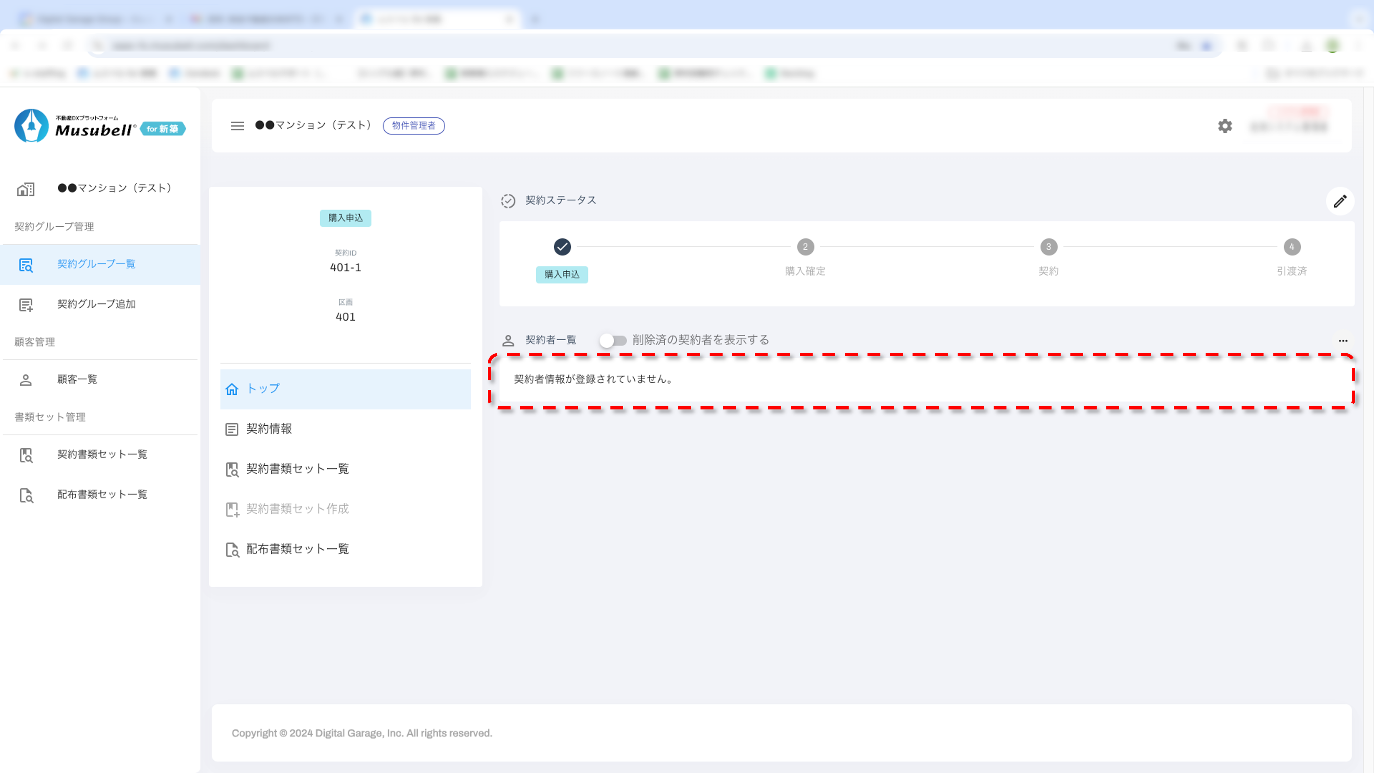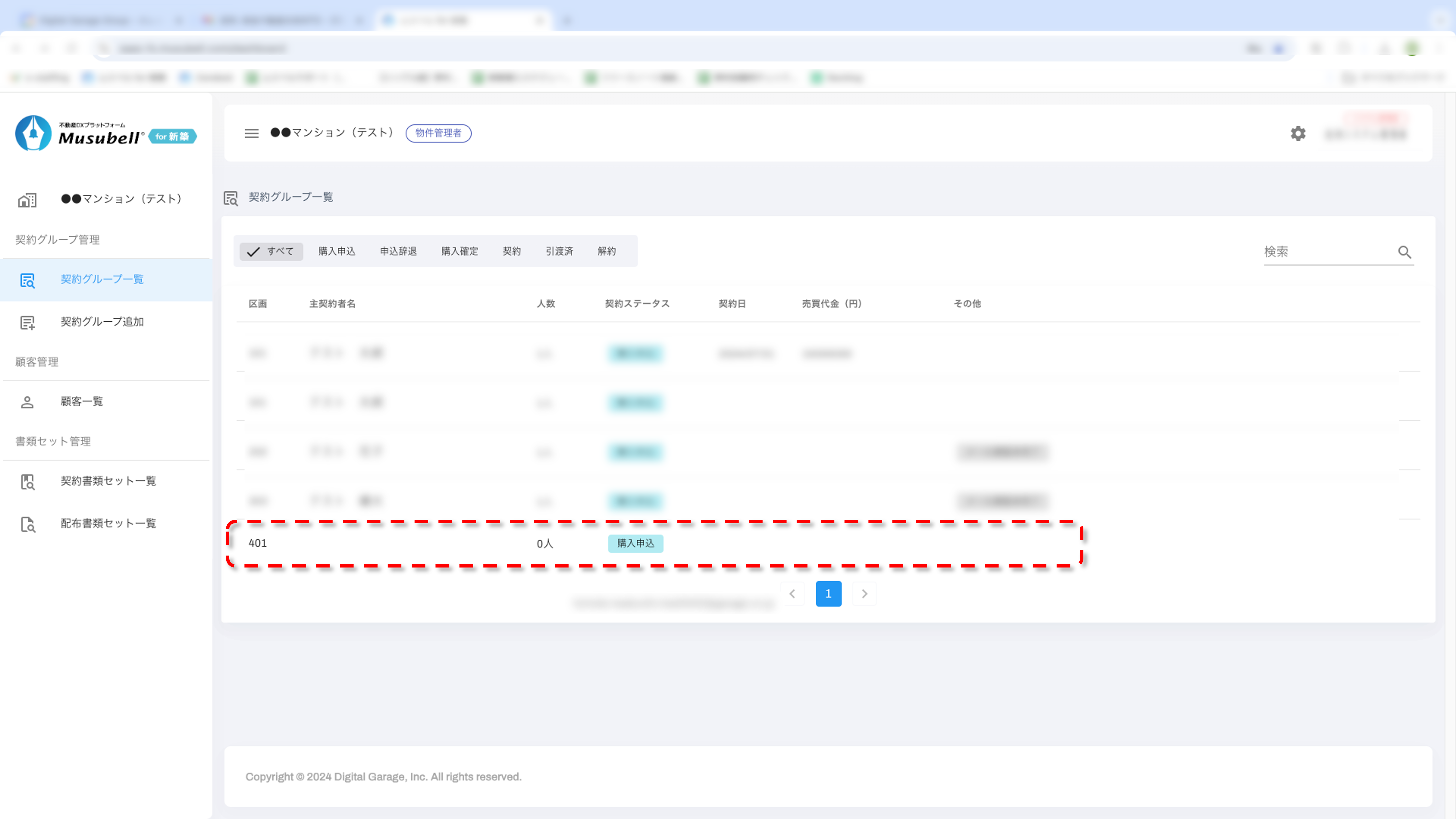 ①「契約グループ一覧」をクリックし、②該当する区画・契約者を選択します。
