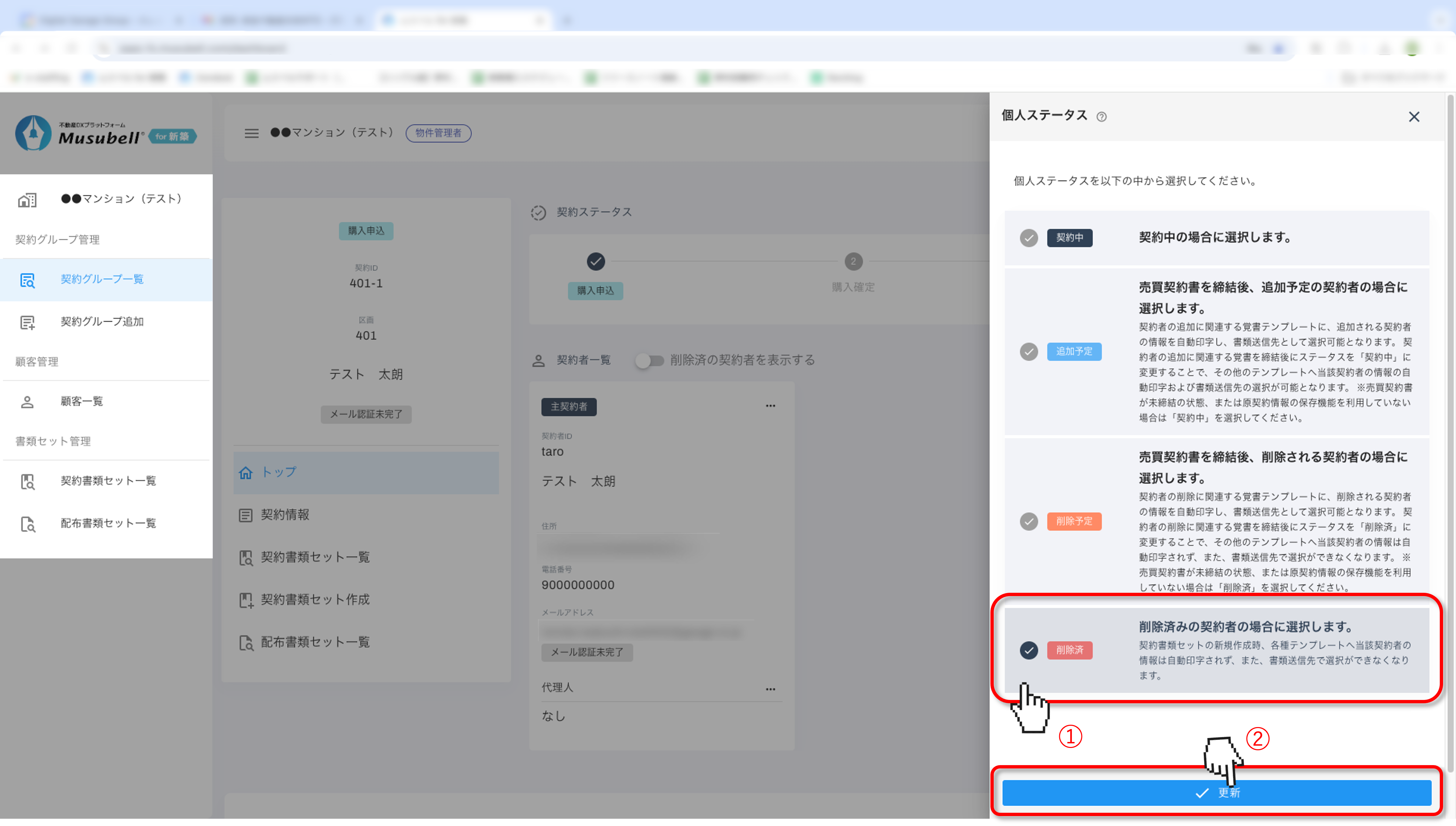 ①「削除済」ステータスを選択し、②「更新」をクリックします。