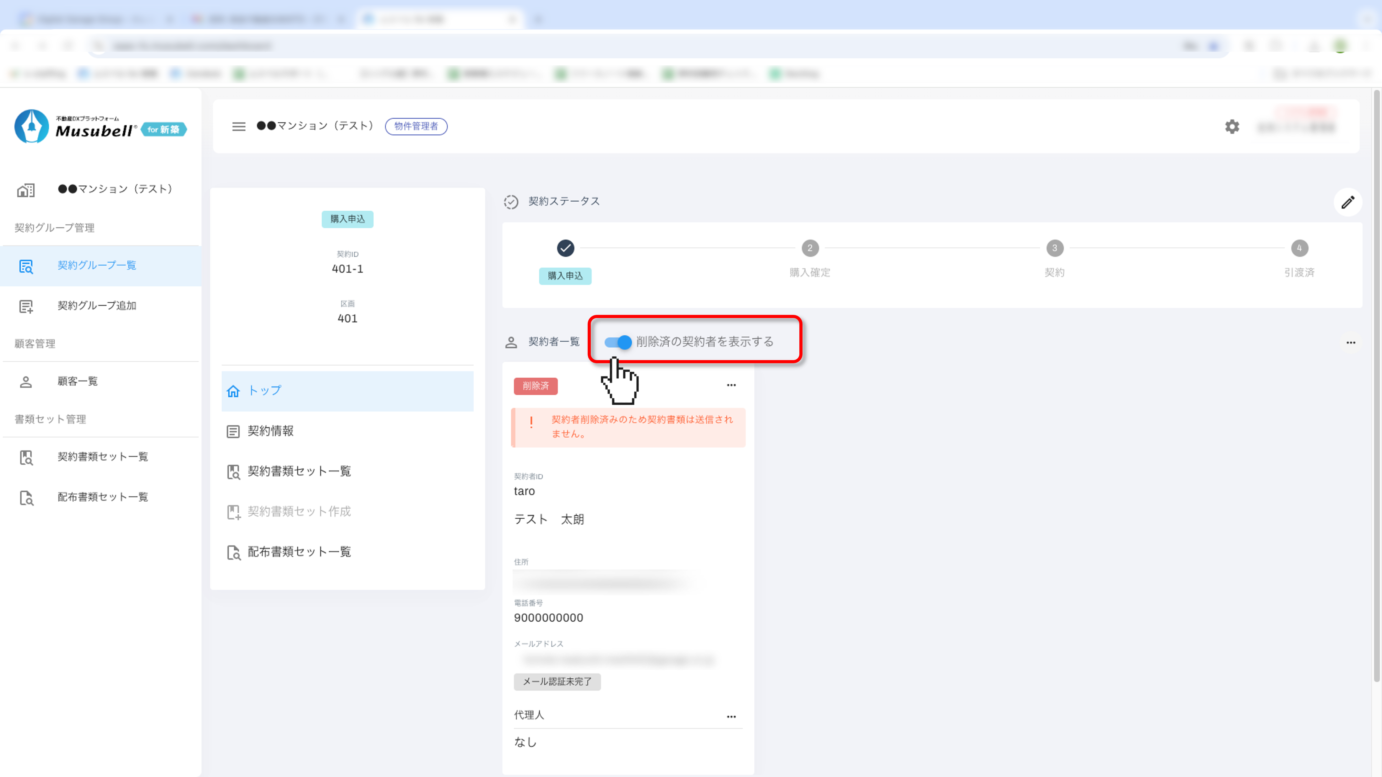 過去に削除(非表示)した情報は、「削除済の契約者を表示する」タブを有効にすることでいつでも閲覧可能です。