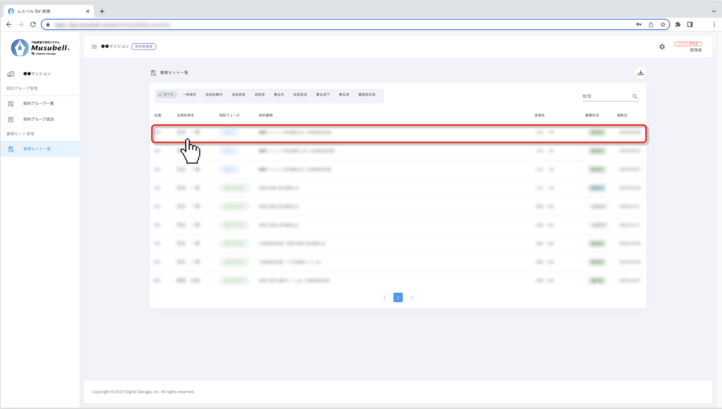 「書類セット一覧」を選択し、確認したい契約者様の該当書類をクリックします。