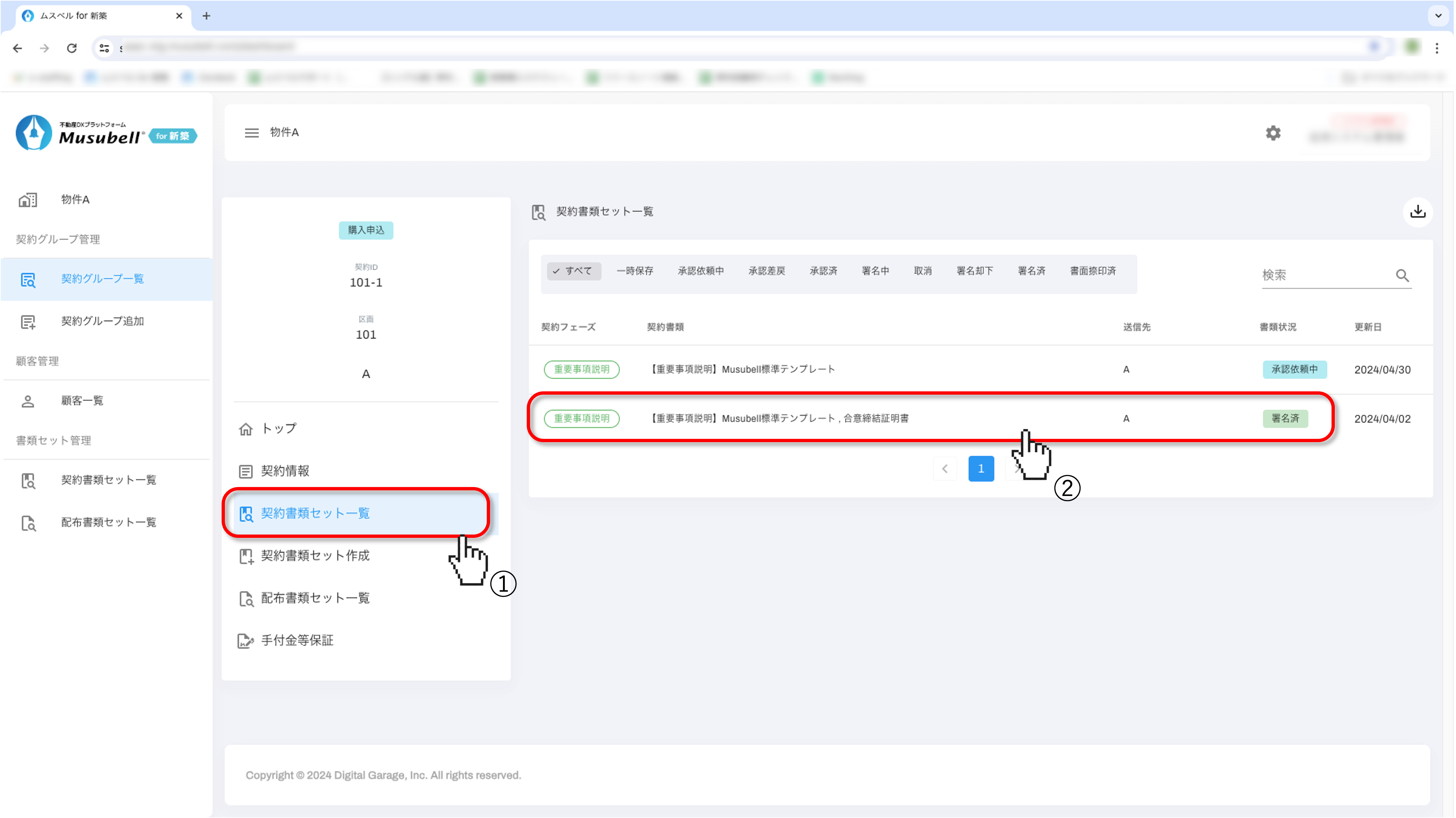 「契約書類セット一覧」から、対象の書類が含まれる契約書類セットをクリックします。