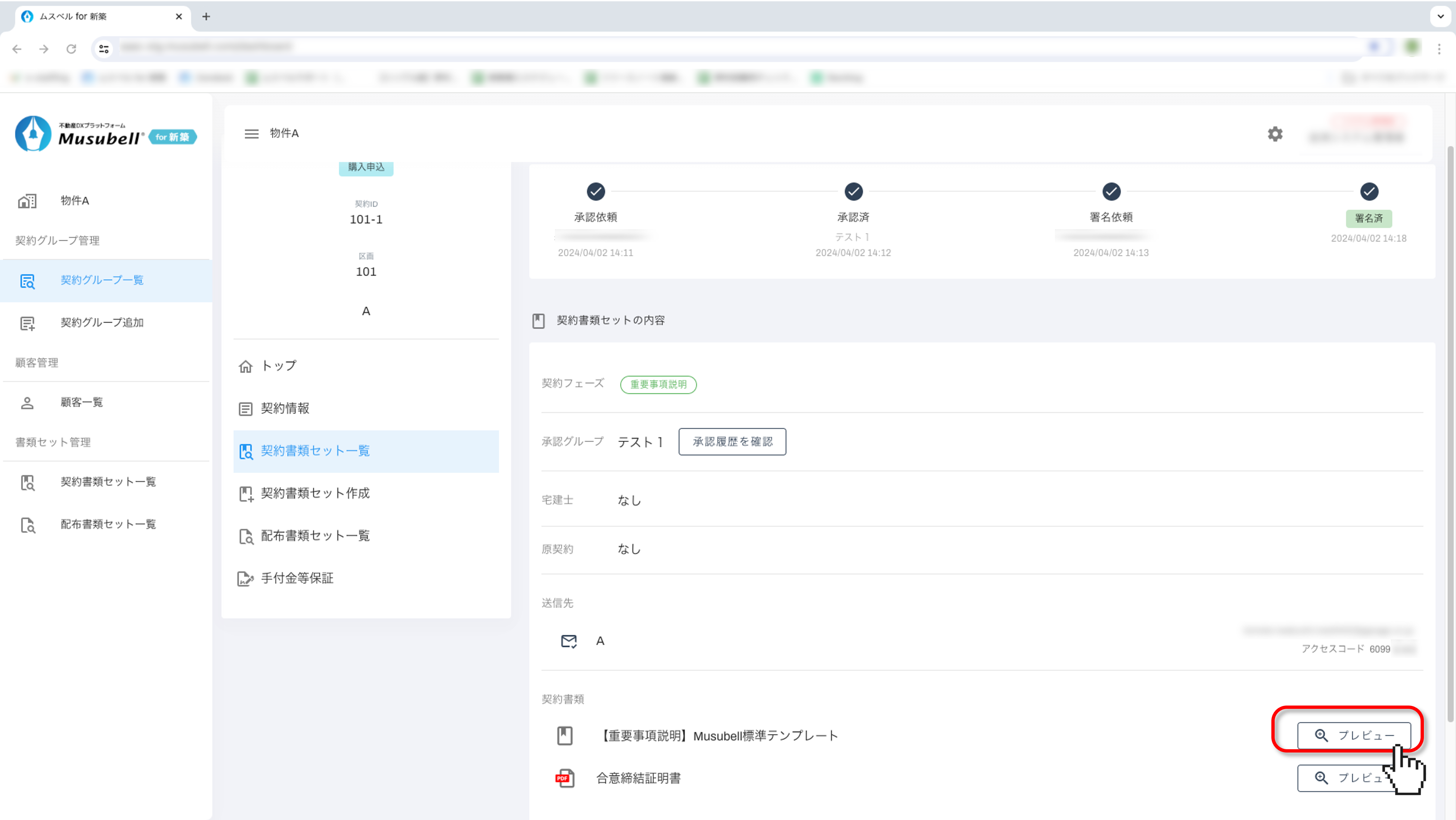 該当する契約書類の右側にある「プレビュー」をクリックします。
