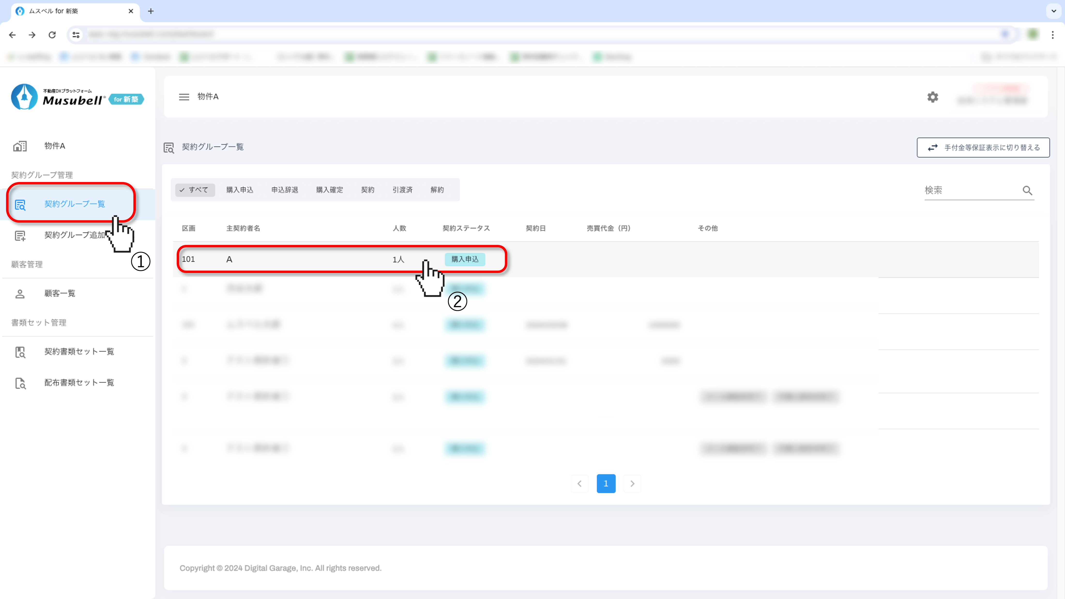 「契約グループ一覧」から、該当の契約者名をクリックします。