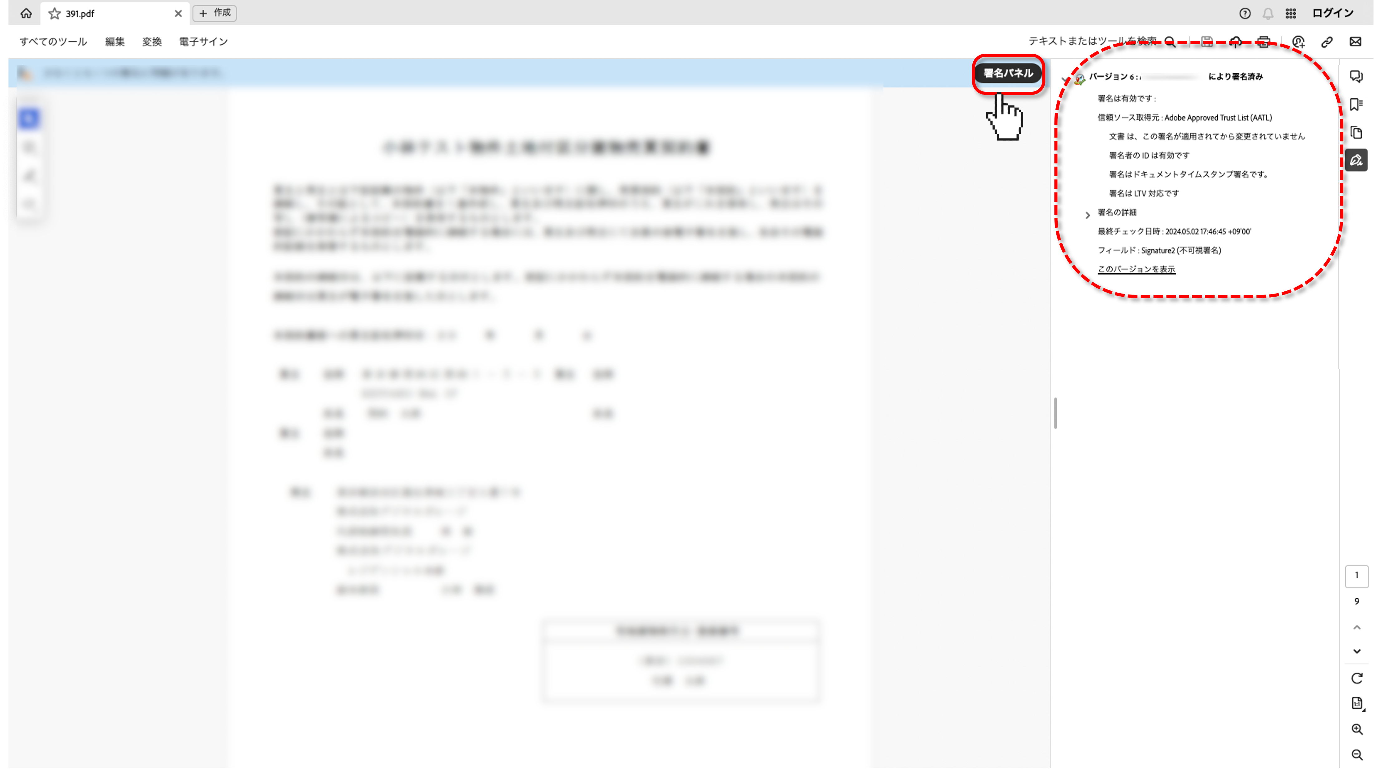 電子署名済みの契約書類をパソコンのAdobe Acrobat Readerで開き、右上の「署名パネル」をクリックします。