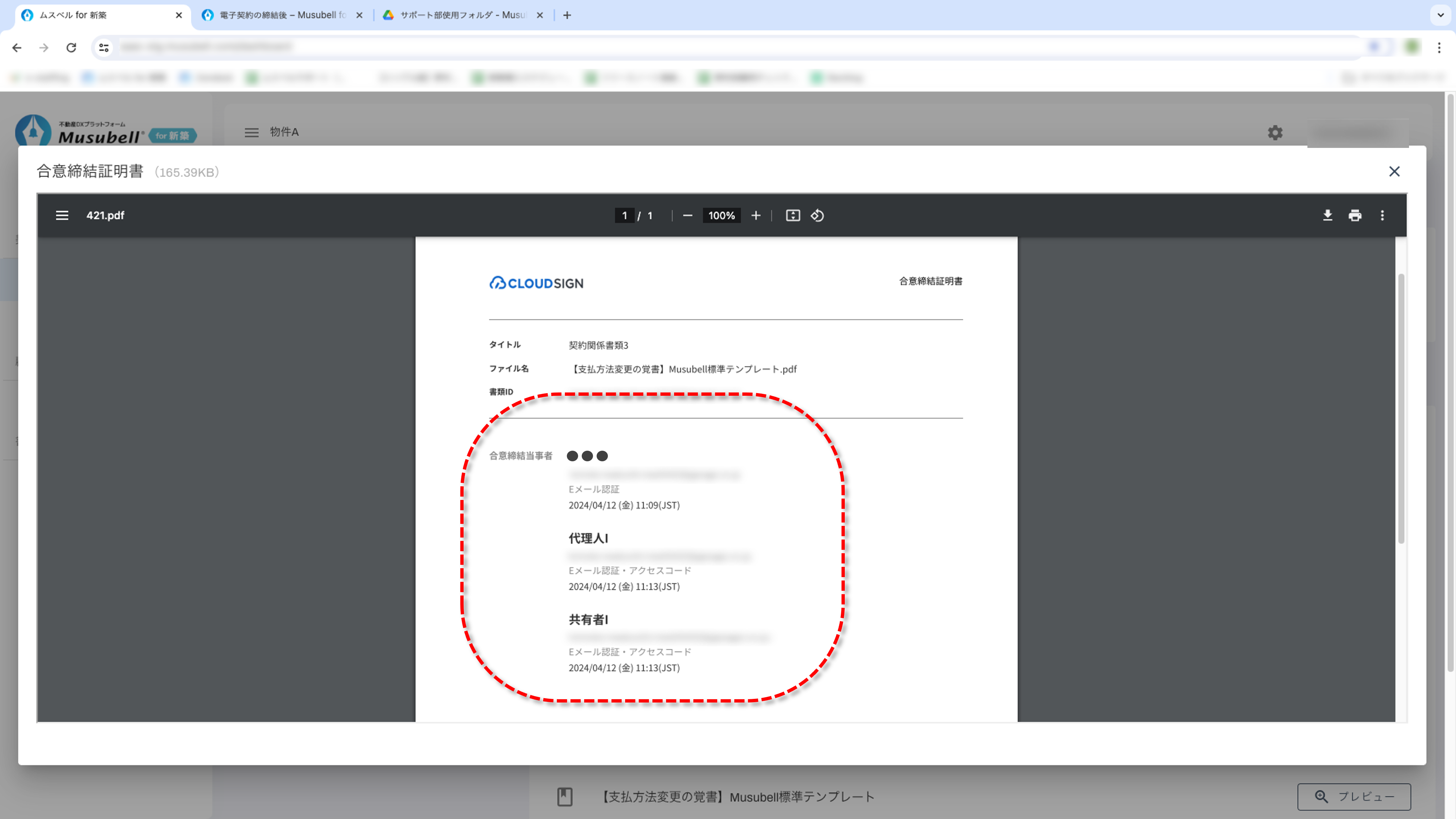 電子署名時に発行される「合意締結証明書」からも、署名者や日時を確認できます。