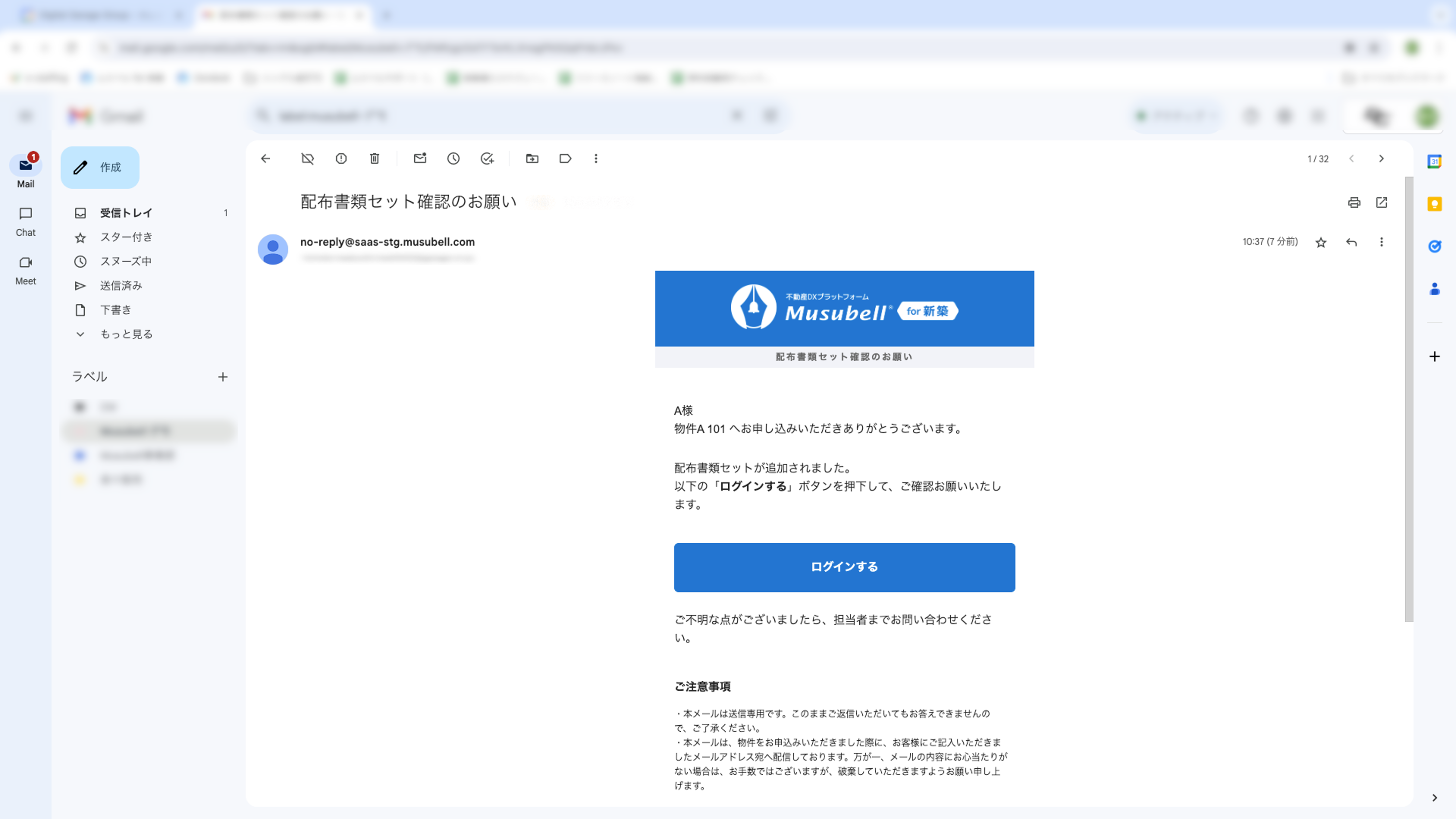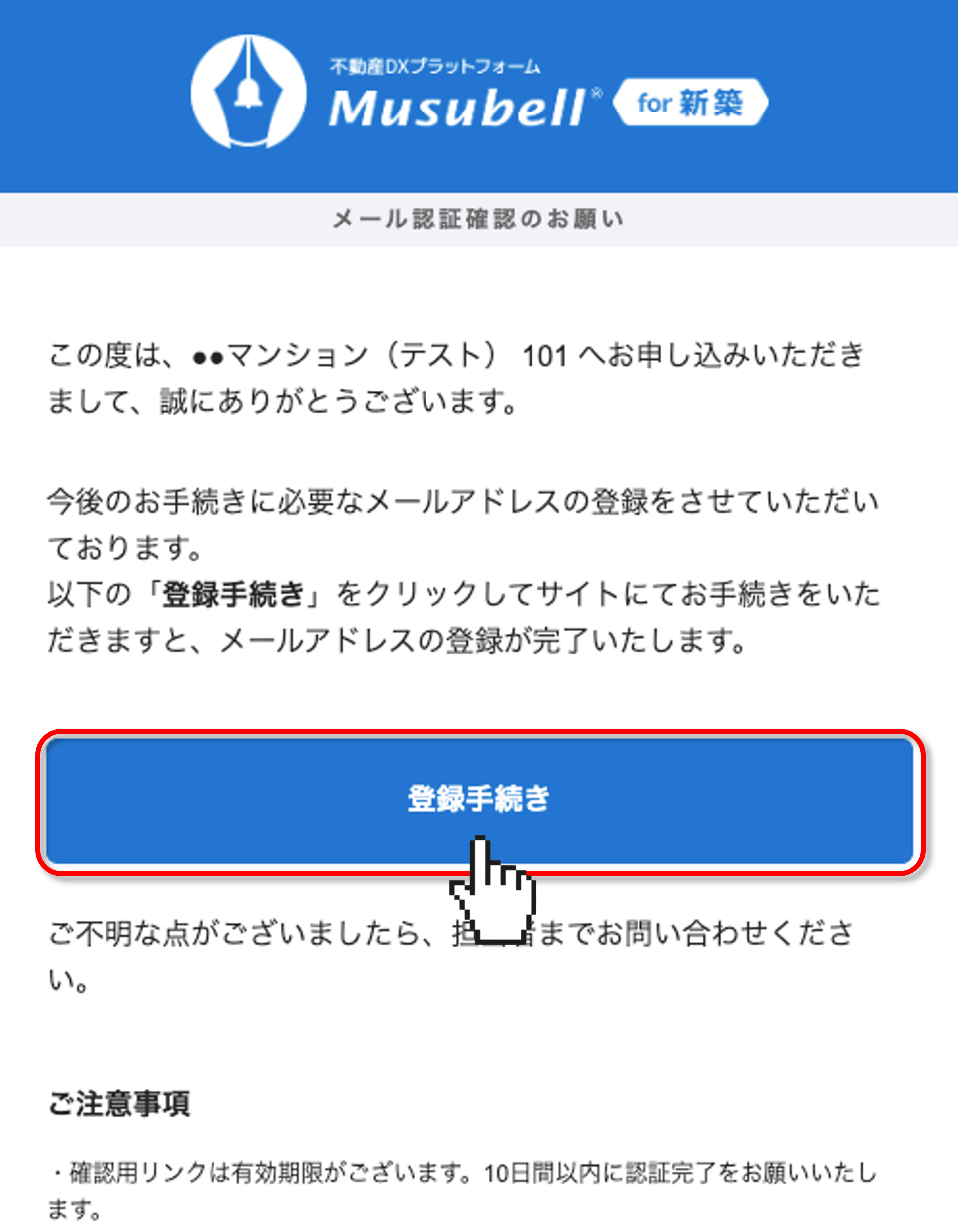 Musubellから契約者に届いているメールの「登録手続き」ボタンをクリックします。
