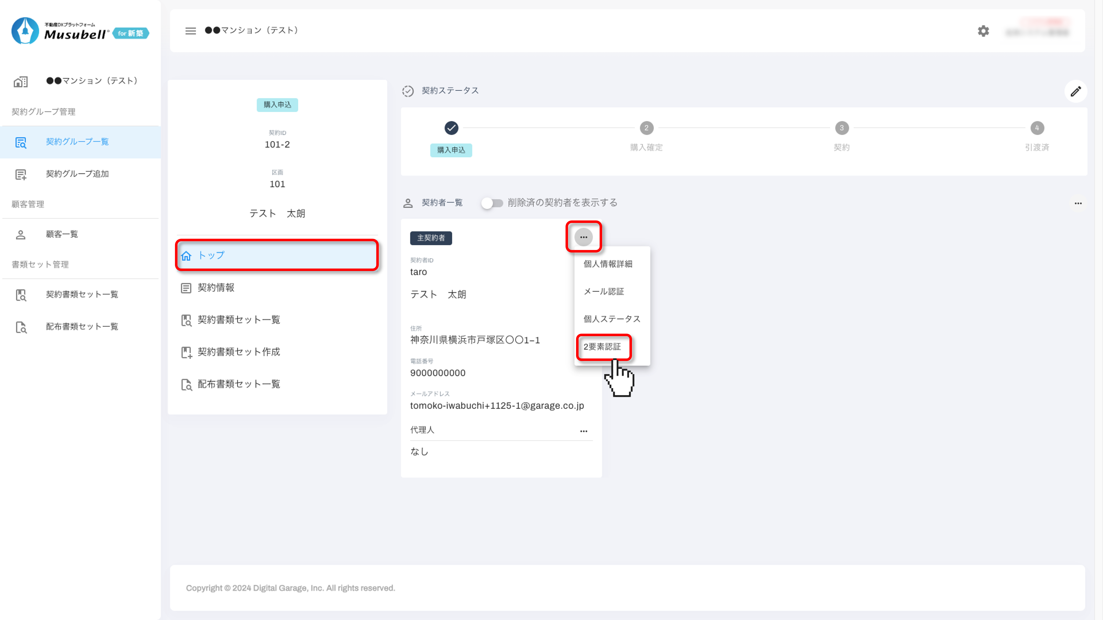 トップの契約者情報の右上にある「…」をクリックし、「2段階認証」を選択します。