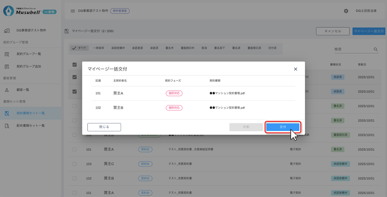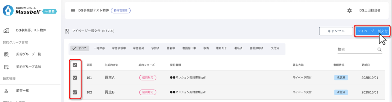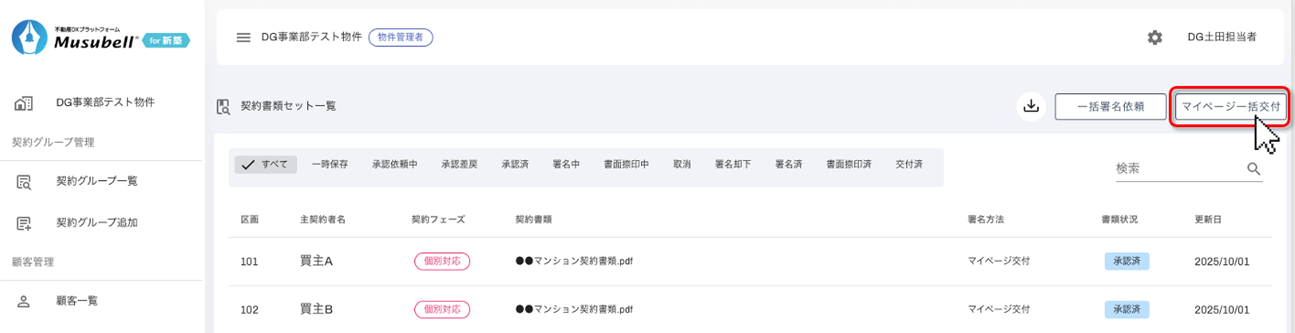 社内承認が完了した書類セットを、複数のお客様のマイページへ一度に交付することができます。