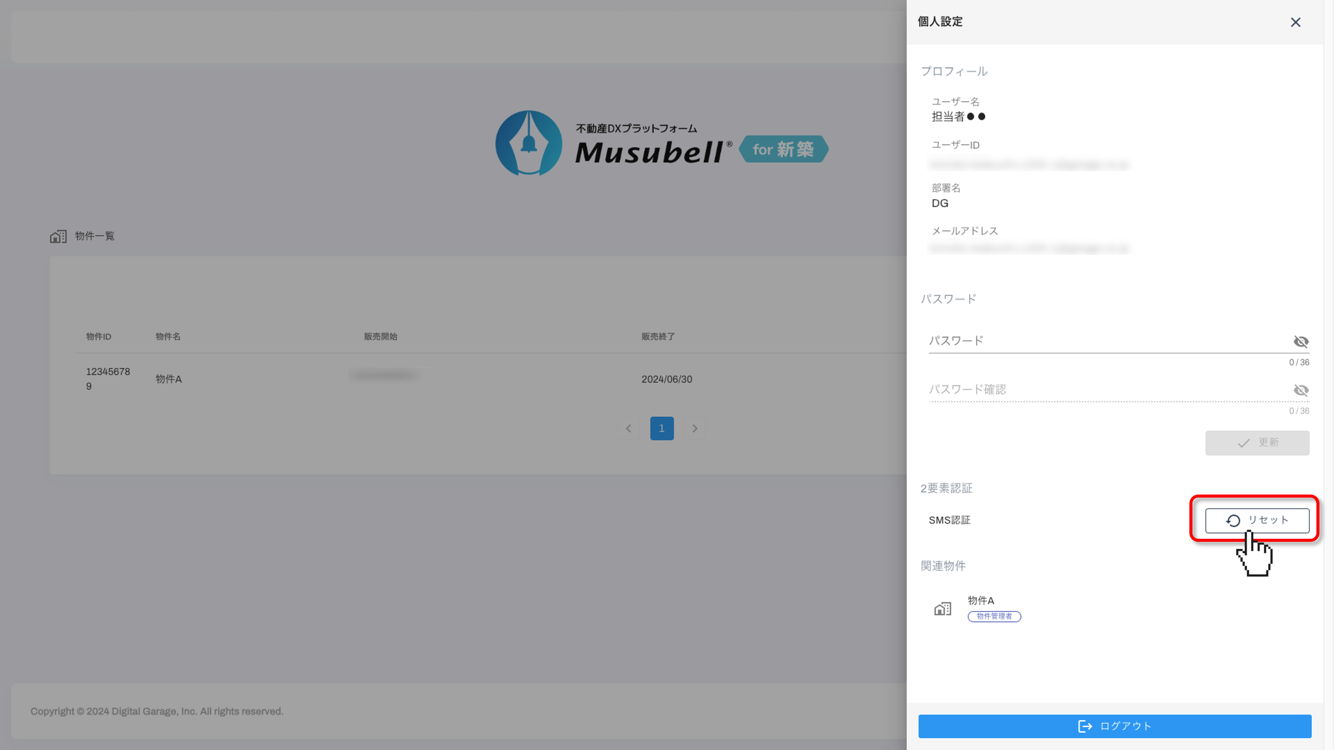 「リセット」をクリックして、2要素認証の設定を解除します。