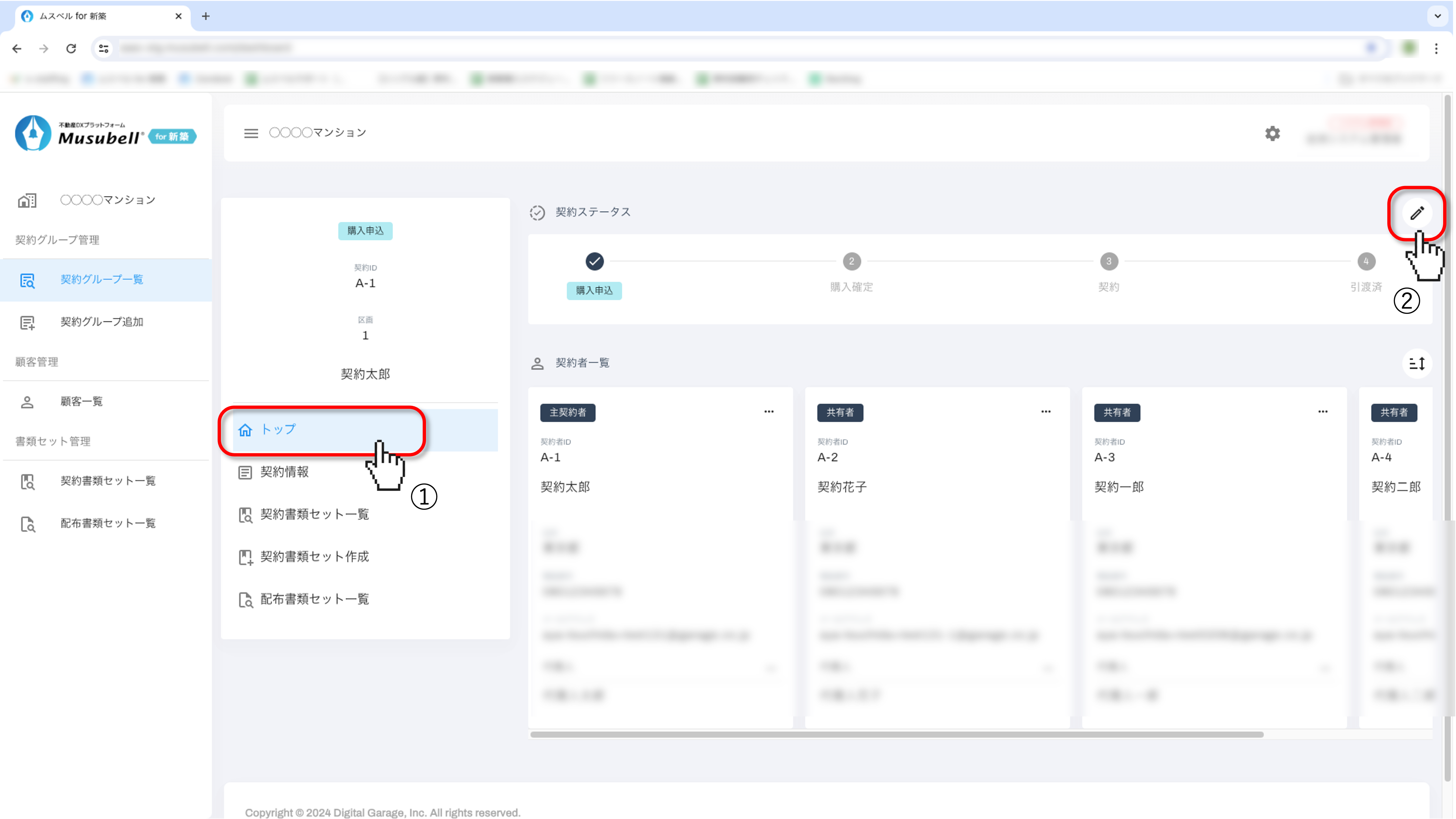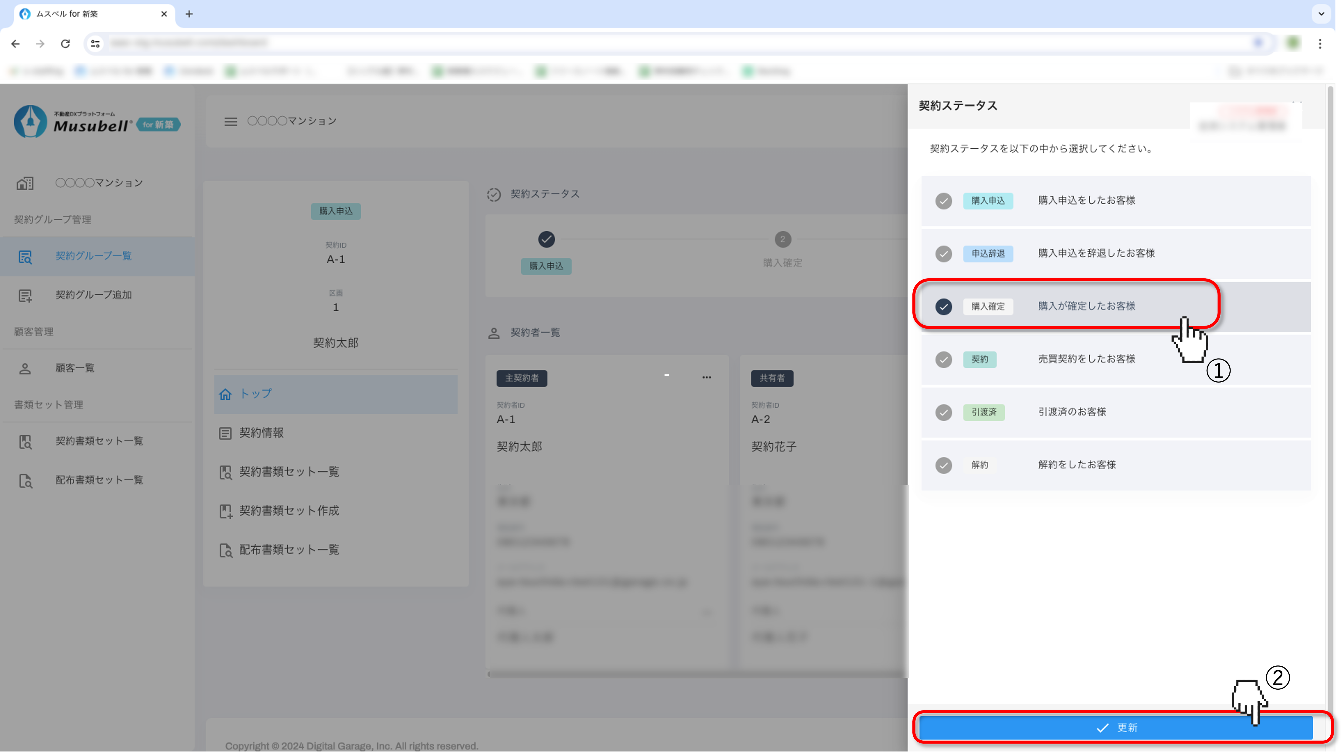 ②契約ステータスを変更したい契約者を選択し、クリックします。