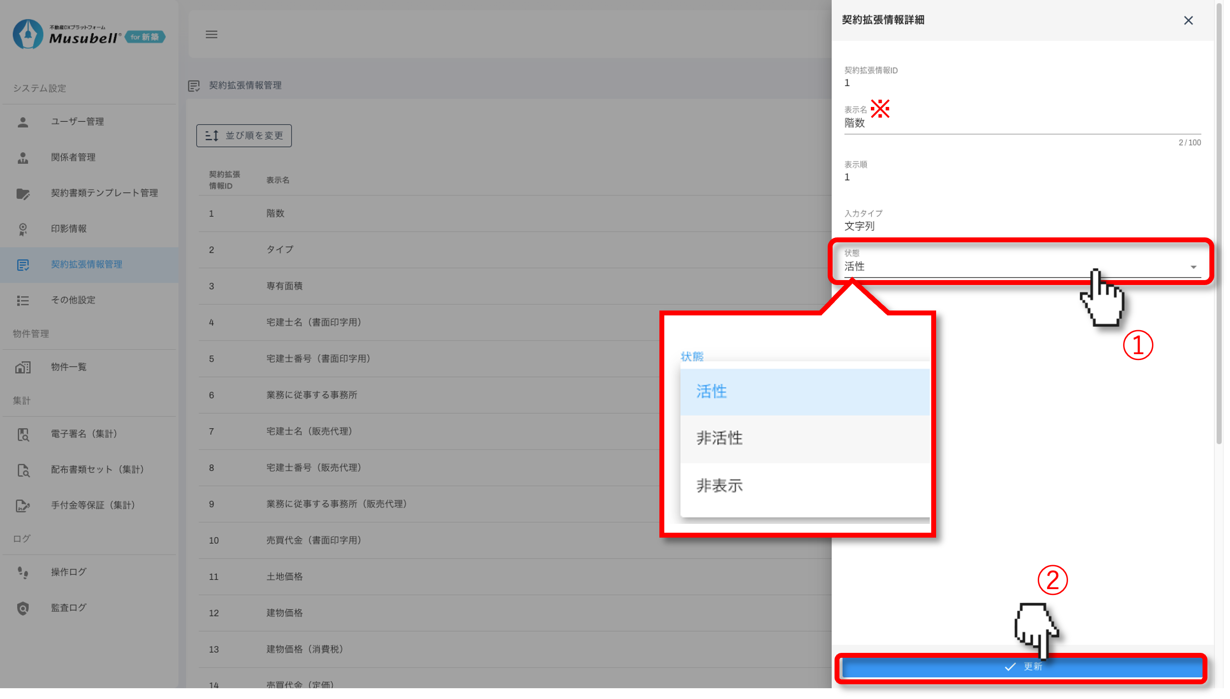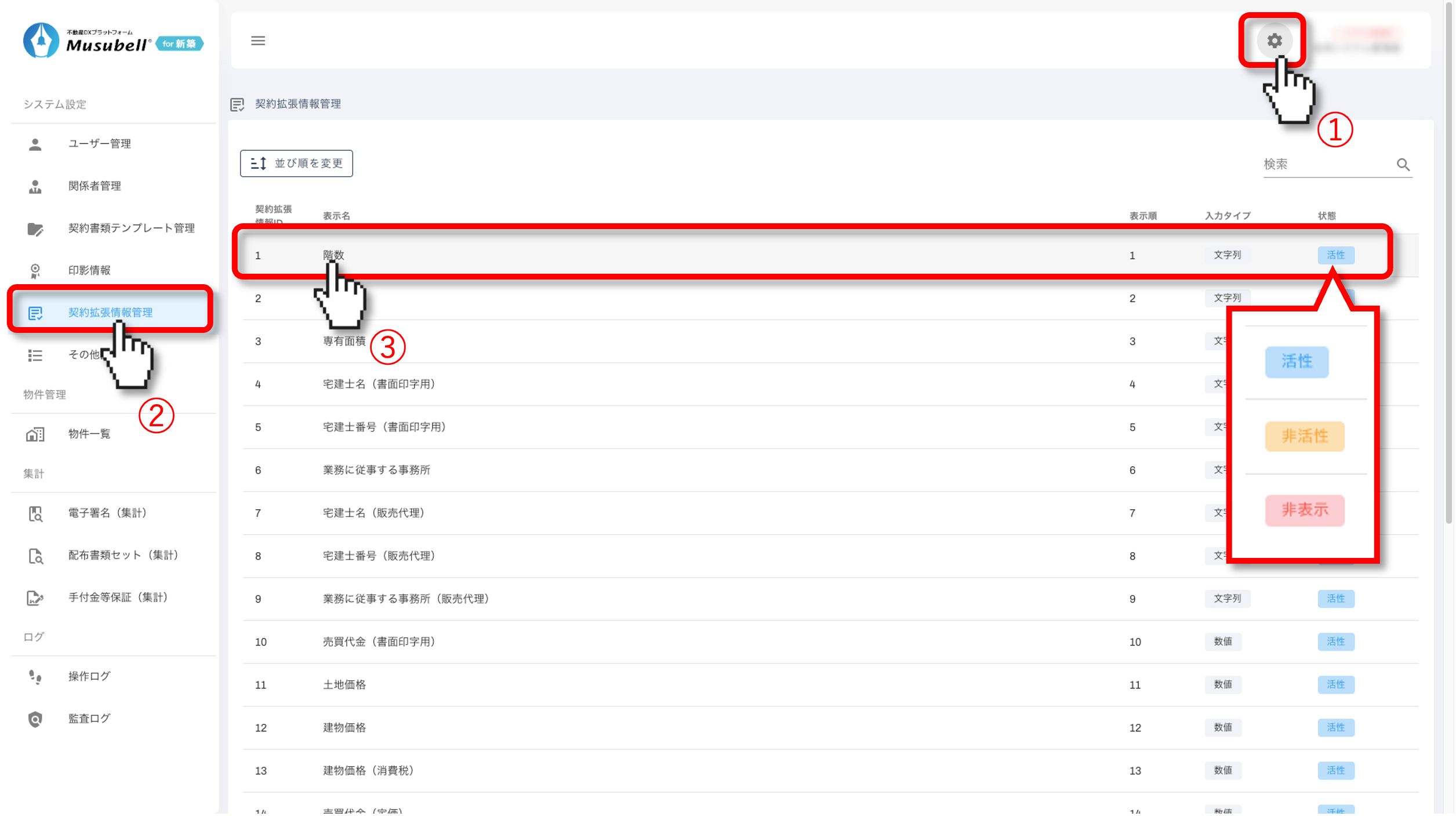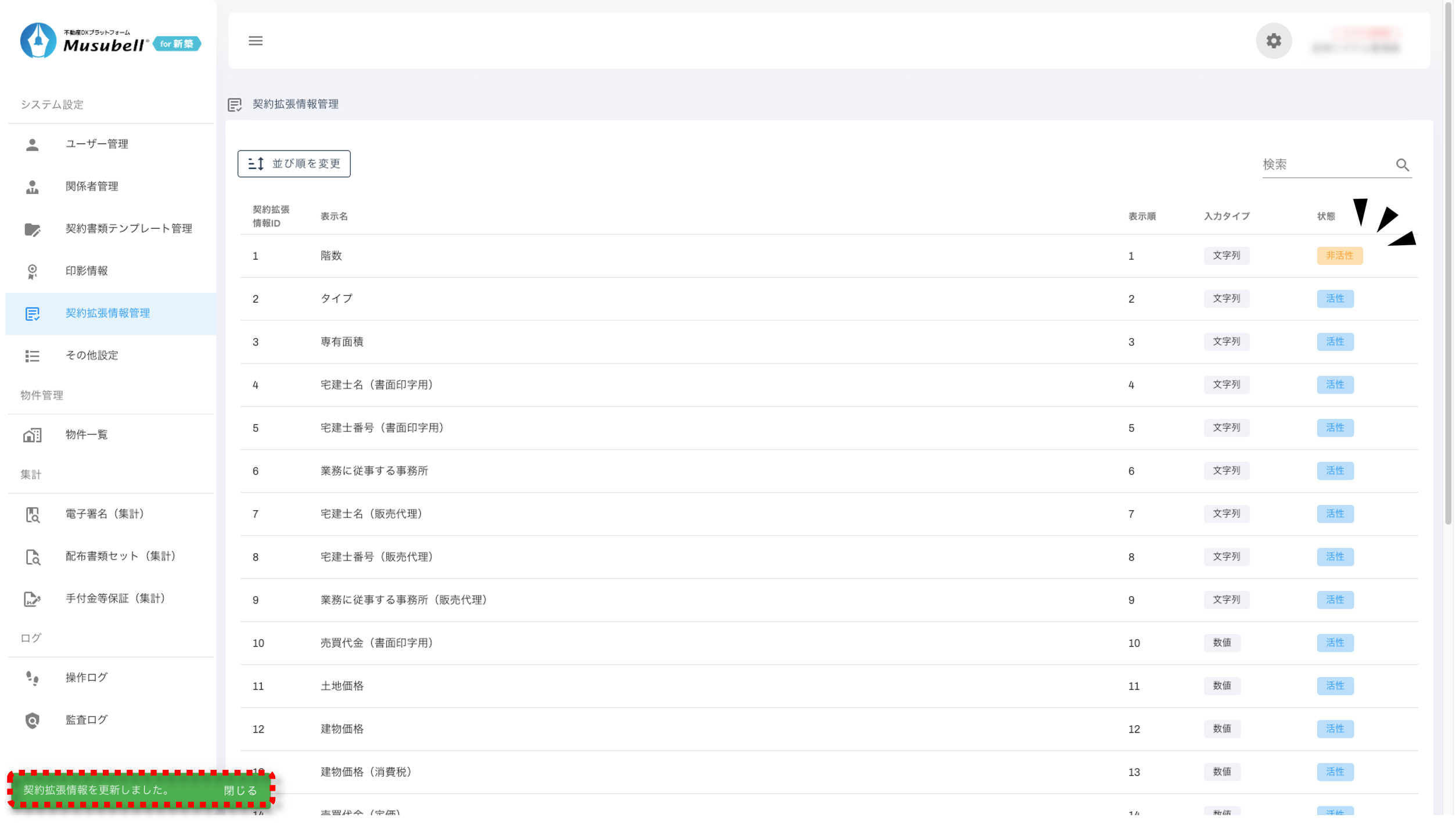 契約情報の表示状態(活性/非活性/非表示)の切り替えや、項目名の管理手順についてご案内します。