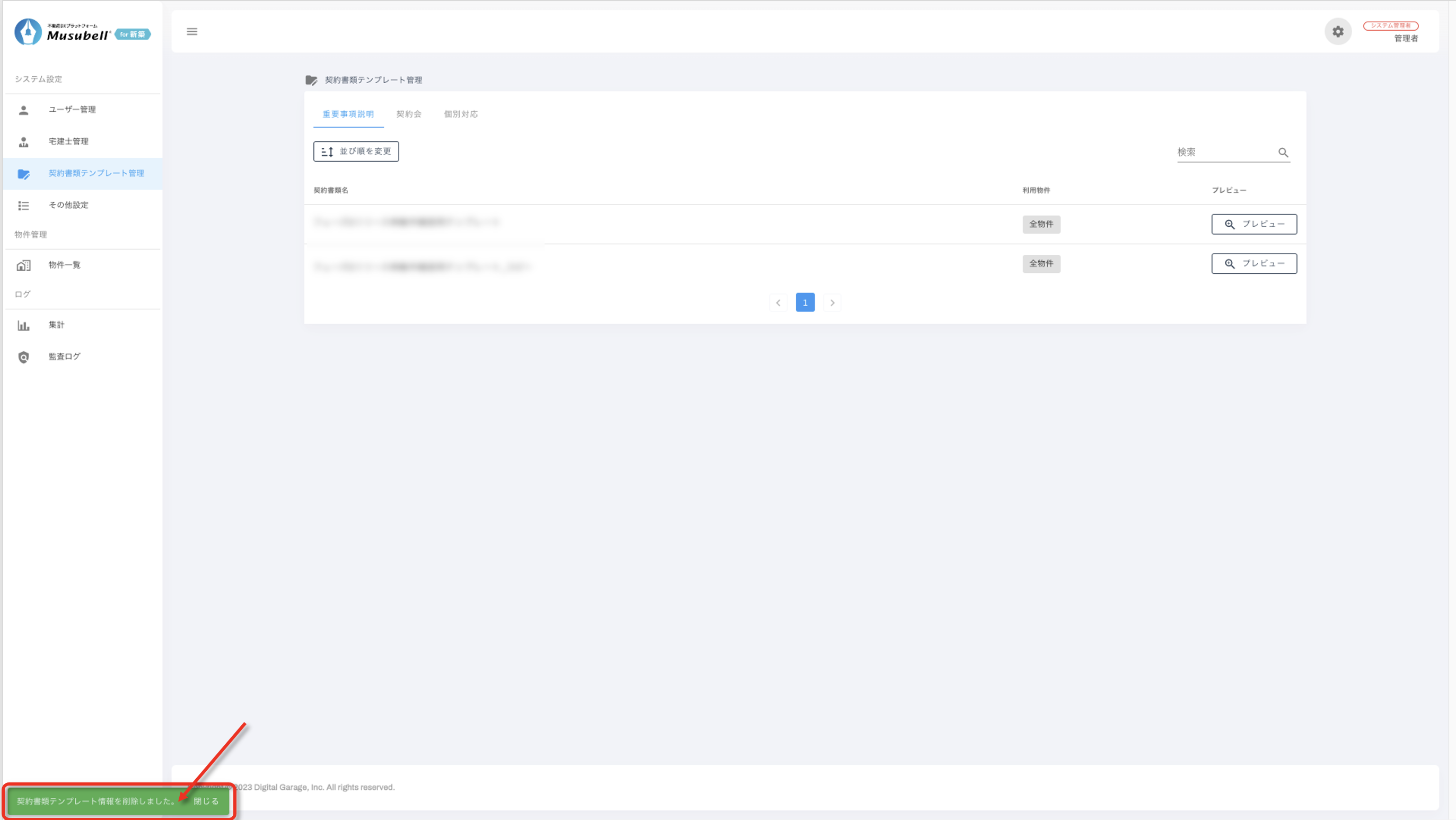 [契約書類テンプレート管理]から削除したいテンプレートをクリックします。