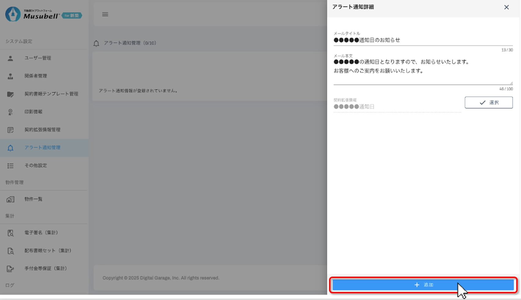 システム設定画面の「アラート通知管理」右上にある[追加]をクリックします。