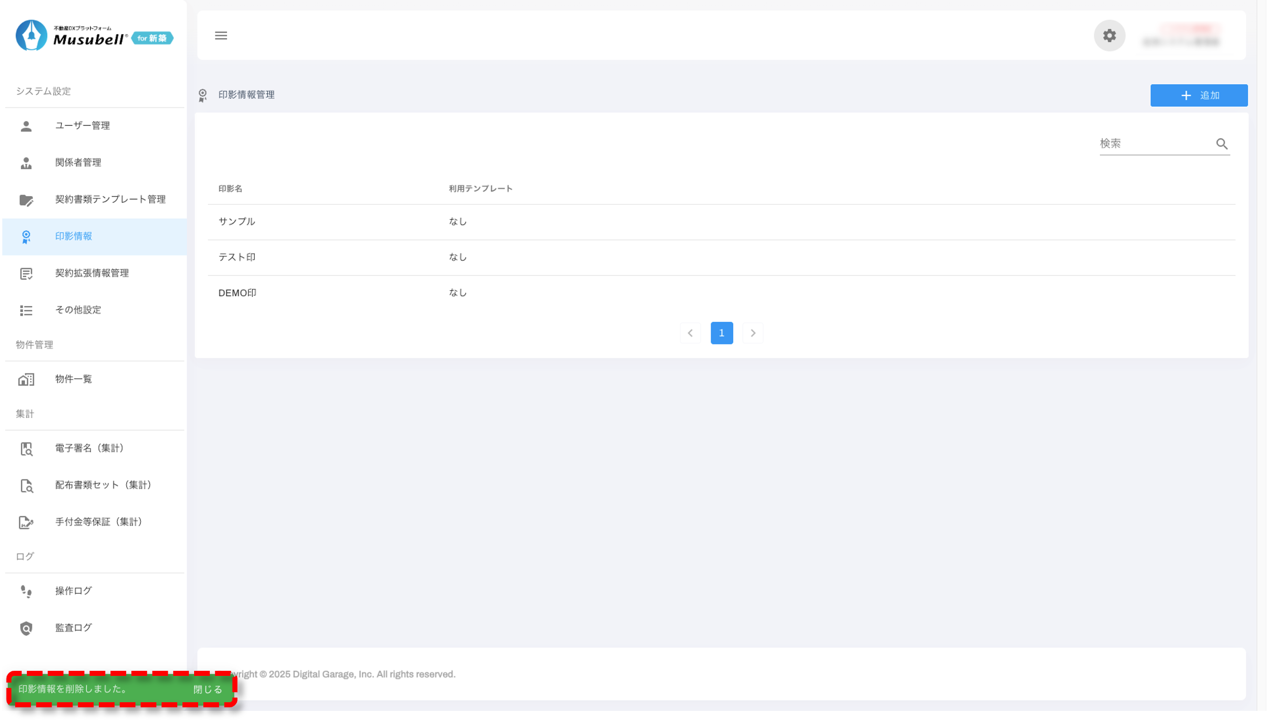 左下に「印影情報を削除しました」と表示されたら、削除完了です。