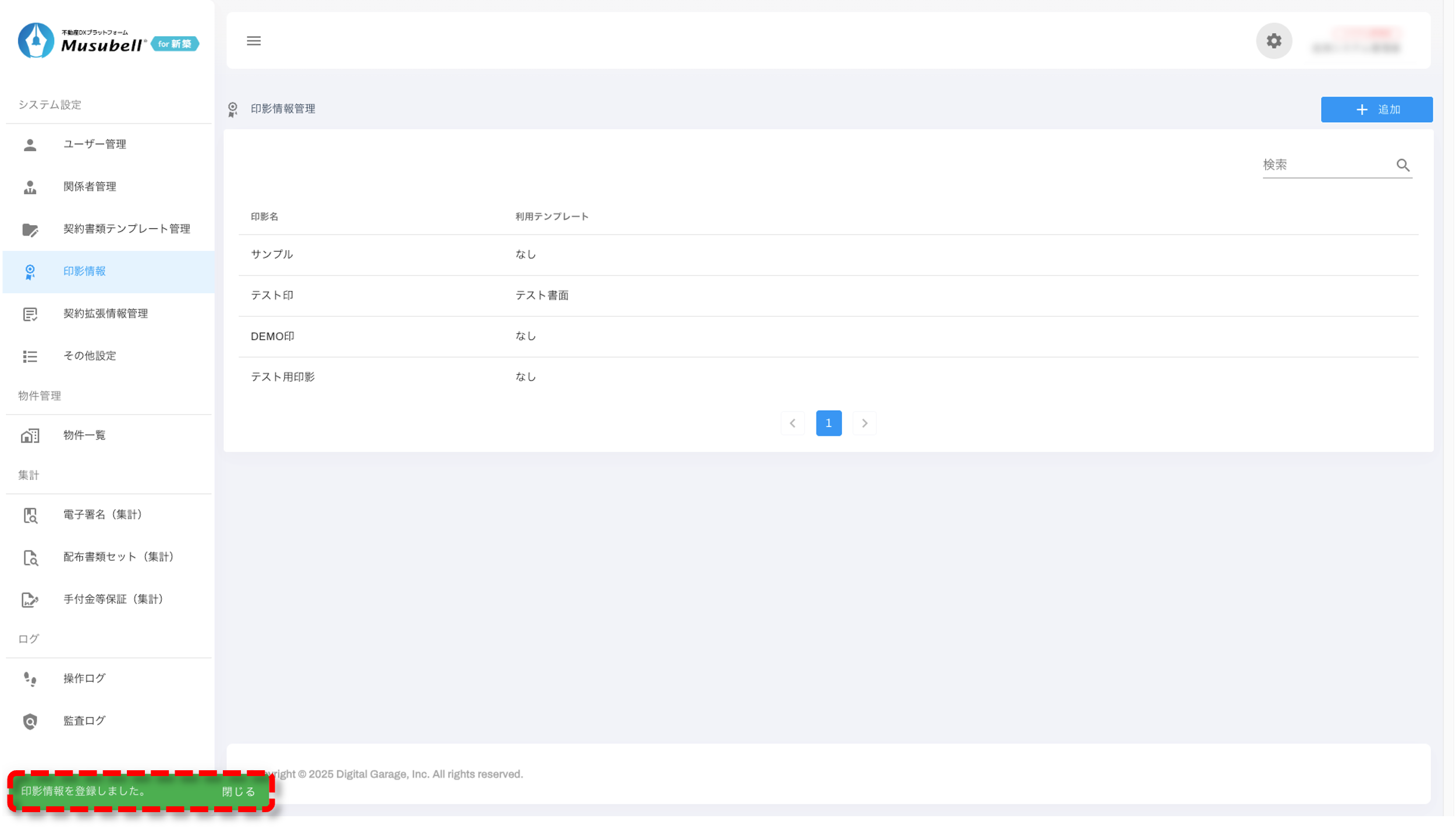左下に「印影情報を登録しました」と表示されたら、登録完了です。