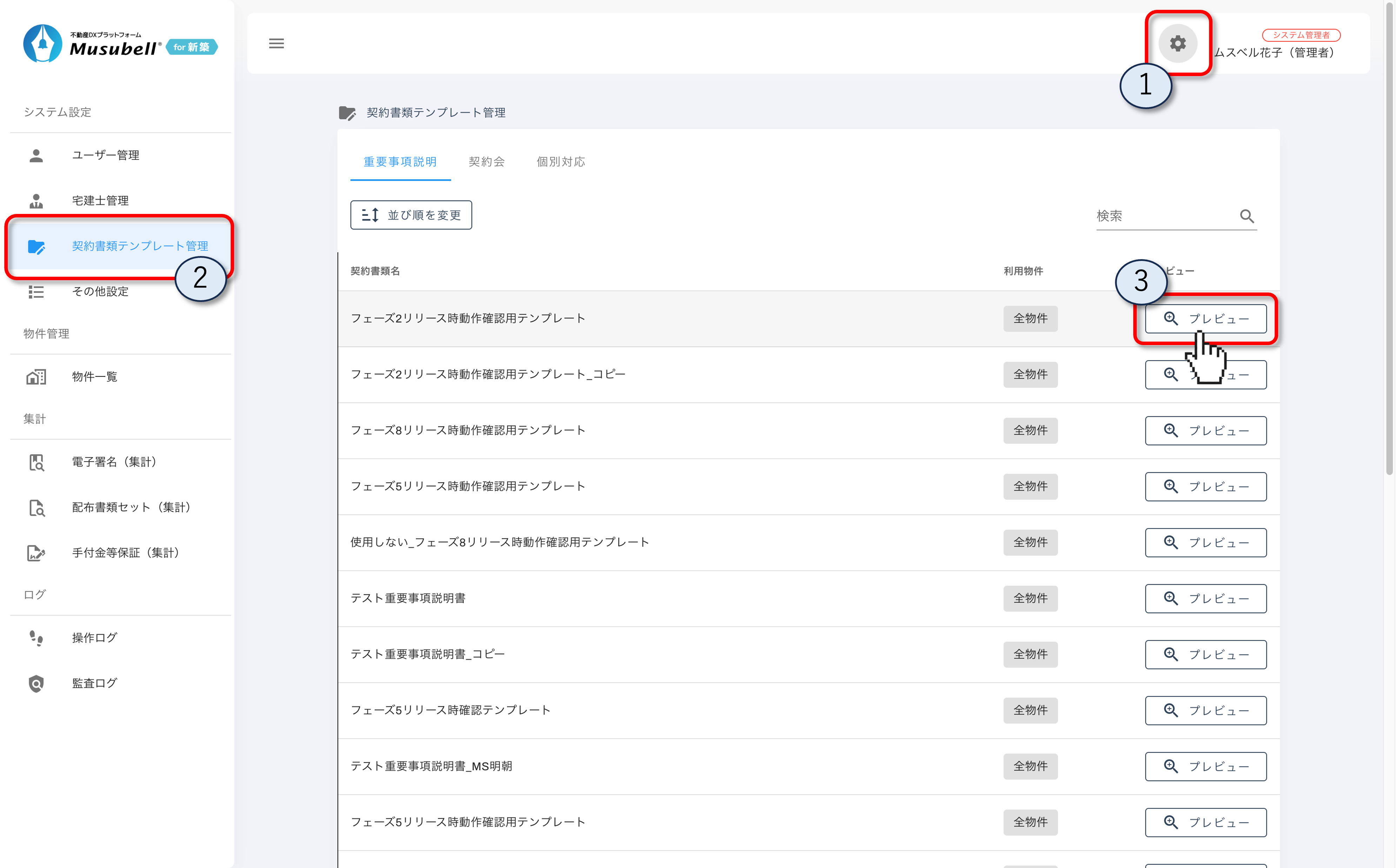 ③ 内容を確認したいテンプレートの[プレビュー]をクリックします。