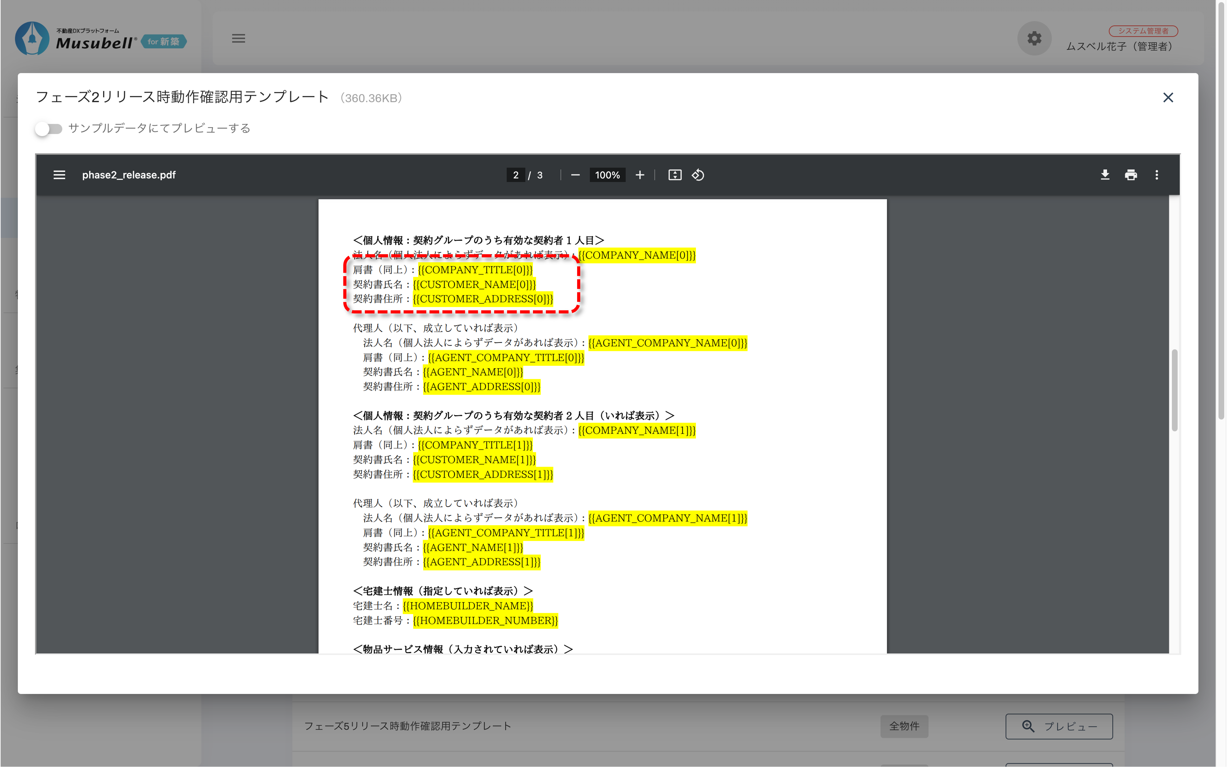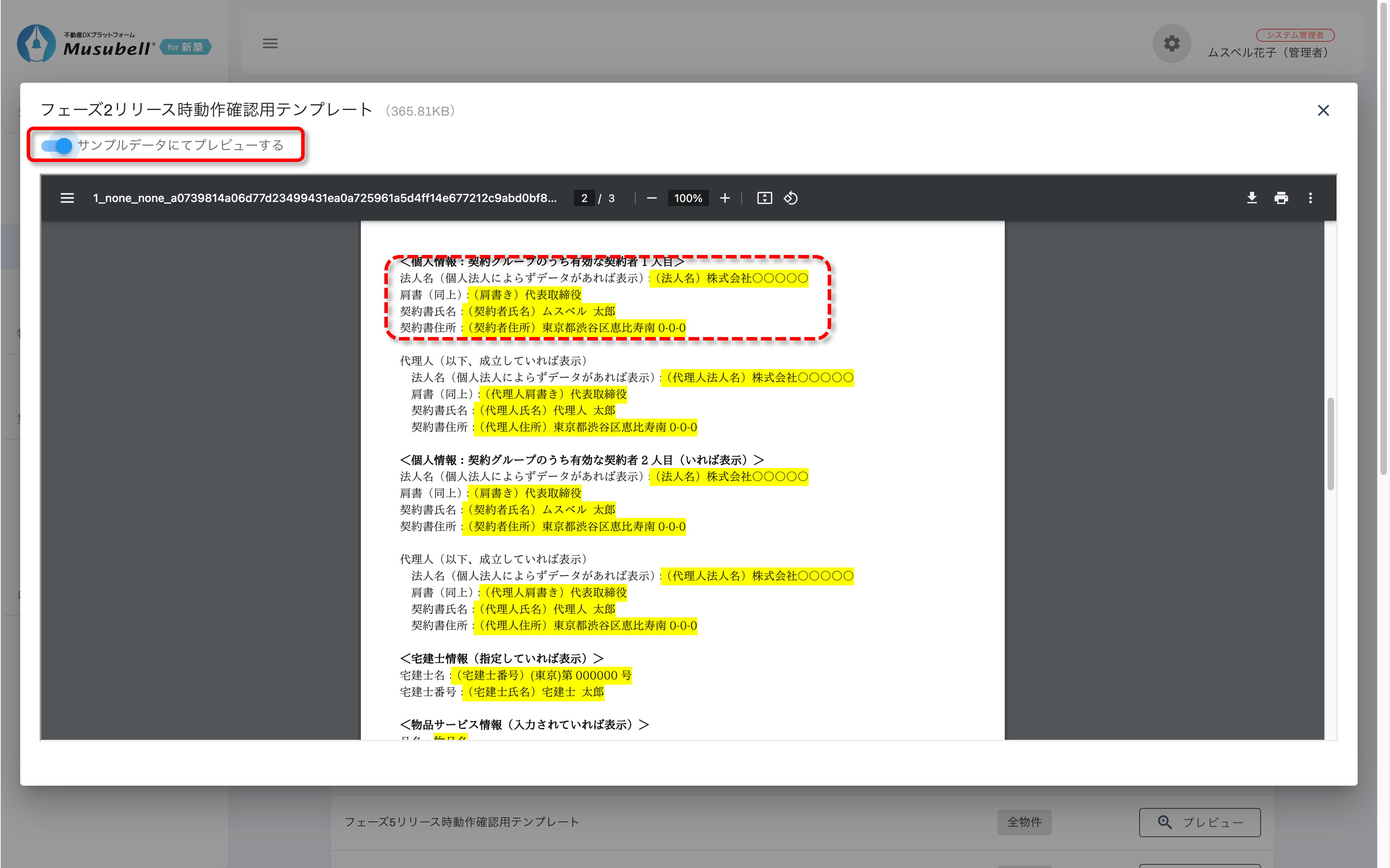 [サンプルデータにてプレビューする]を有効にすると、各項目にサンプル文字が入力された状態のテンプレートを確認することができます。