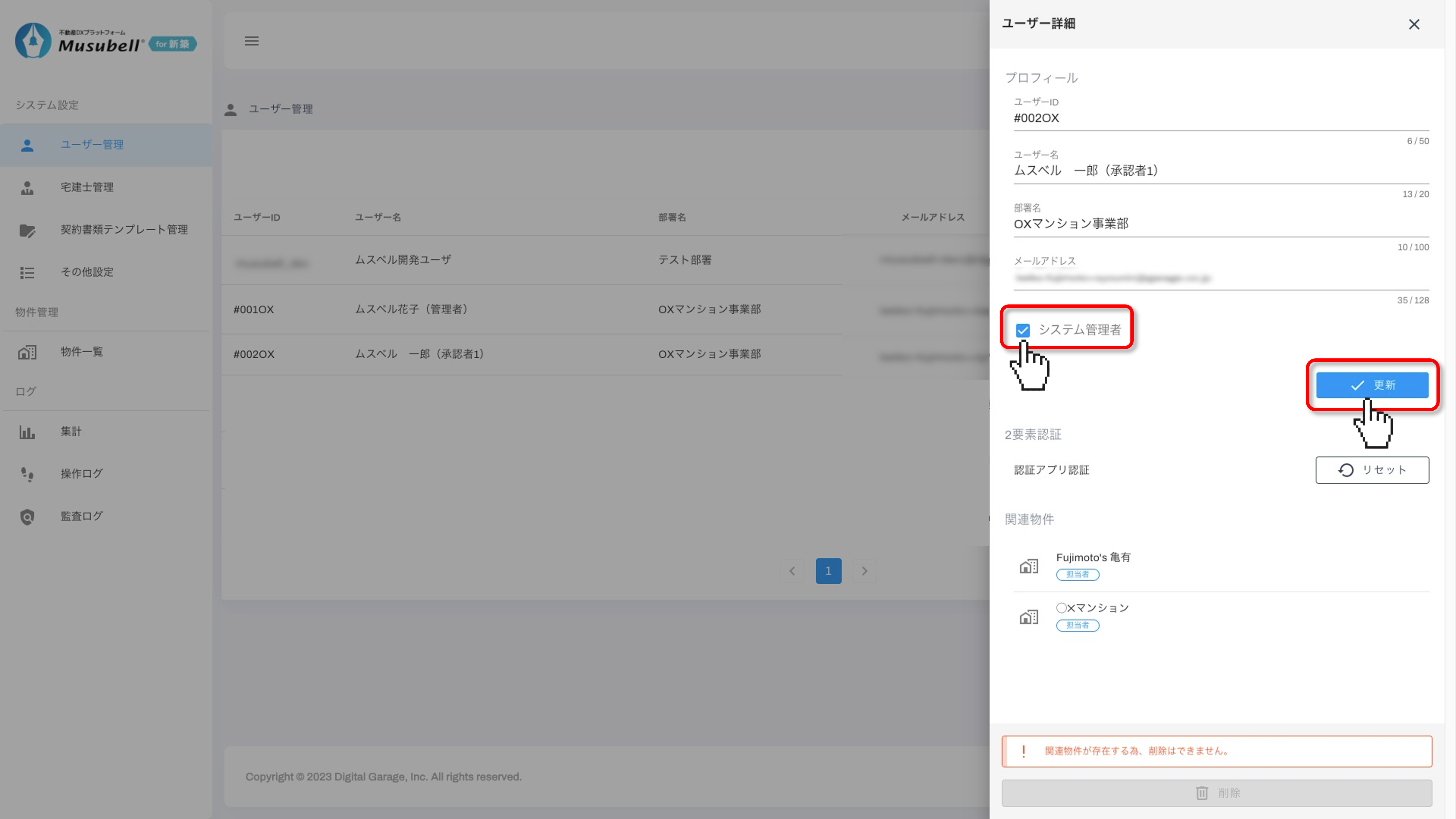 右側に表示される「ユーザー詳細」の「システム管理者」にチェックを入れ、[更新]をクリックします。