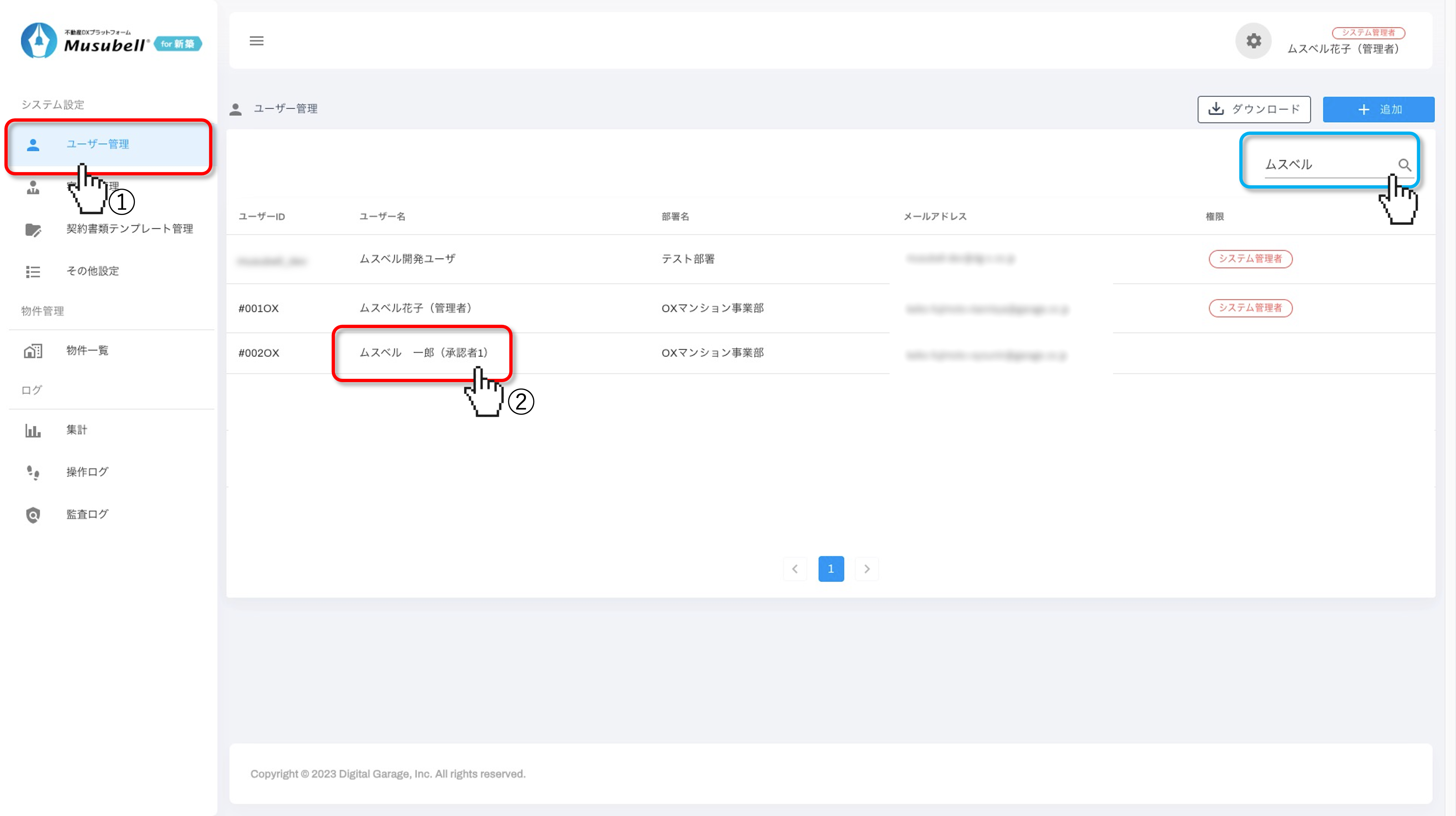 メニューの[ユーザー管理]をクリックし、管理者権限を付与したいユーザー名を選択します。