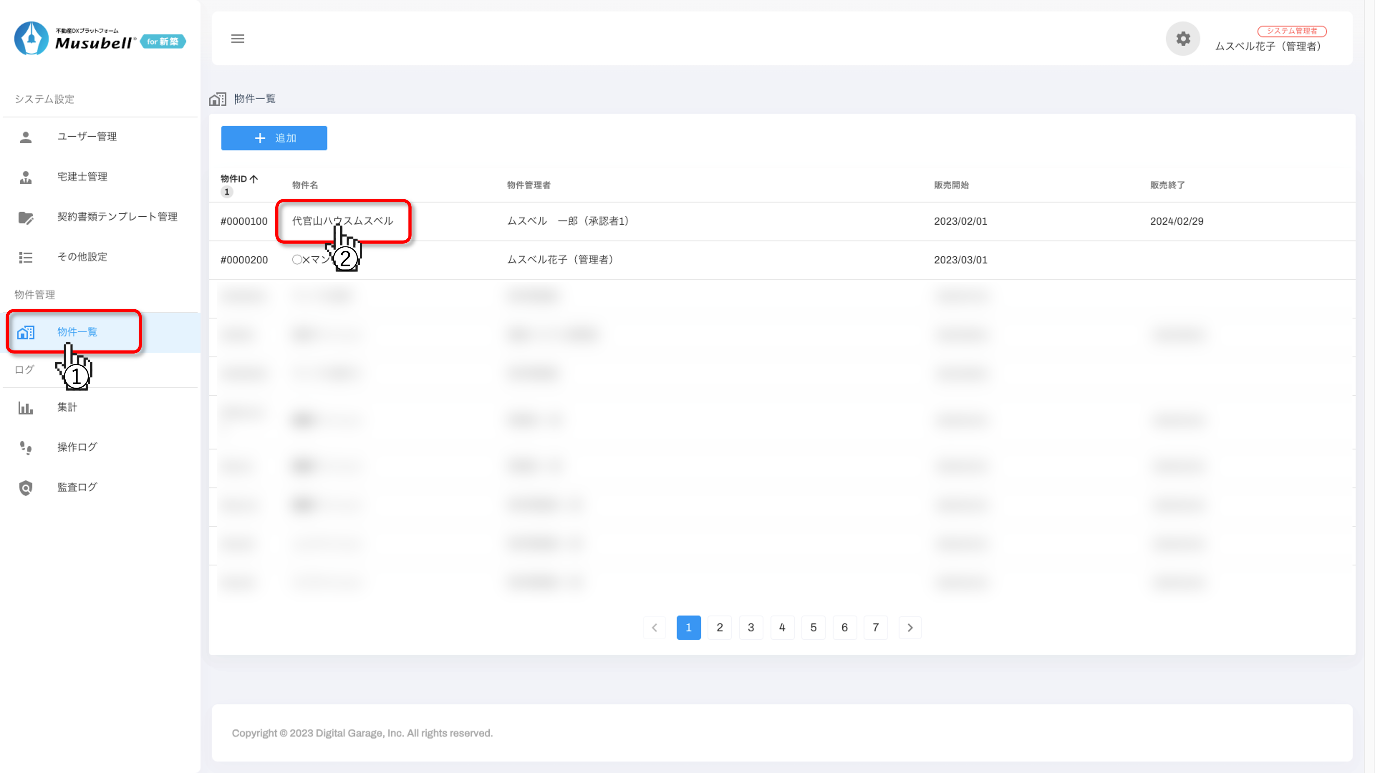 メニューの[物件一覧]をクリックし、変更したい「物件名」を選択します。
