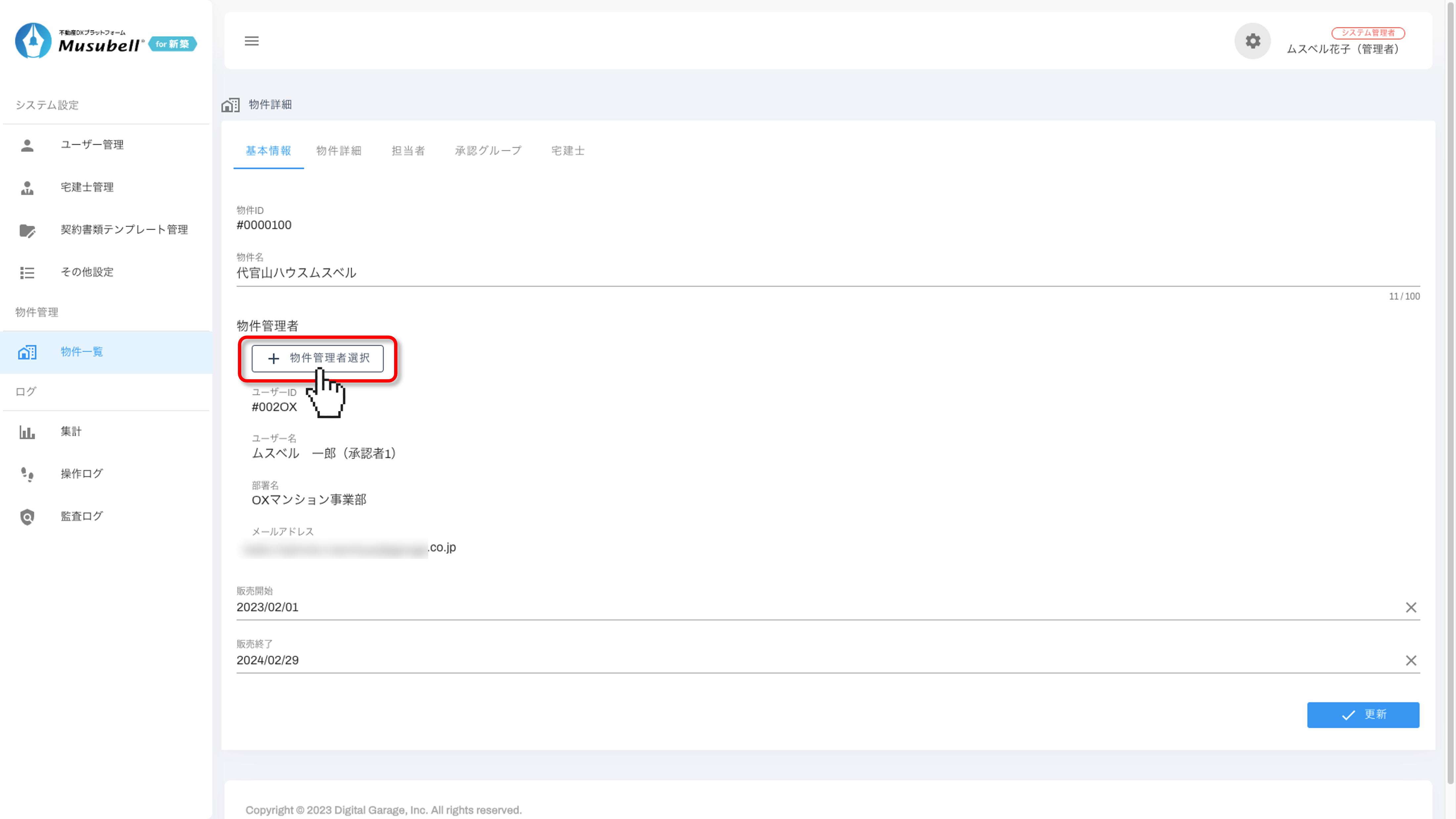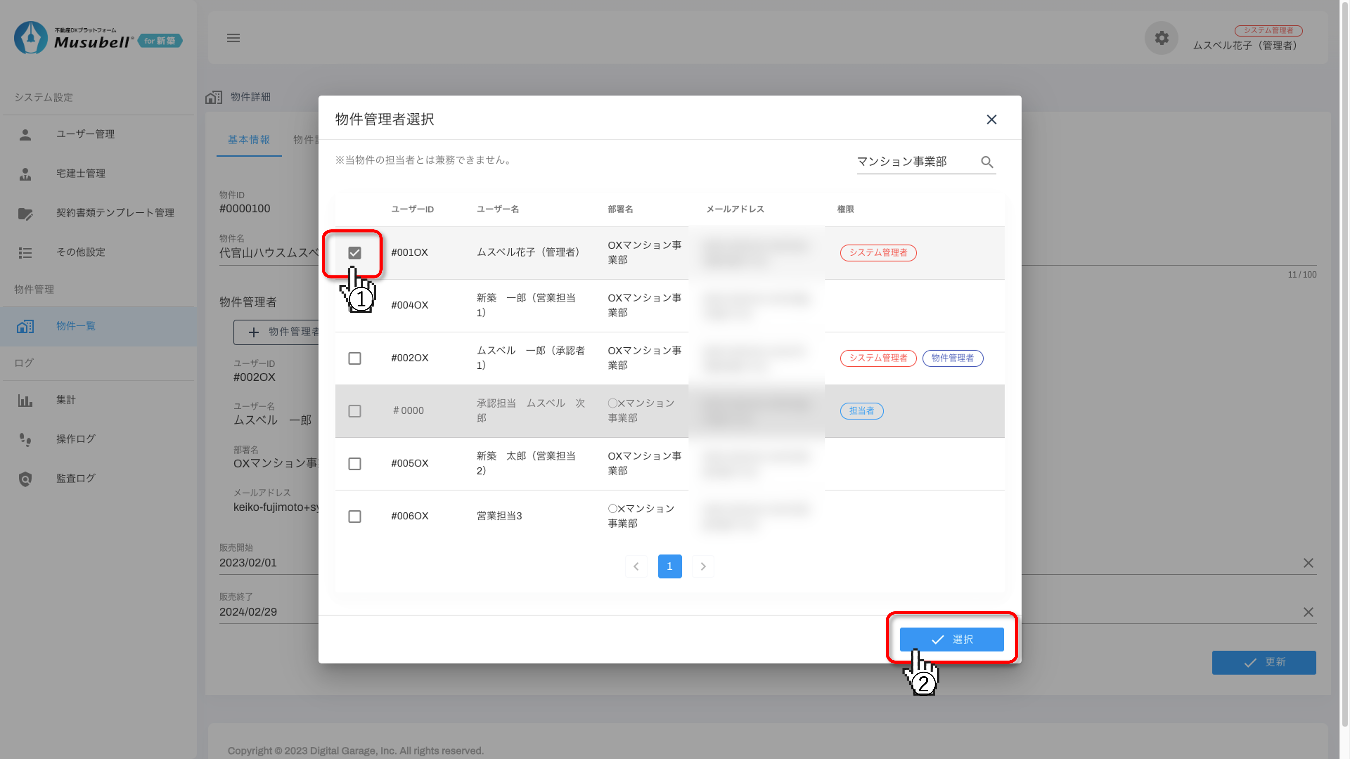物件管理者は、物件担当と兼務することはできません。 ユーザー名横の「担当者」タグの有無を確認してから選択してください。 |