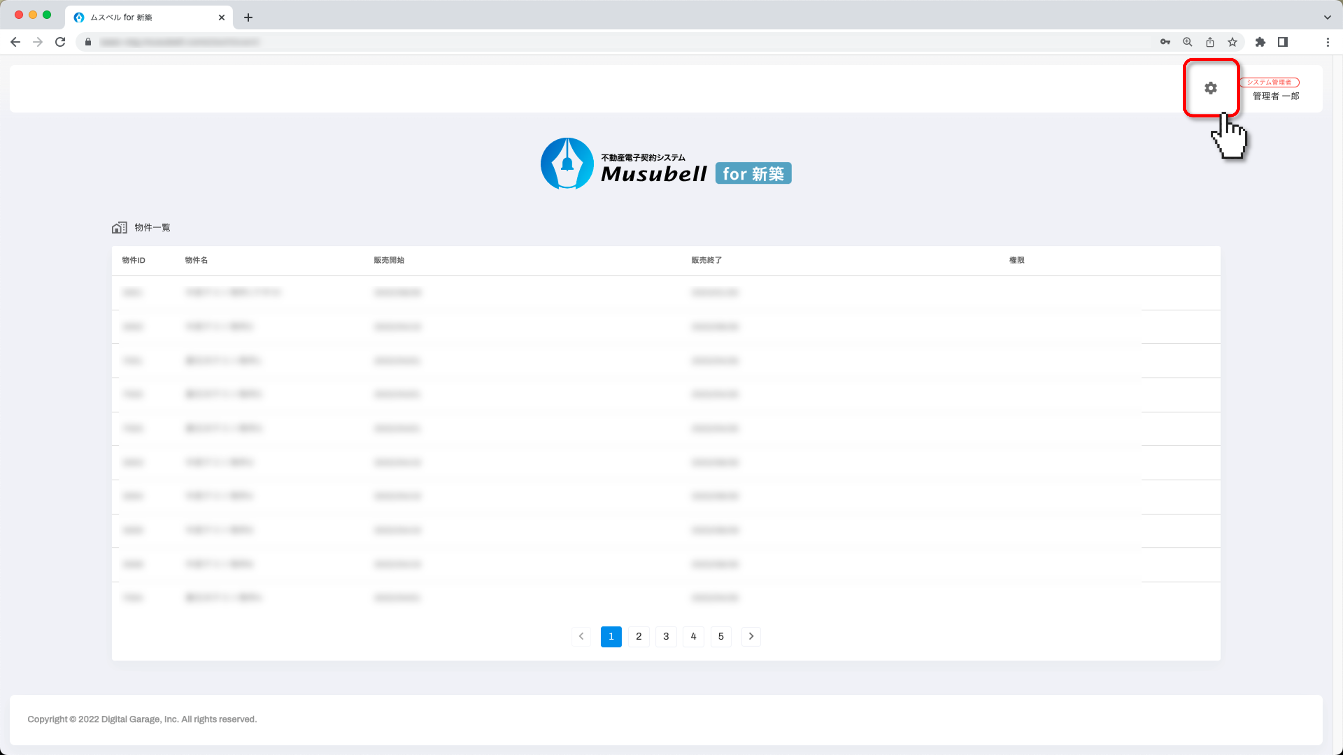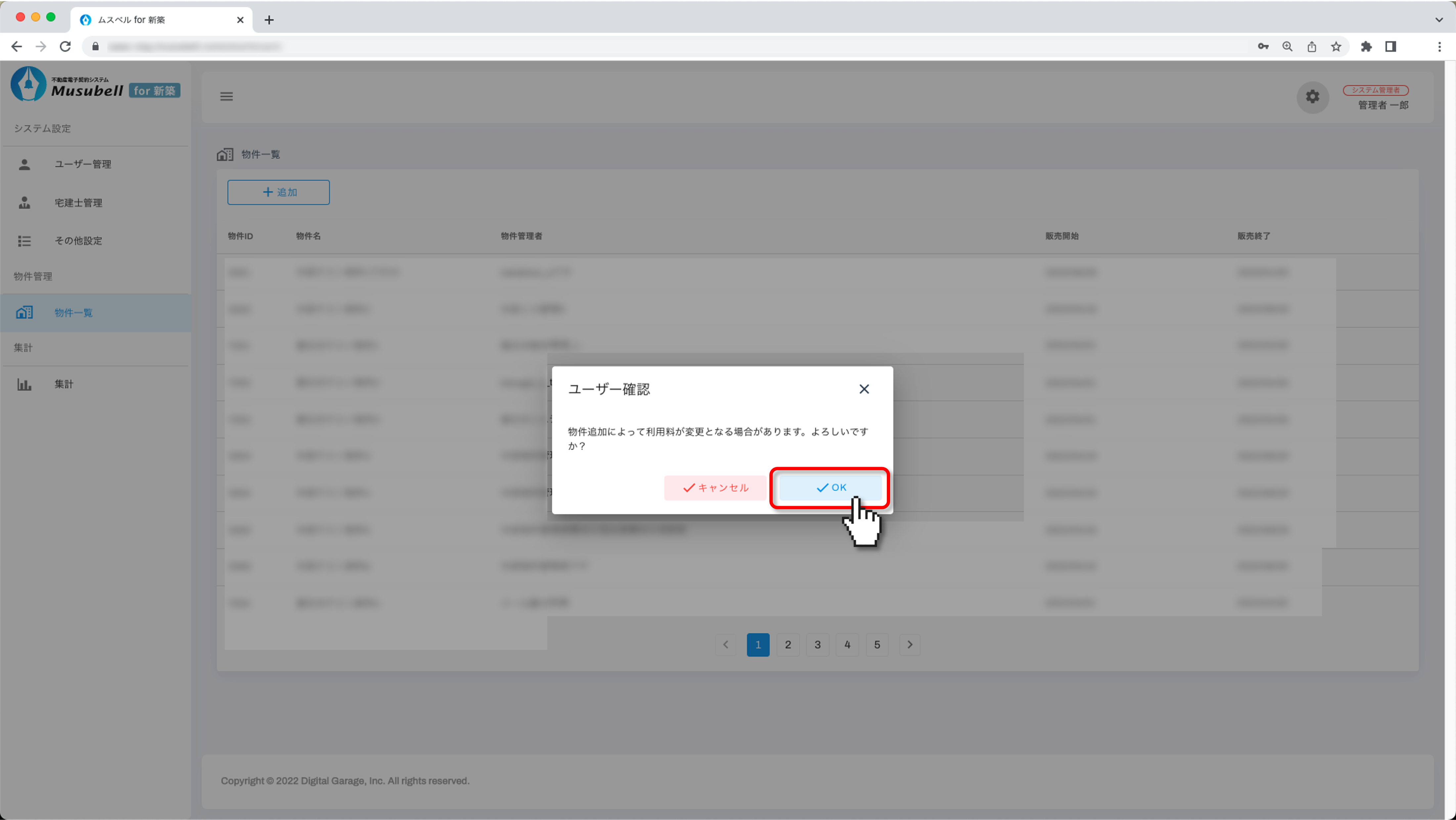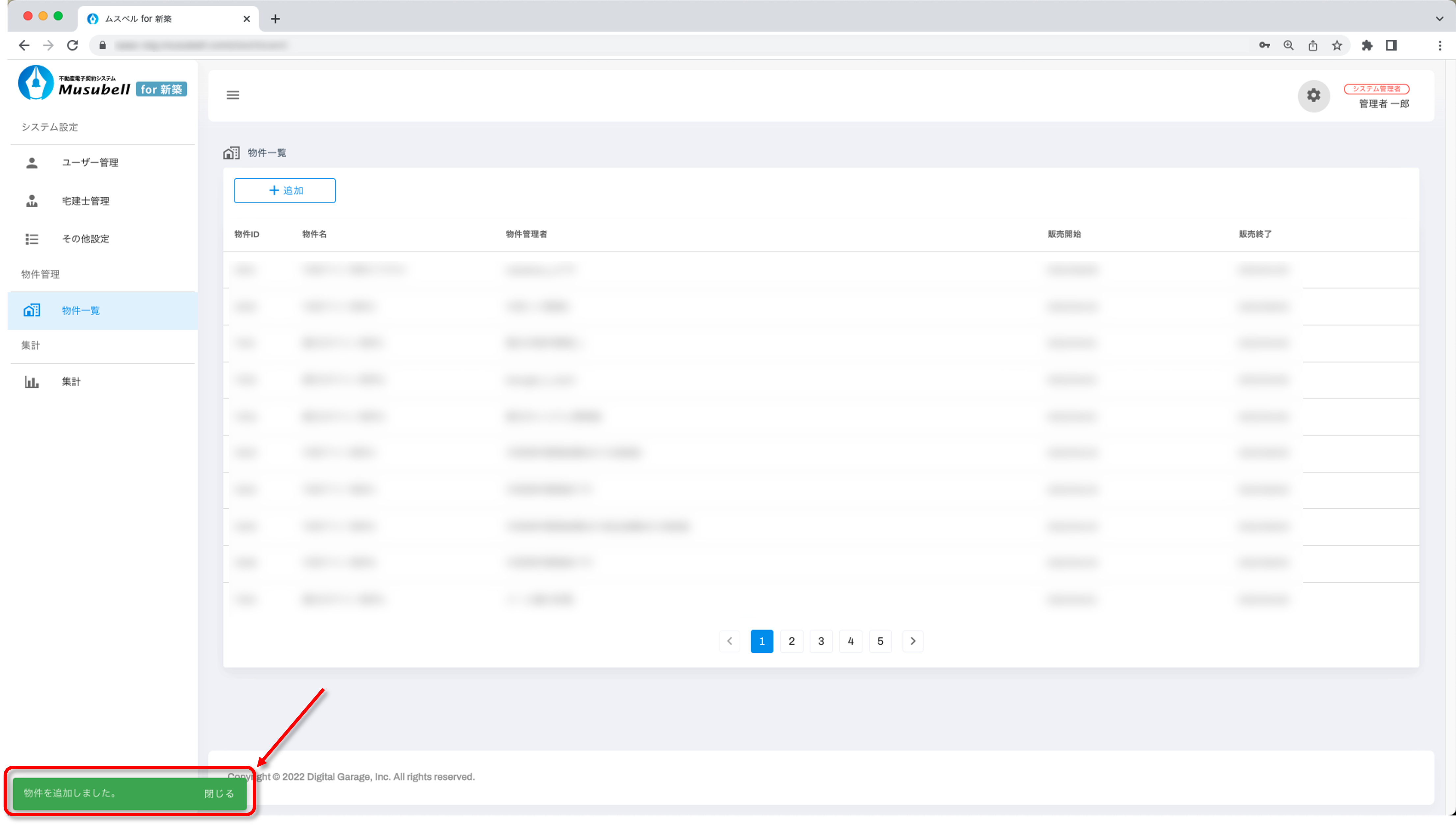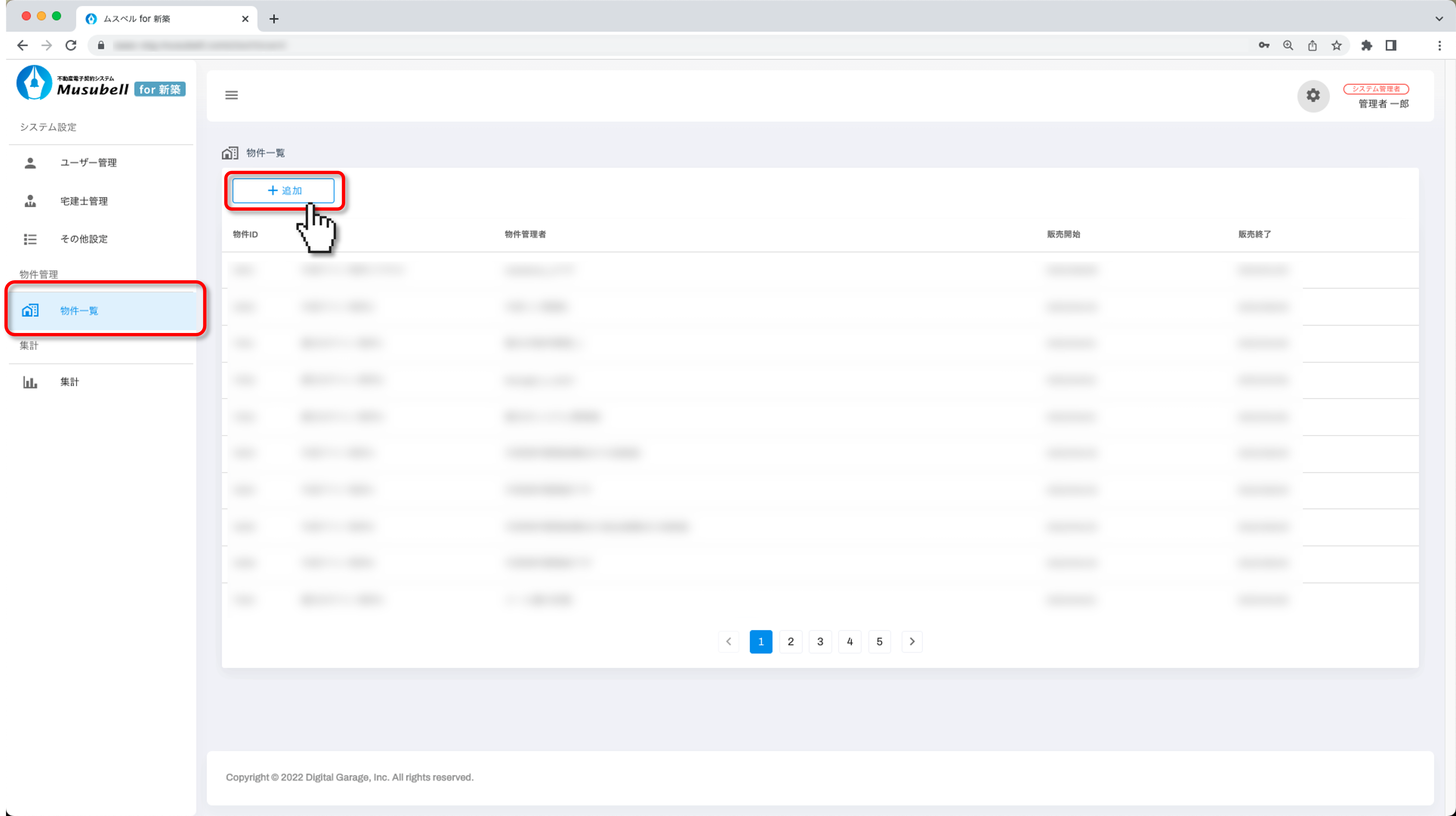 システム設定メニューの[物件一覧]を選択し、画面右上の[追加]をクリックします。