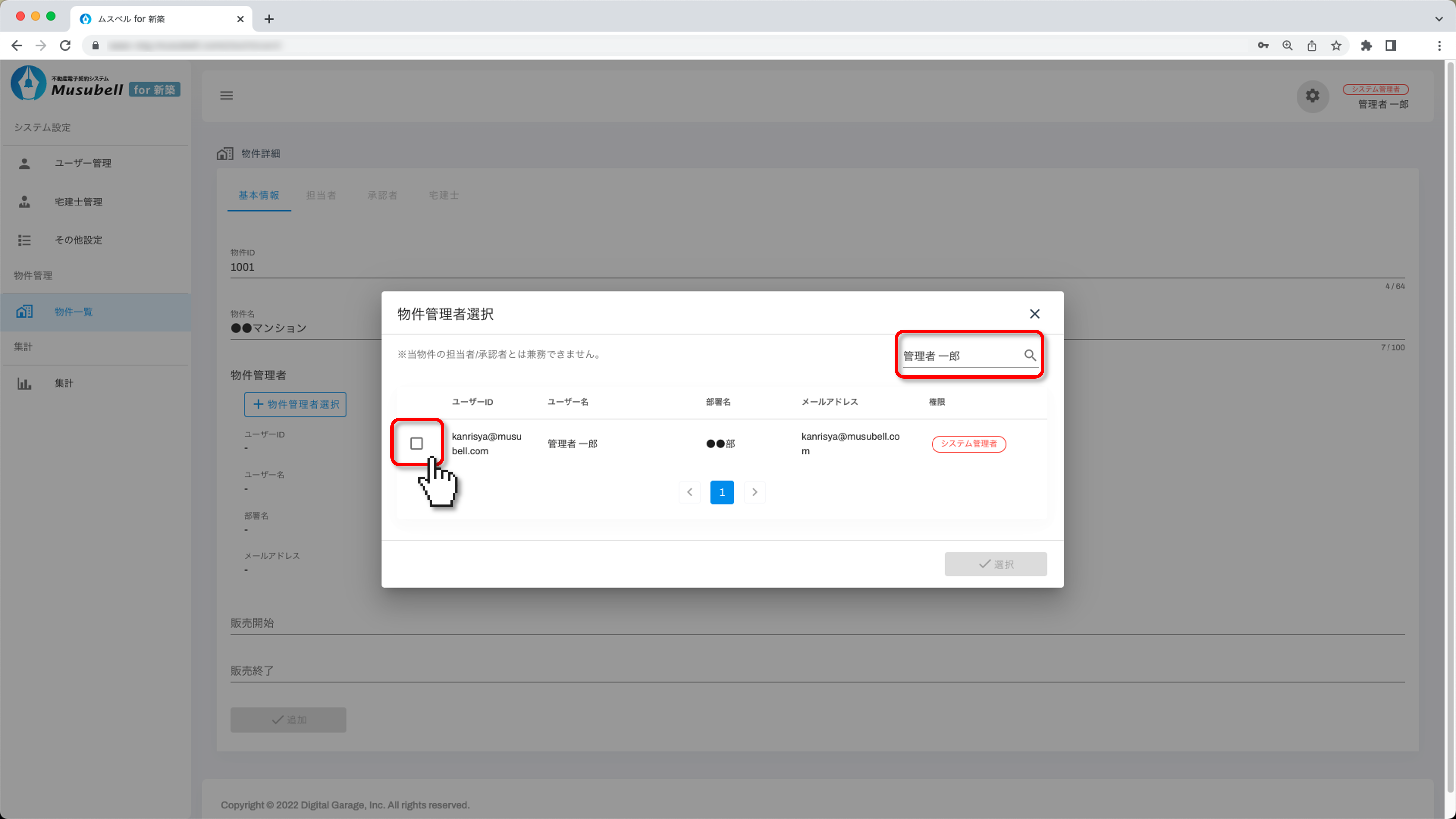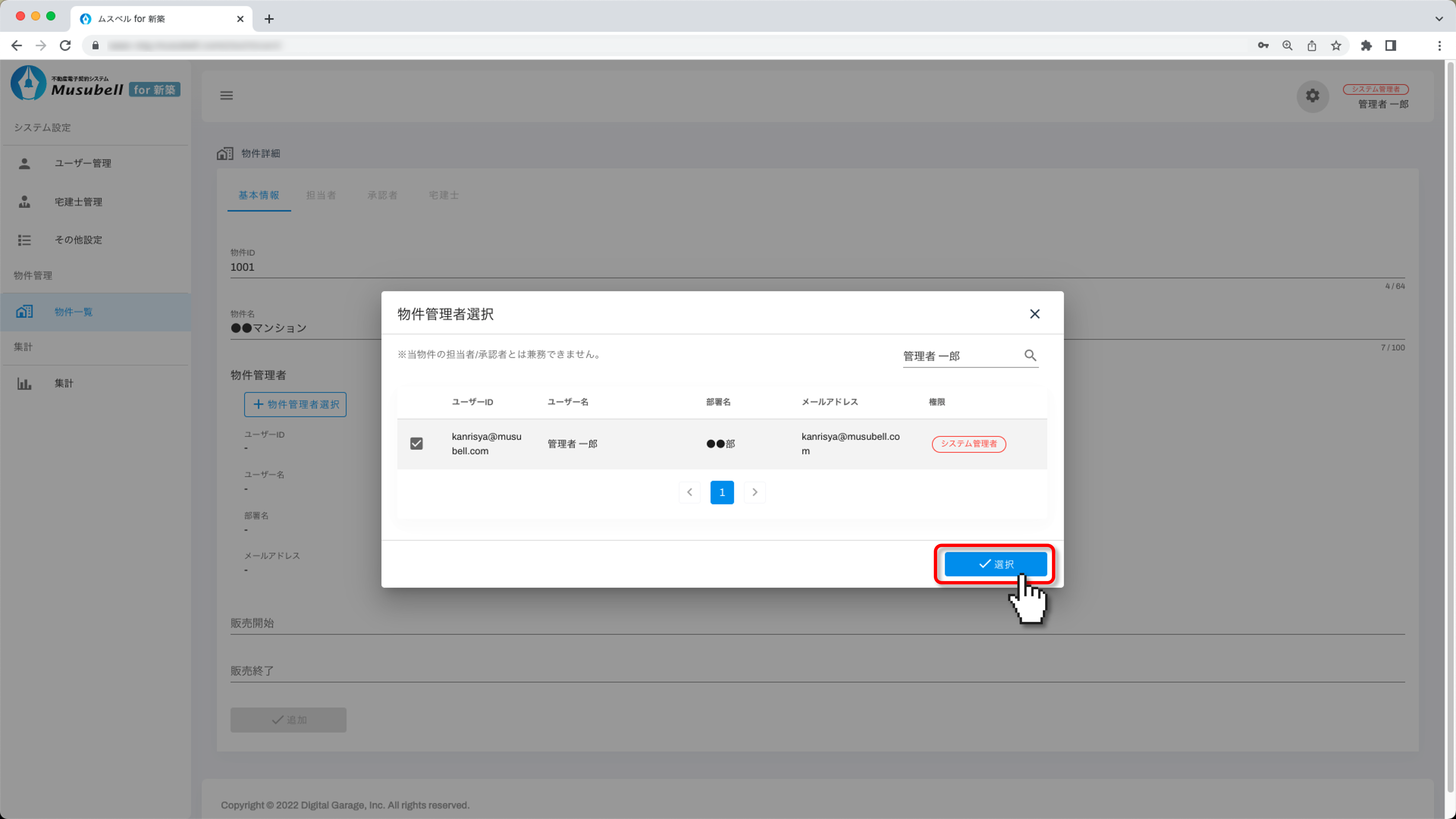 物件管理者を設定するため、[物件管理者選択]をクリックします。