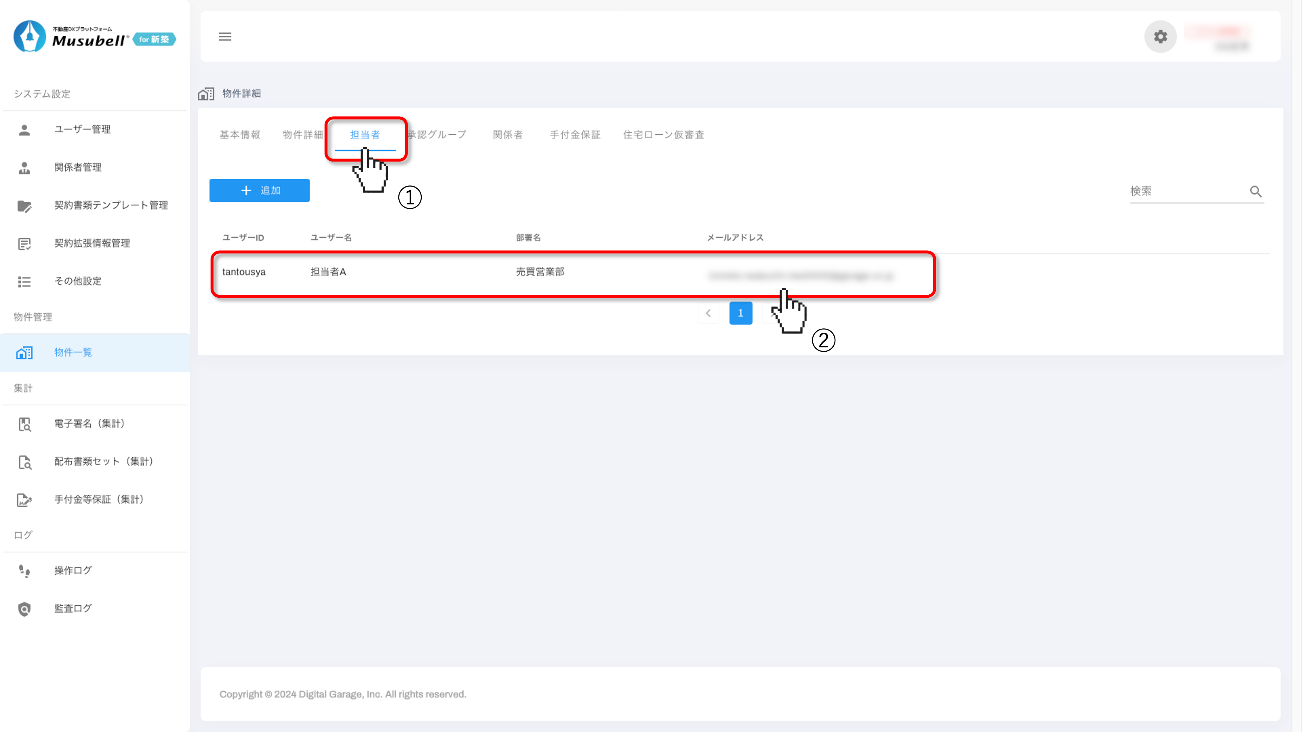 ① 新たな物件管理者となるユーザーにチェックを入れます。