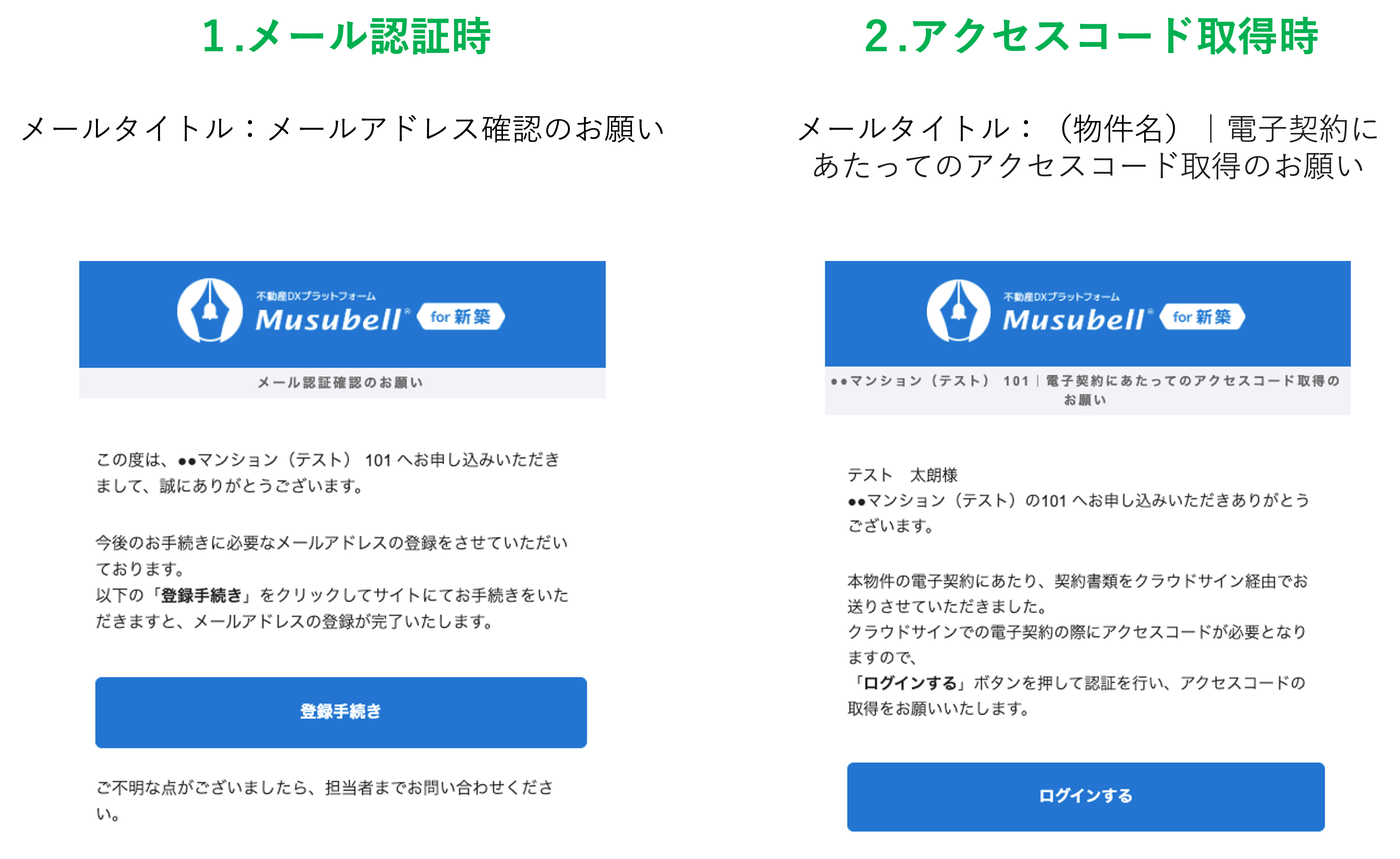 Musubellから契約者へ送られるメール(送信元:no-reply@new-const.musubell.com)は、主に以下の2種類です。