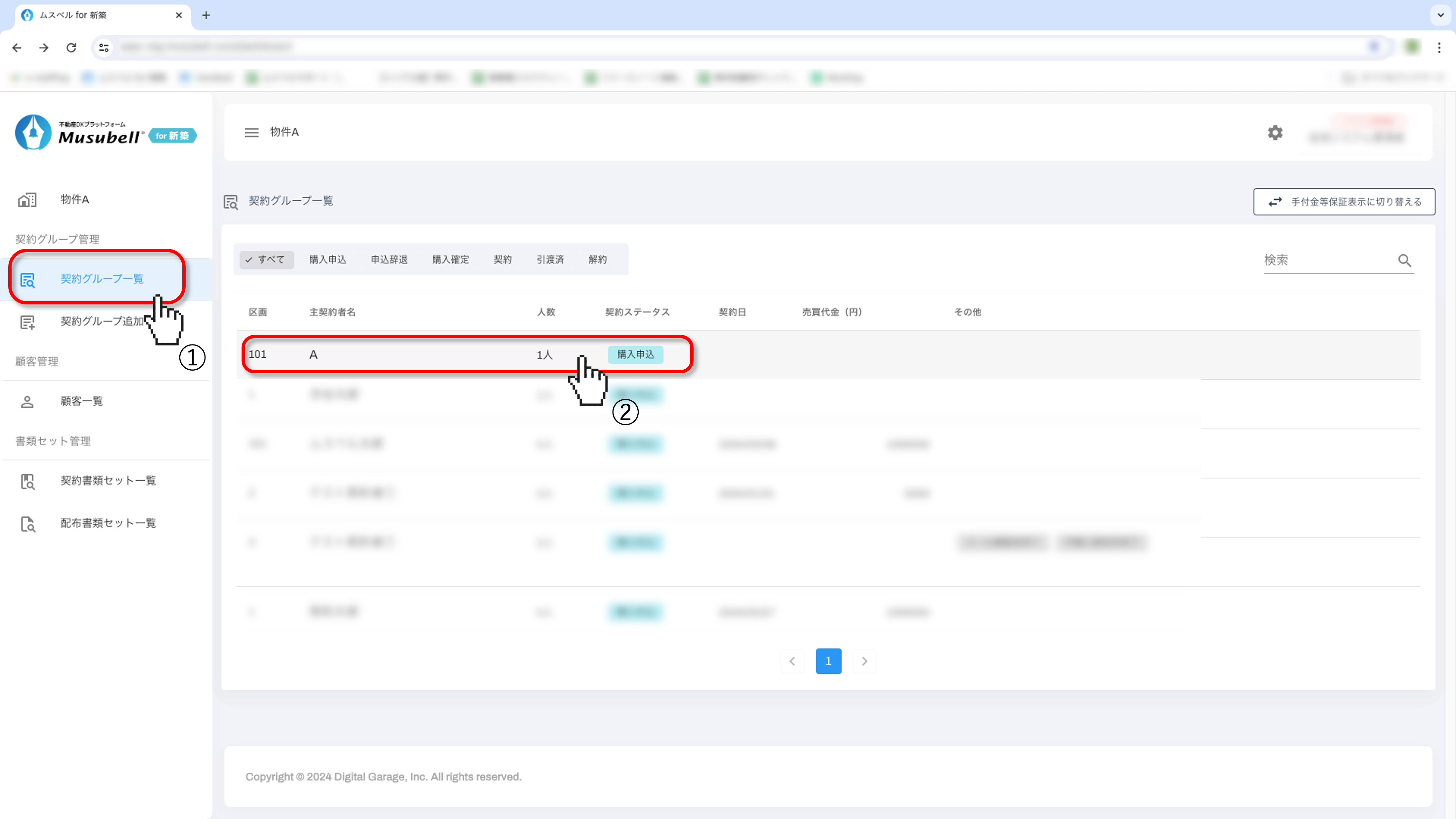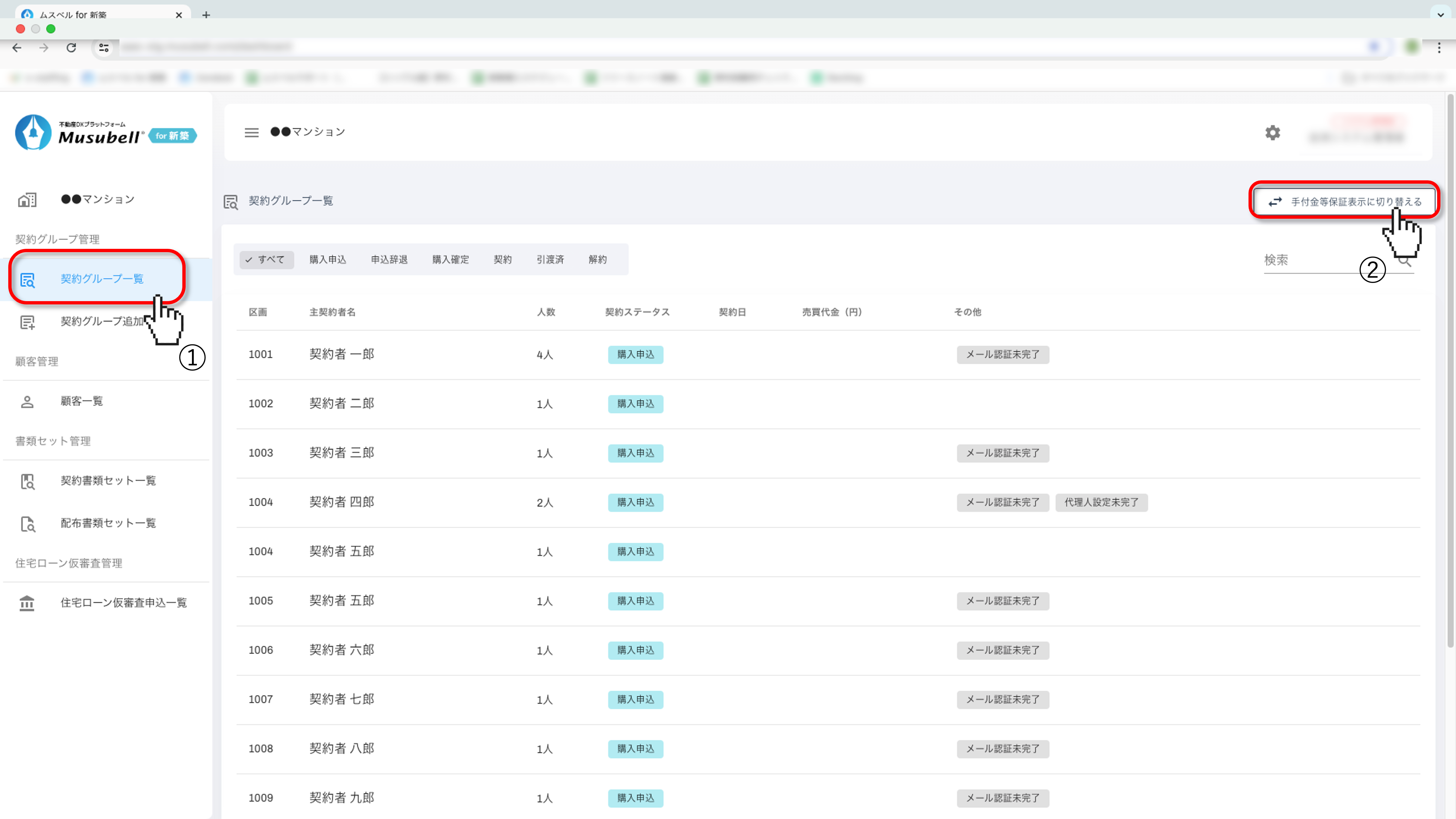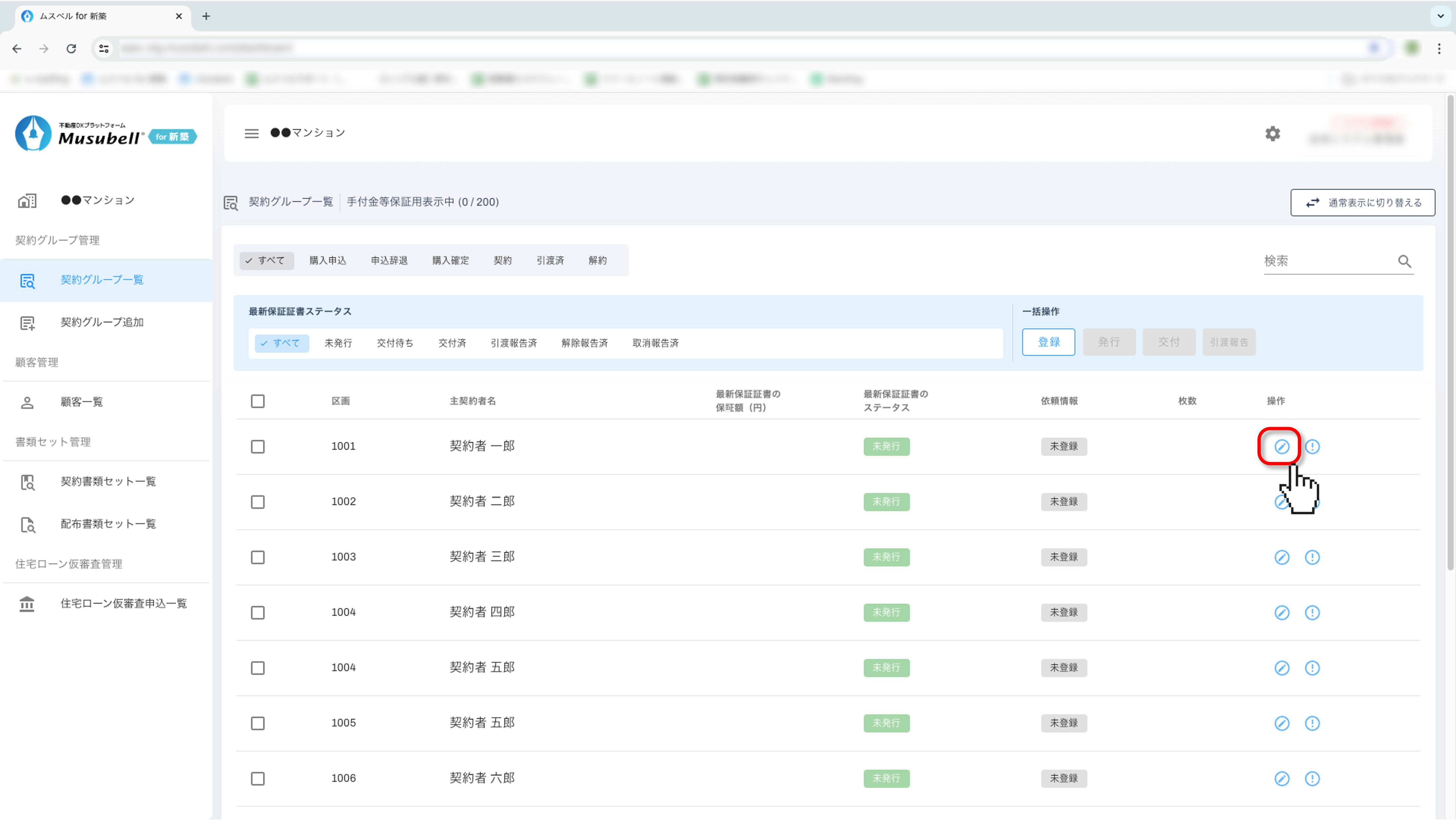 契約グループ一覧 > [手付金等保証表示に切り替える] > 該当区画の鉛筆マークをクリック
