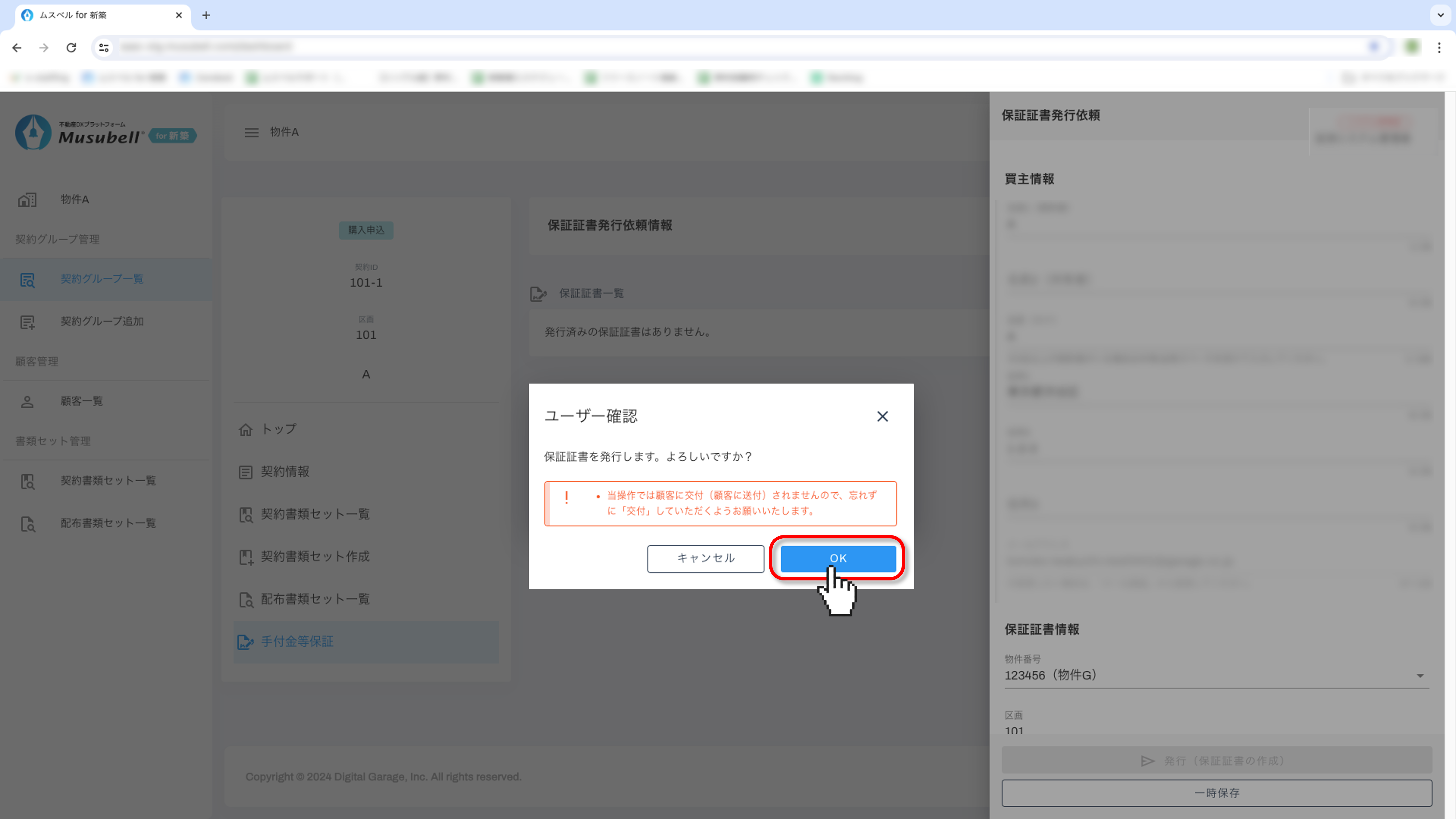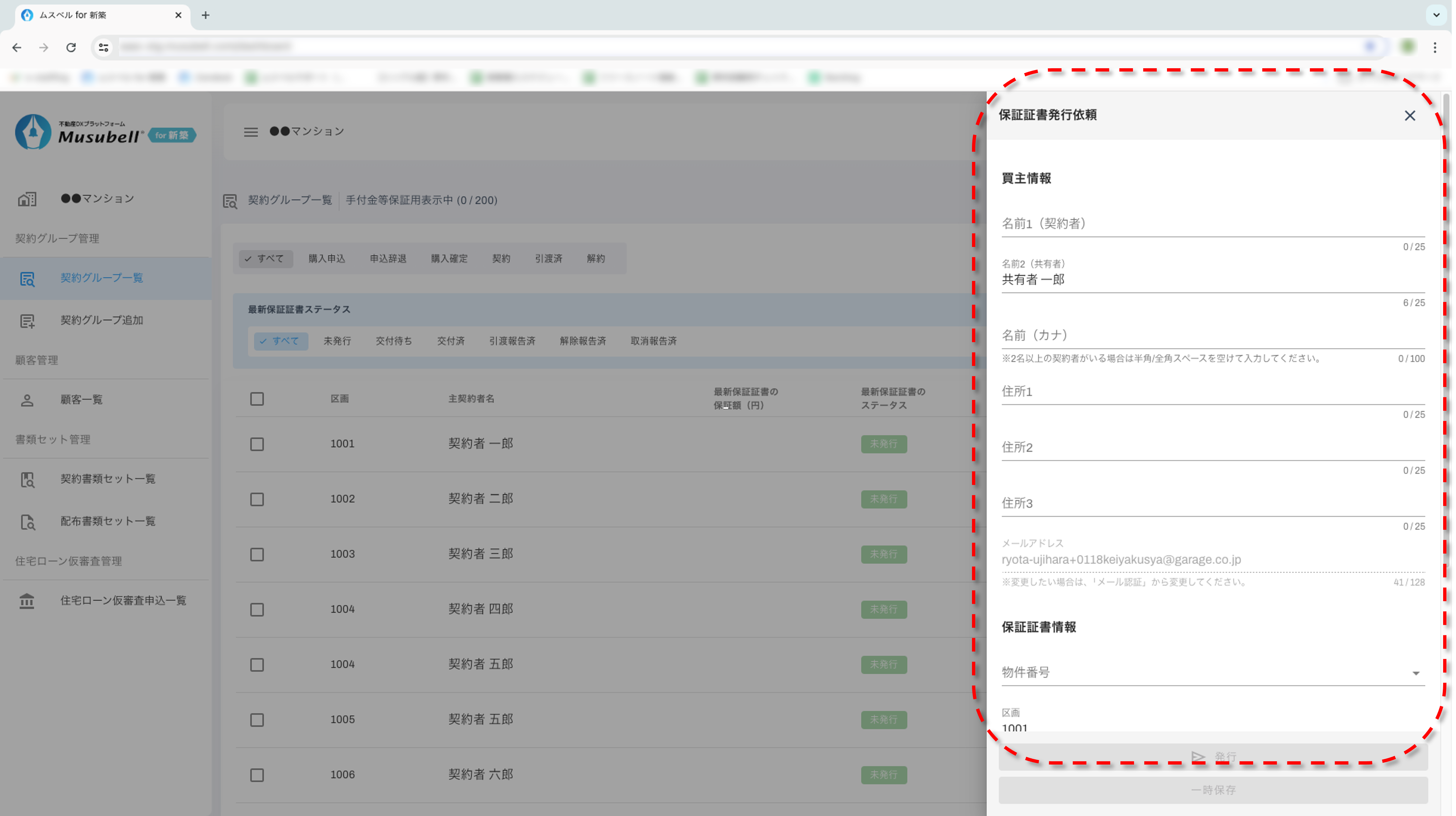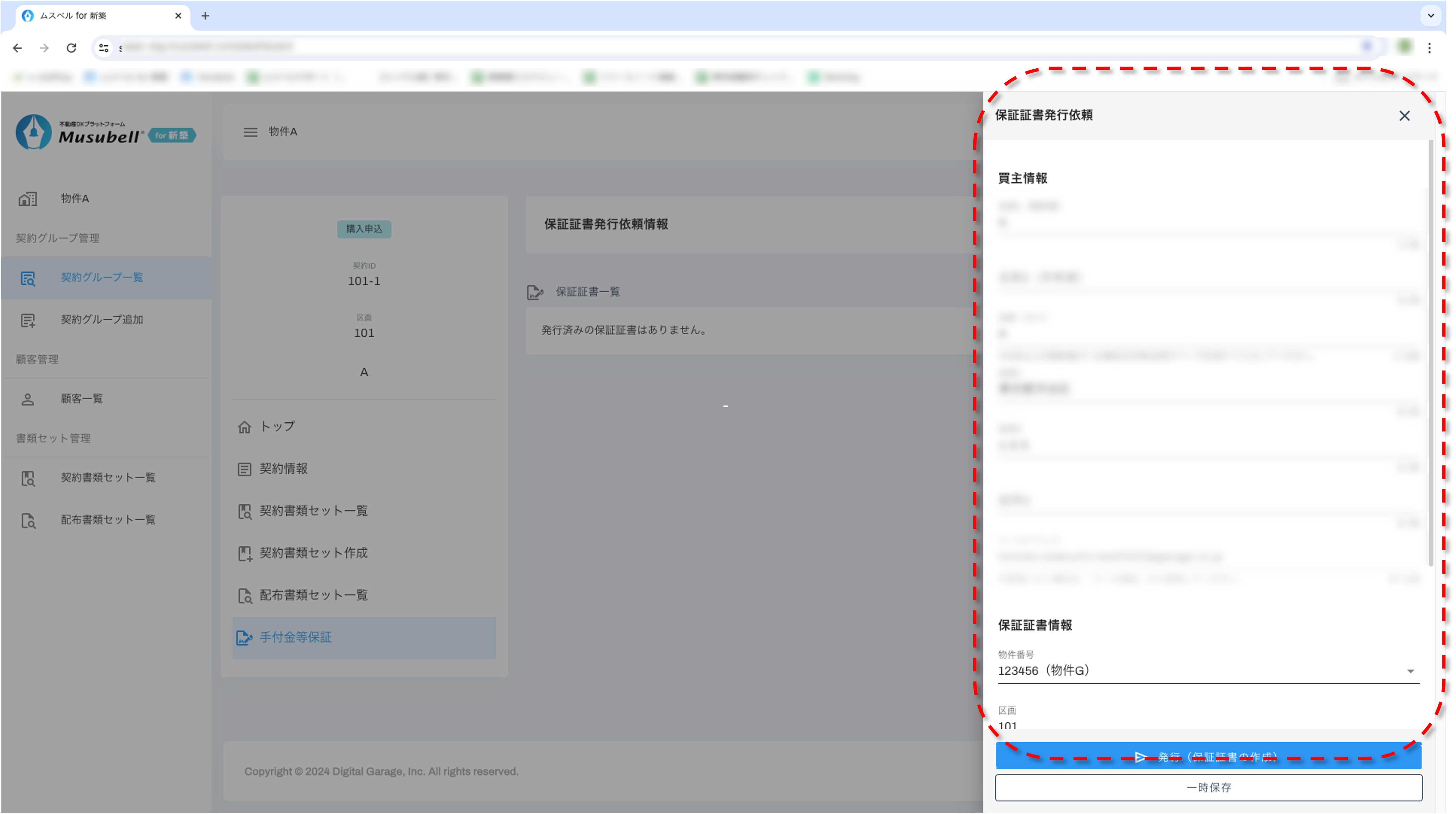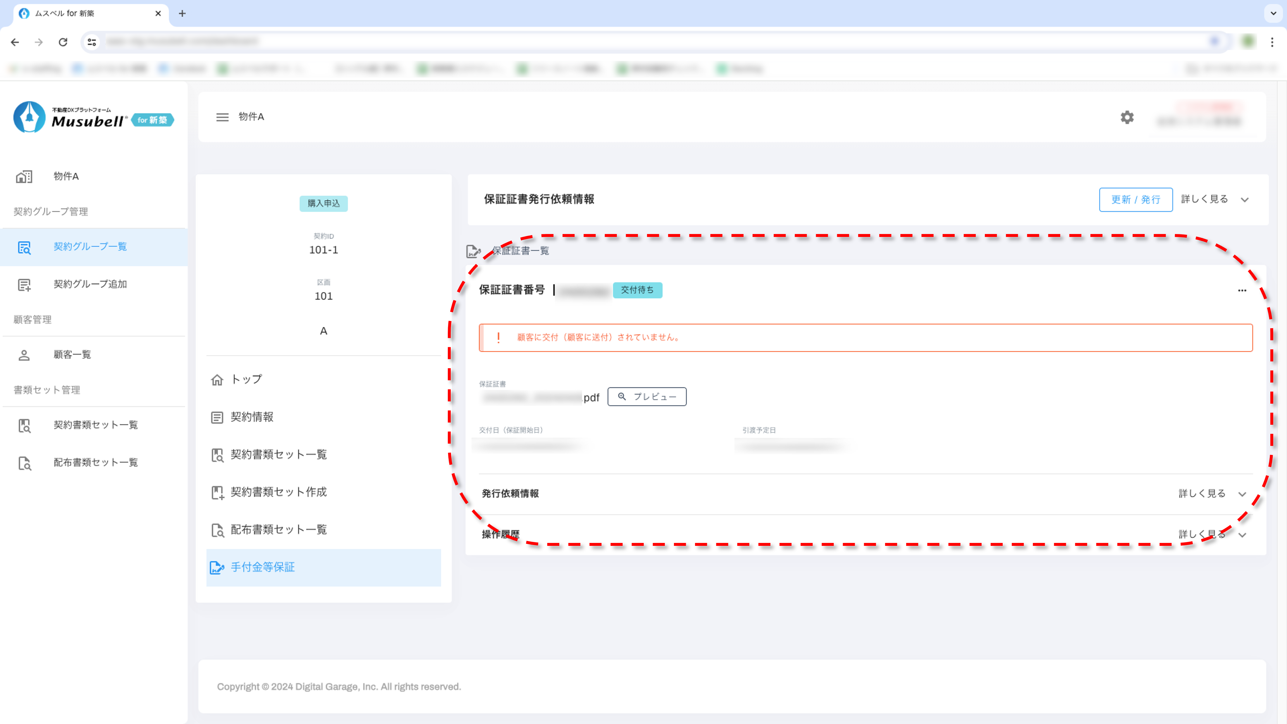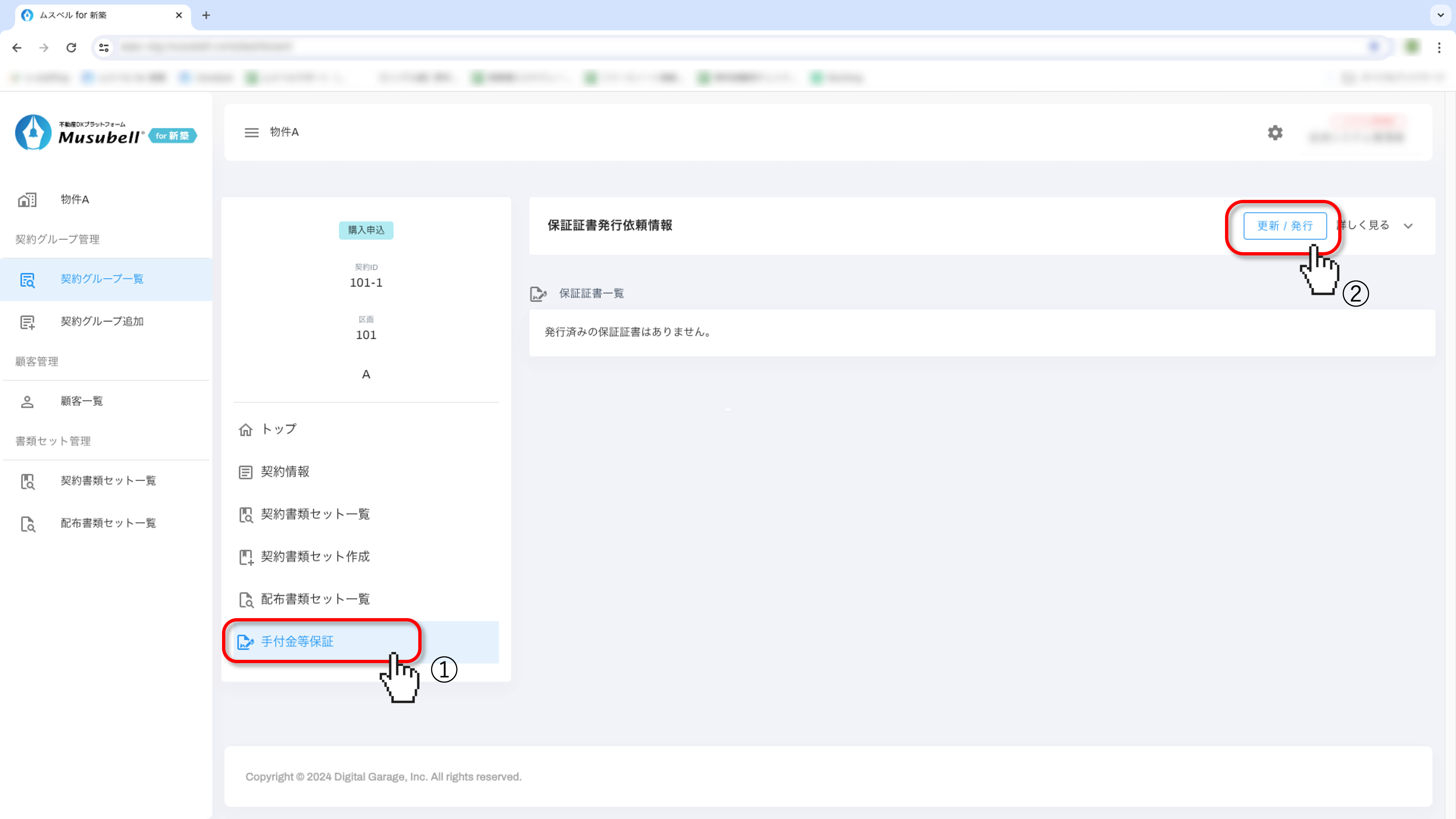 契約グループ一覧 > 該当の区画 > 「手付金等保証」タブ > [更新・発行]をクリック