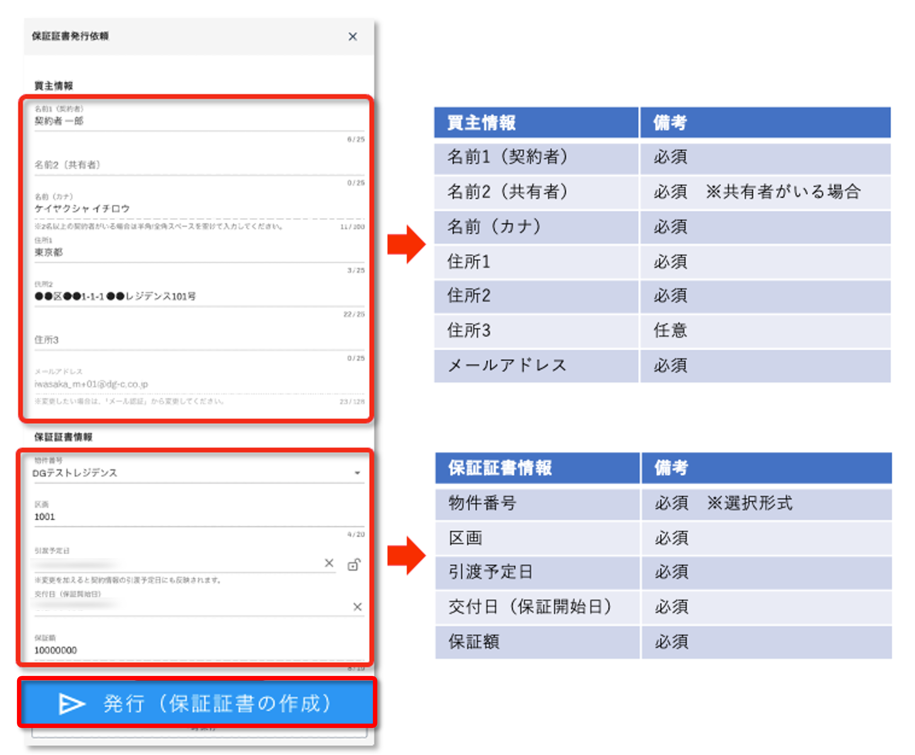 入力時の注意: *「交付日(保証開始日)」を「引渡し予定日」以後の日付に設定するとエラーになります。 *発行日の2週間後より未来の日付を「交付日」に設定することはできません。 (例:発行日が7/12の場合、交付日に設定できるのは7/26まで) |