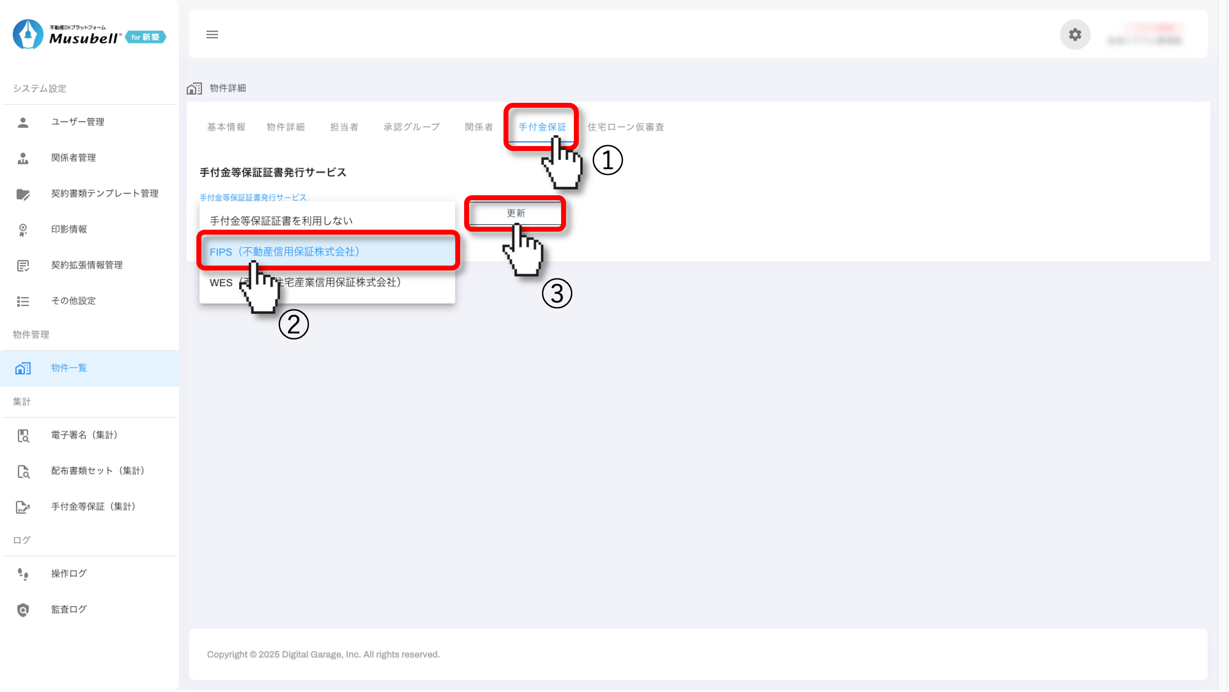 ①[手付金保証]をクリックします。