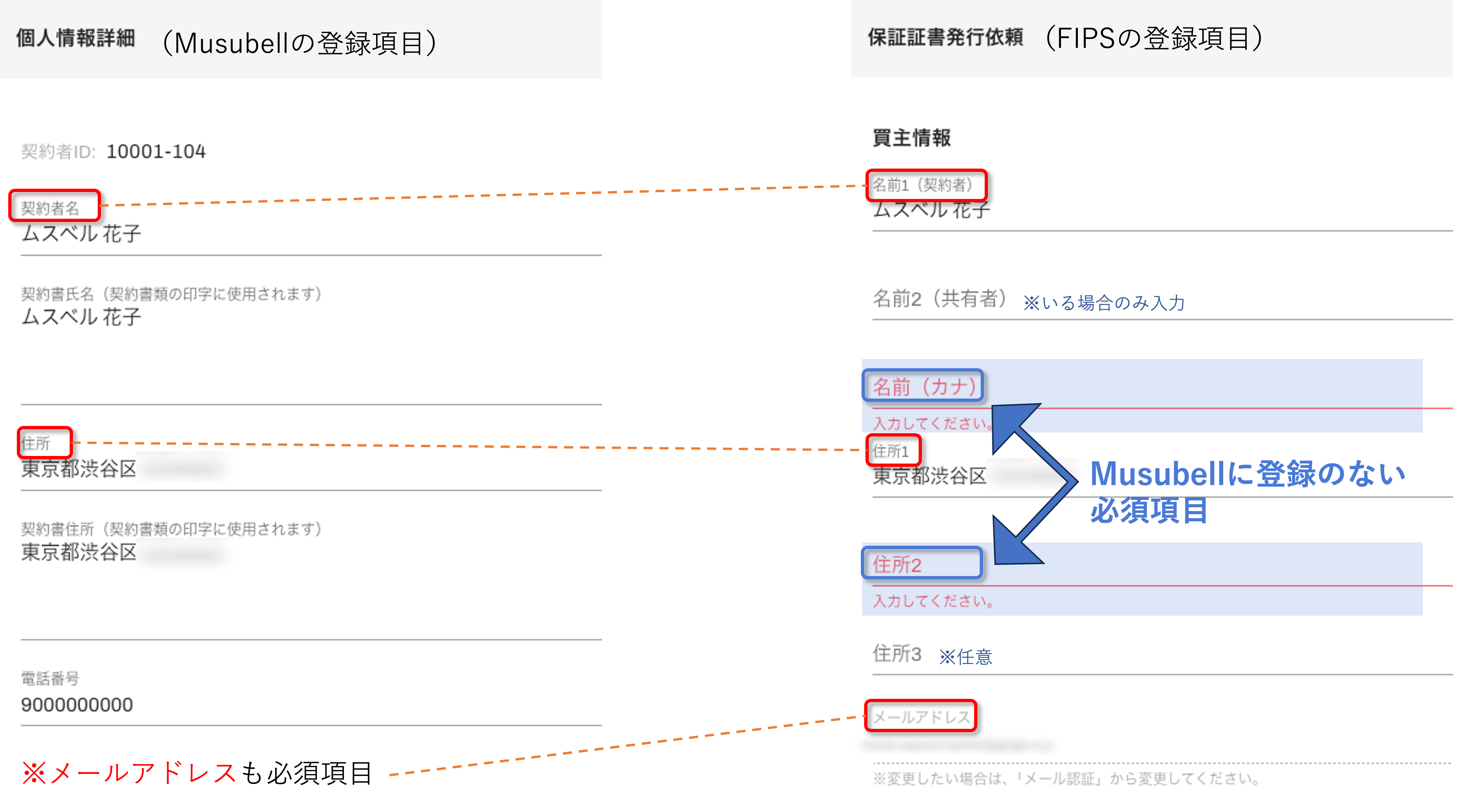 MusubellとFIPS/WESを連携させる際、FIPS/WES側の必須項目である顧客情報の【住所2】と【名前(カナ)】が反映されません。