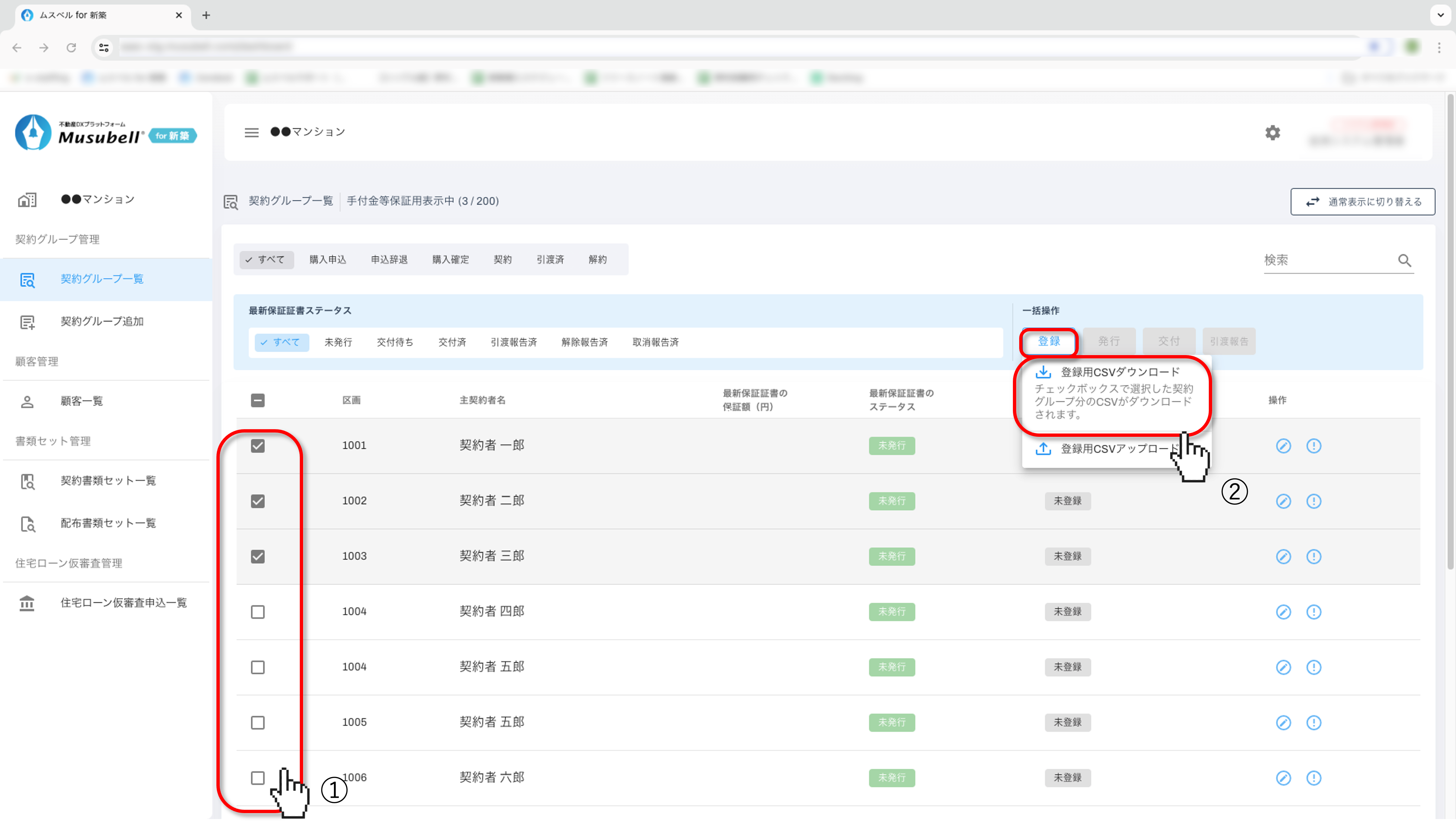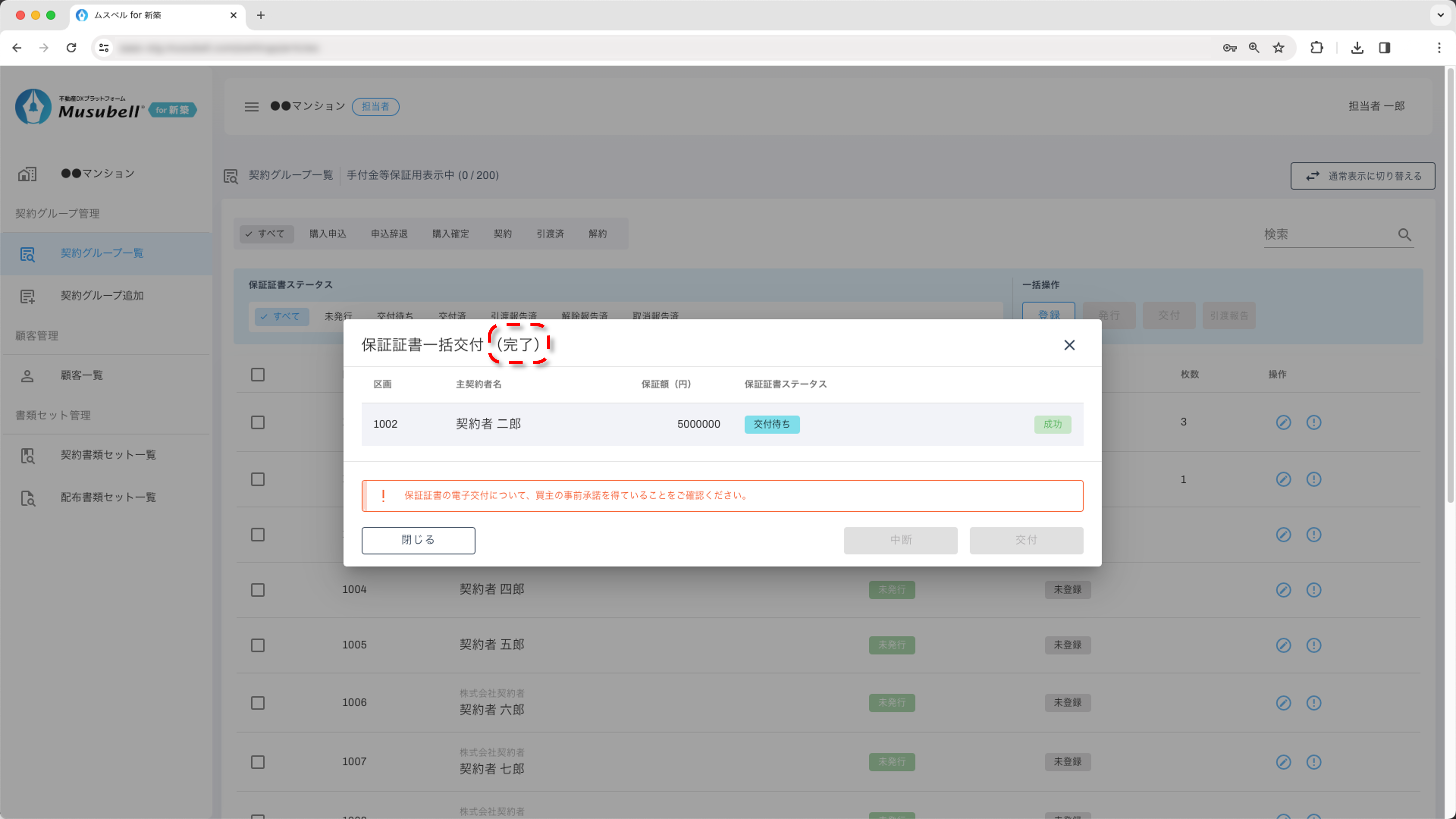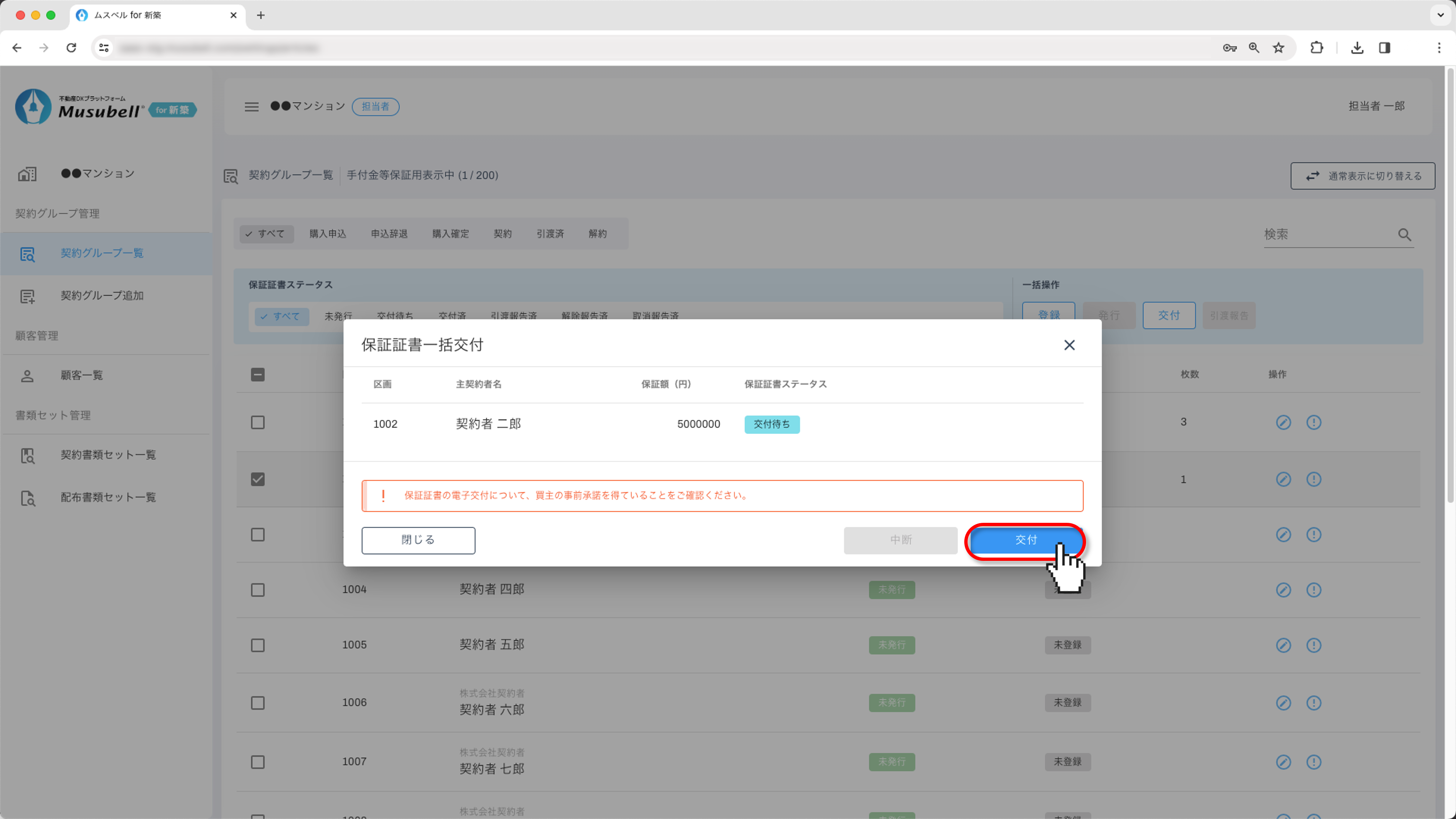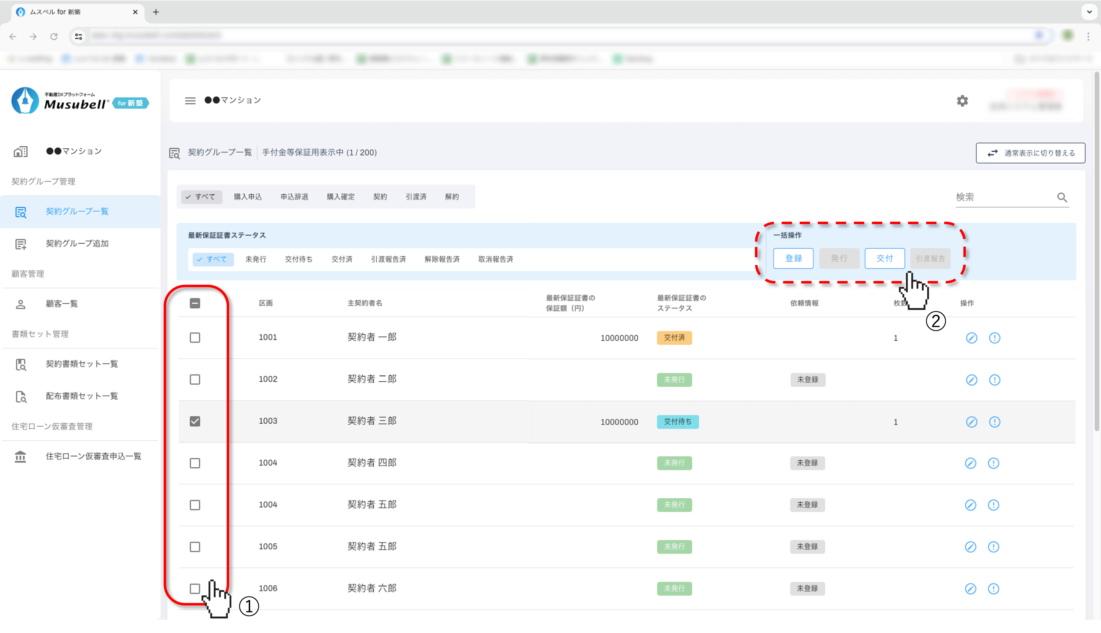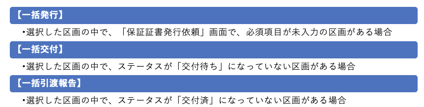 - ※ 同一区画内で保証証書を複数枚発行している区画については「発行」「交付」「引渡報告」すべての一括操作ができないため、個別での操作をお願いいたします。