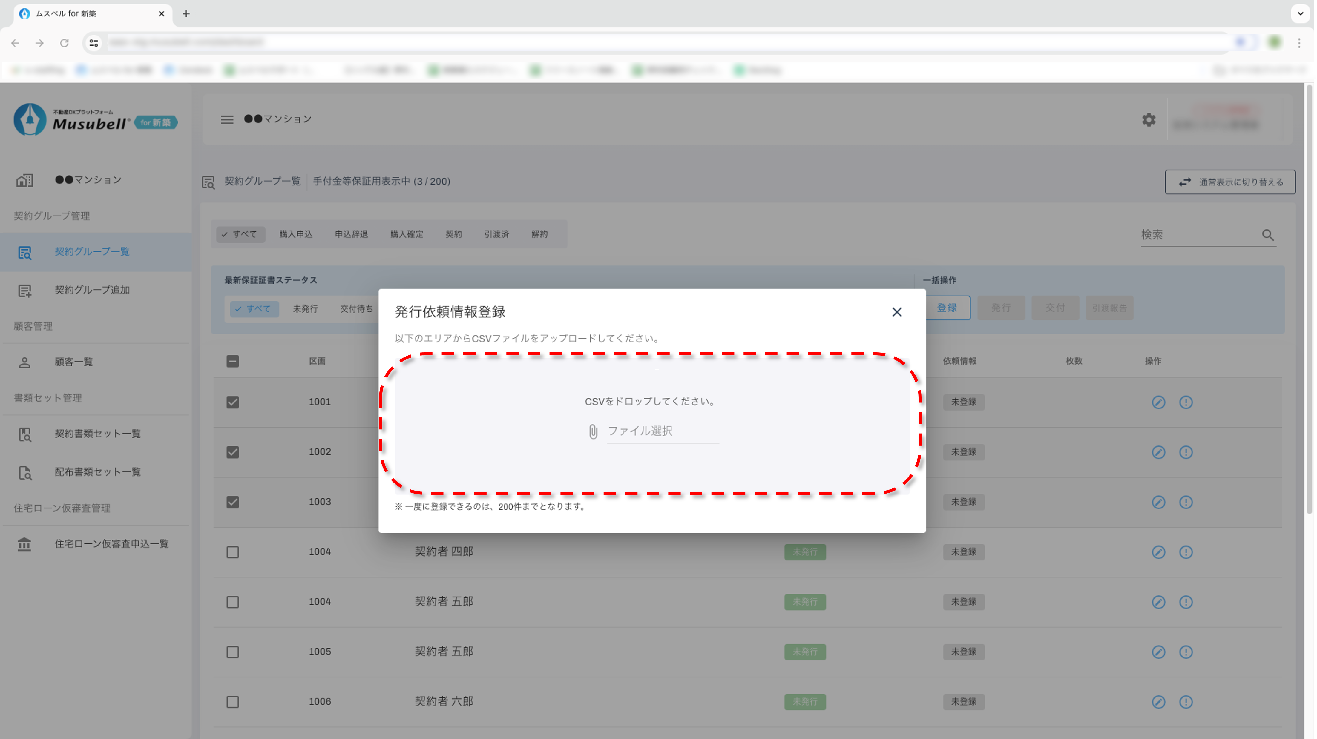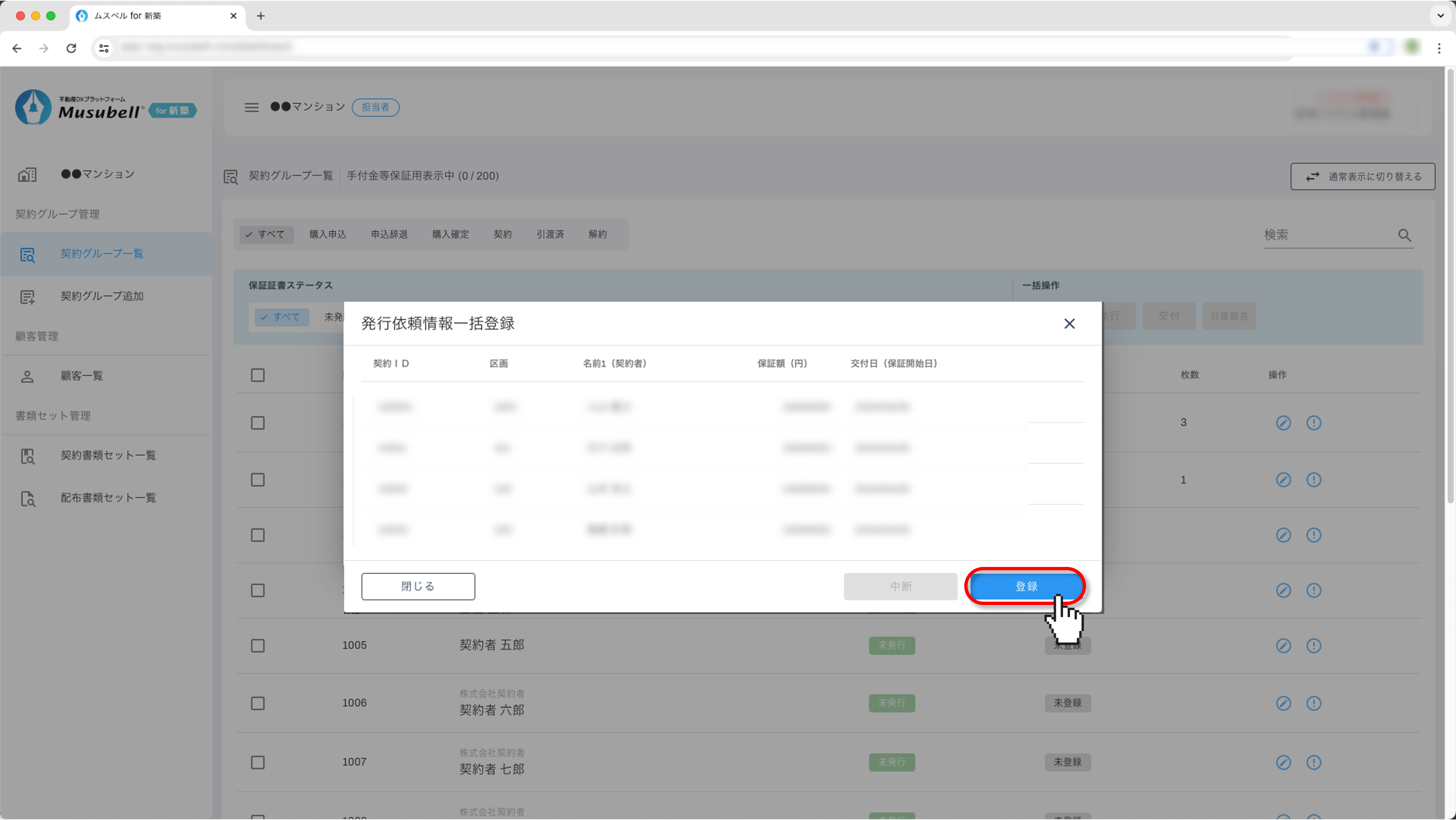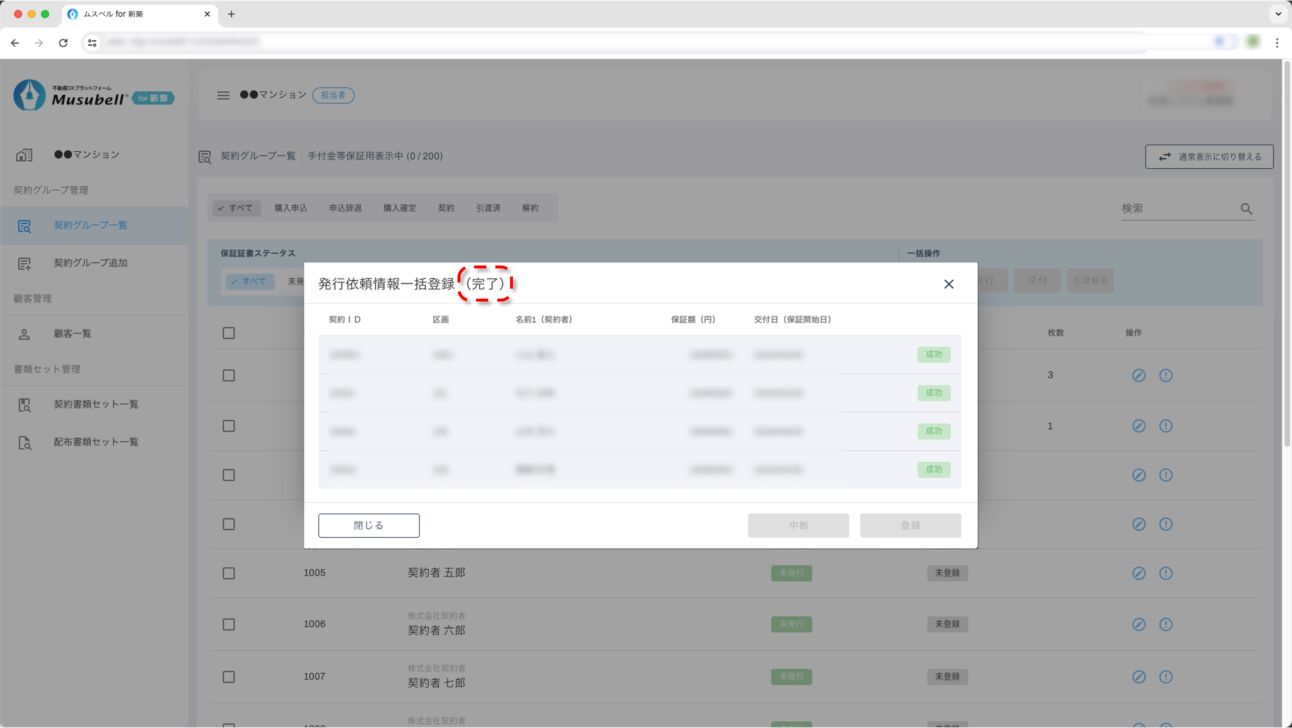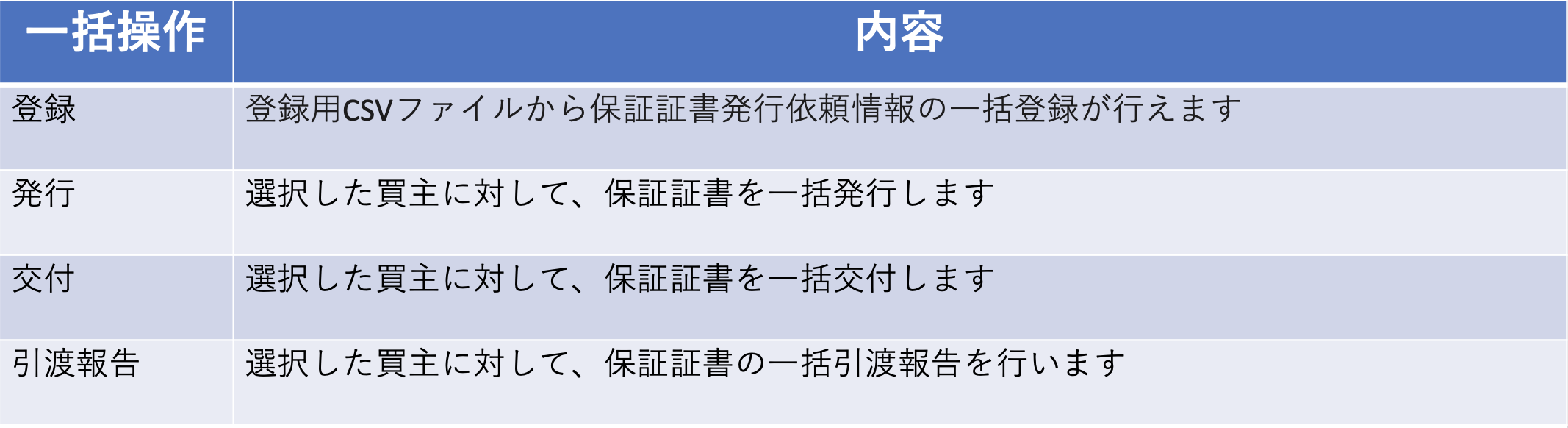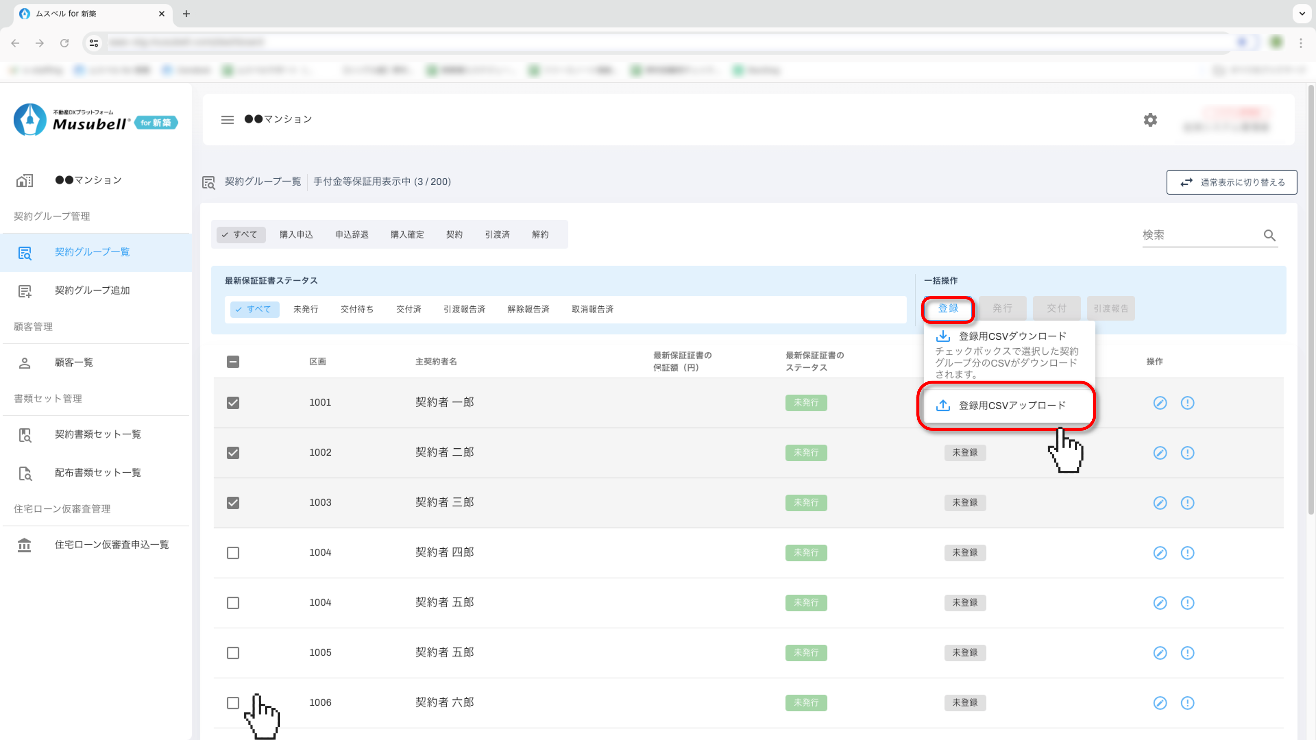 - ※ 同一区画内で保証証書を複数枚発行している区画については「発行」「交付」「引渡報告」すべての一括操作ができないため、個別での操作をお願いいたします。