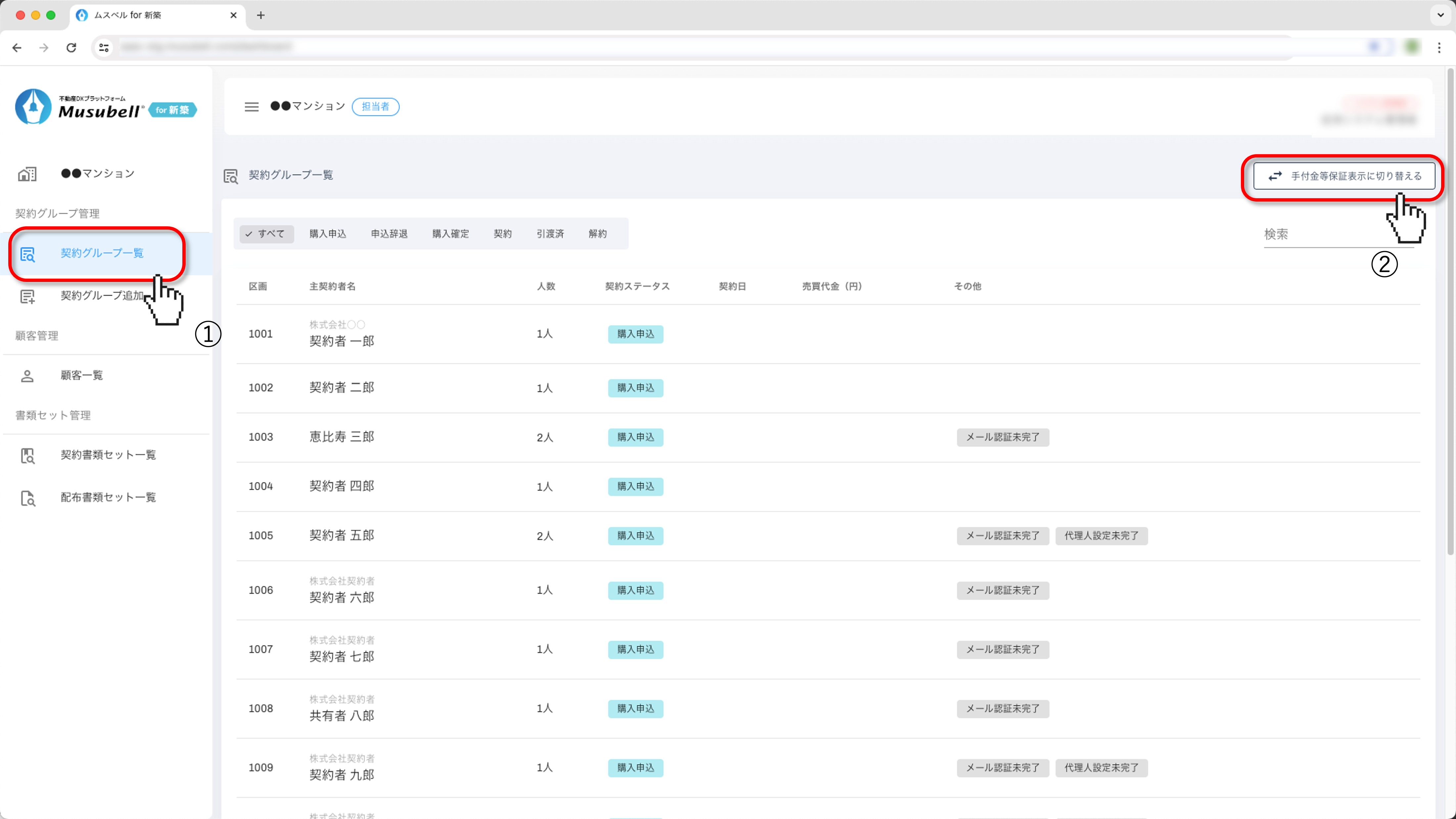 ②[手付金等保証表示に切り替える]をクリックします。