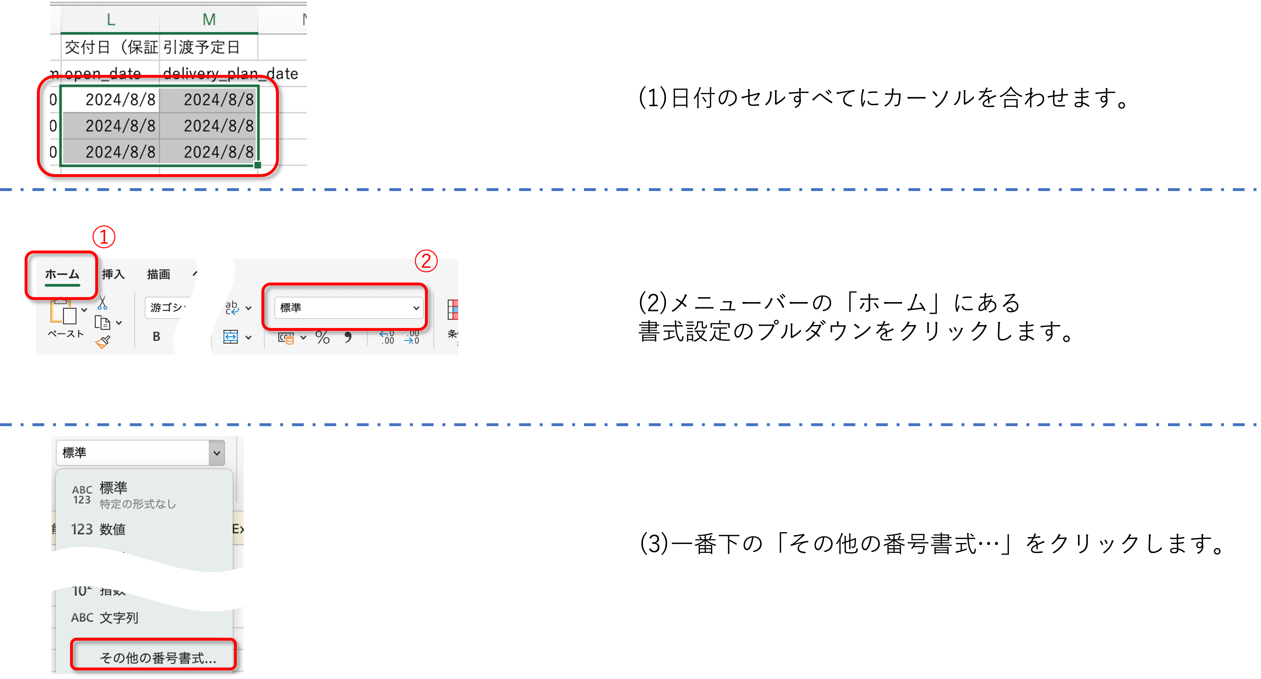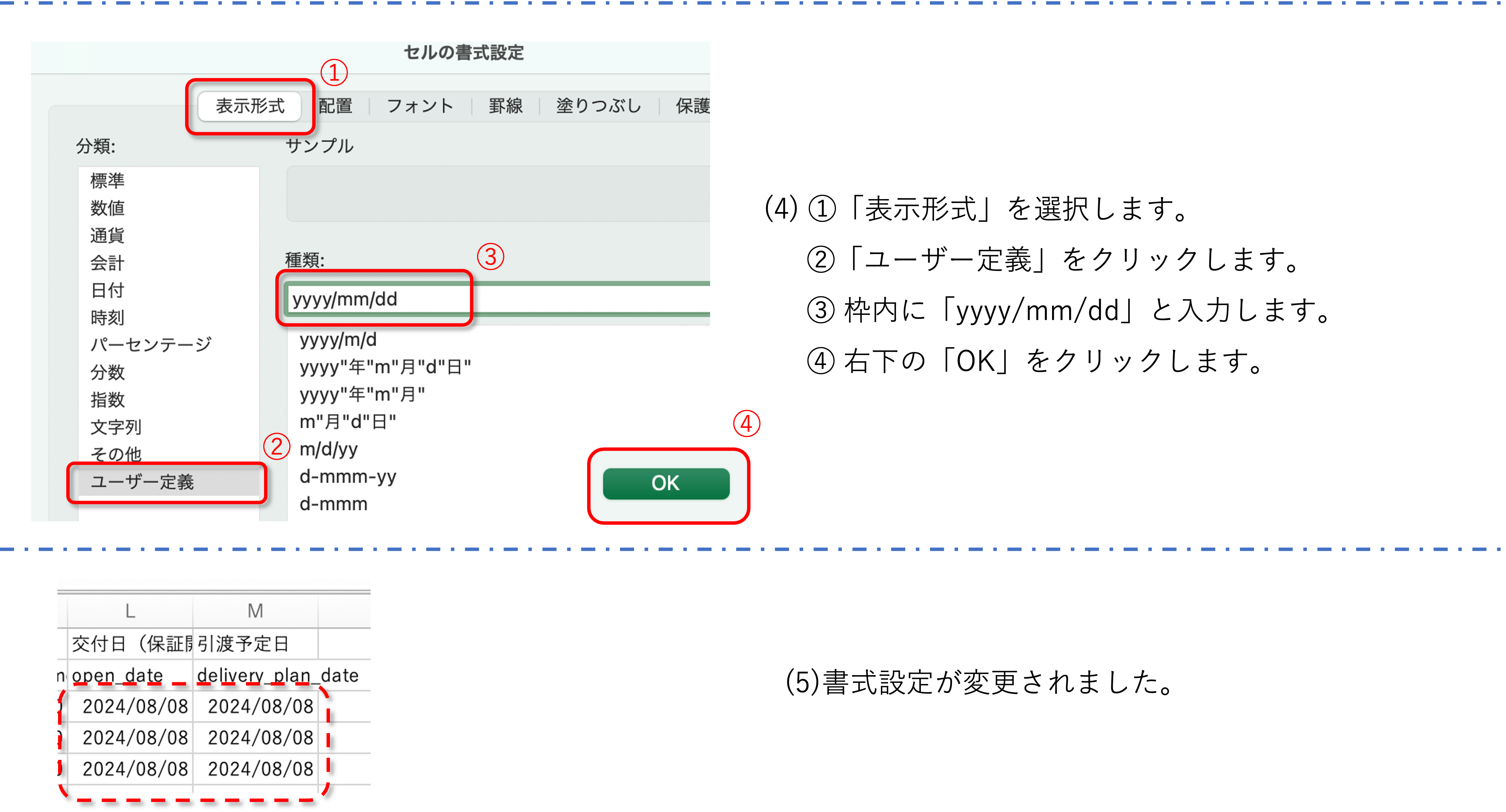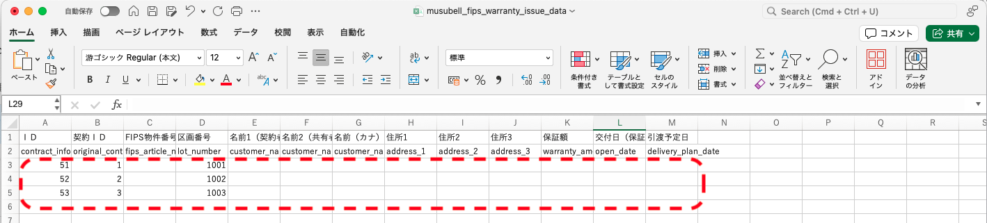 CSVデータの「交付日(保証開始日)」「引渡予定日」の書式設定を変更する必要があります。